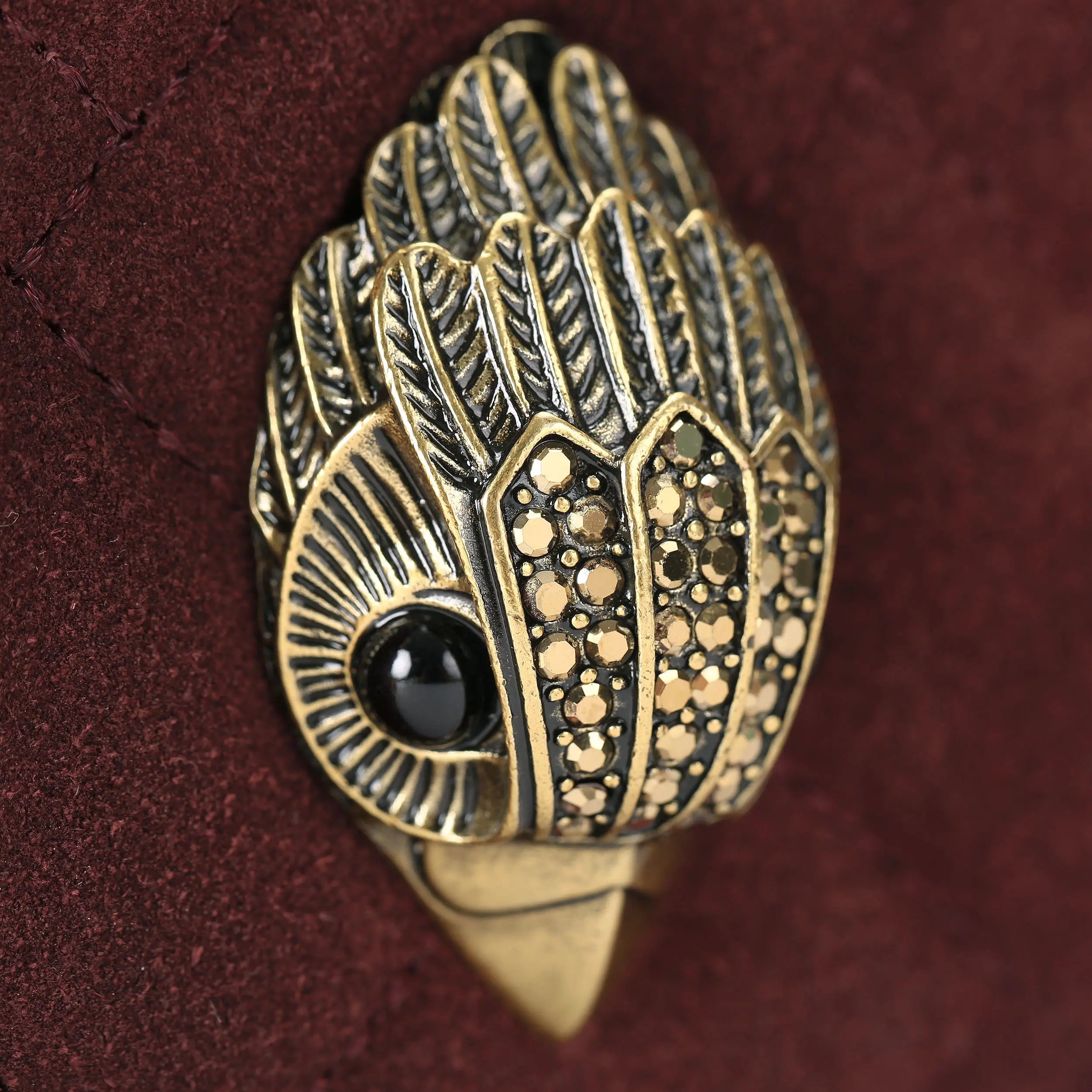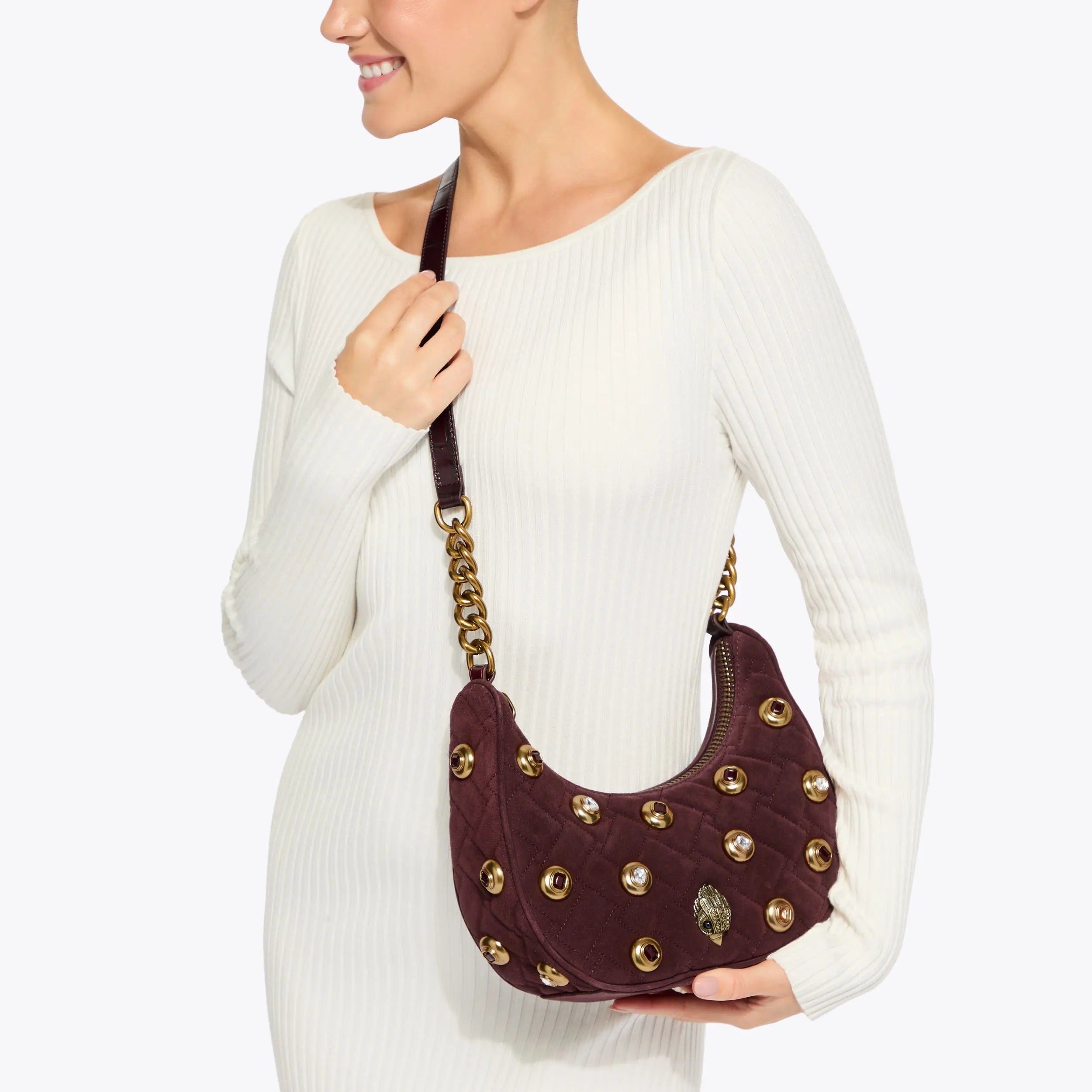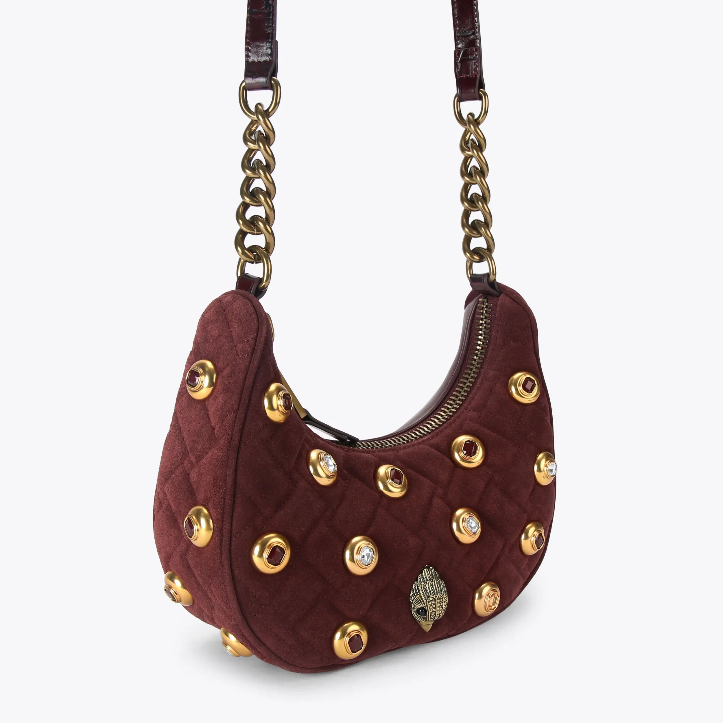 This Small Kensington Hobo Gem purse arrives in a wine suede leather with overstitch quilting. There are brushed gold studs on the form that are accented with crystals. There is an antiqued brass eagle head on the front of the bag.