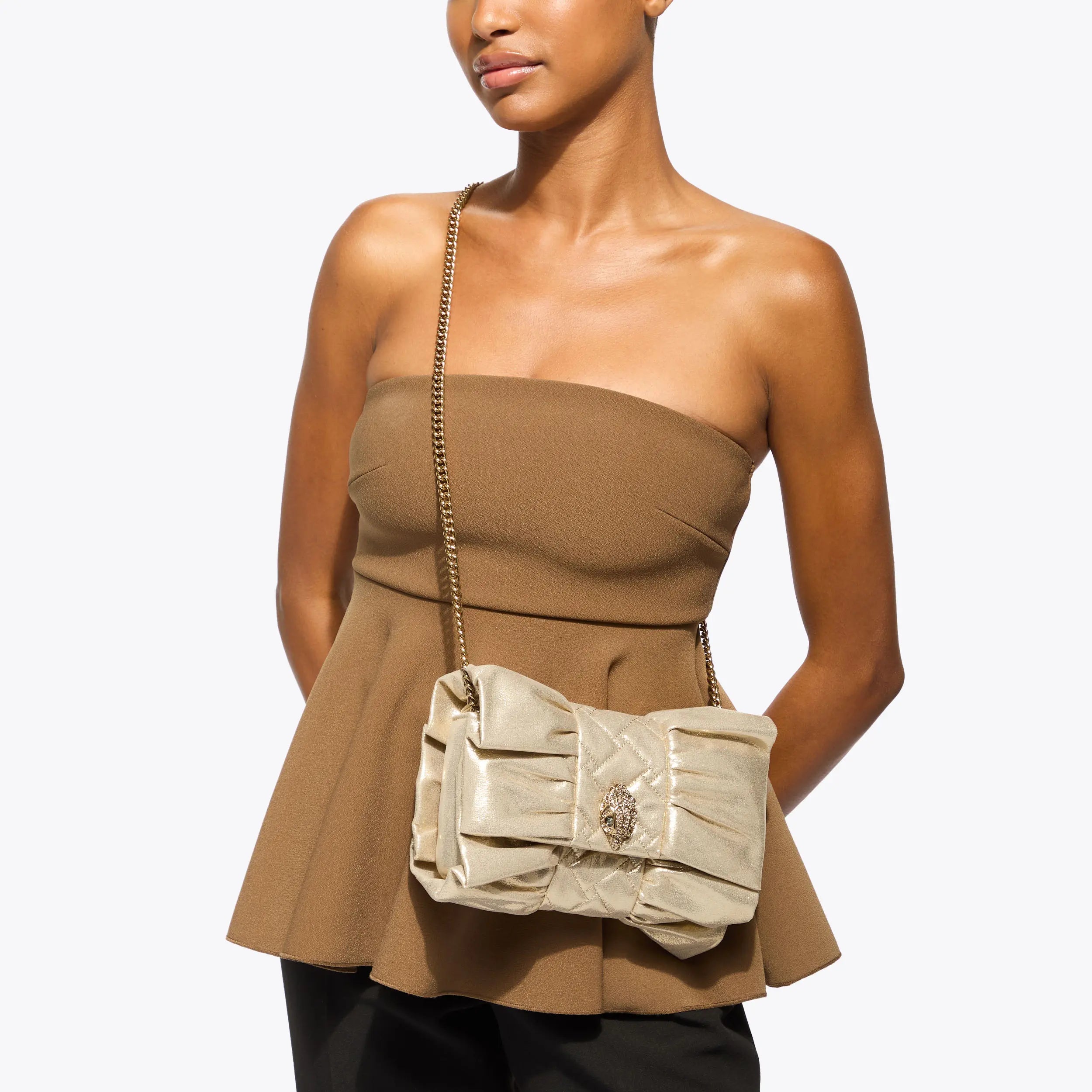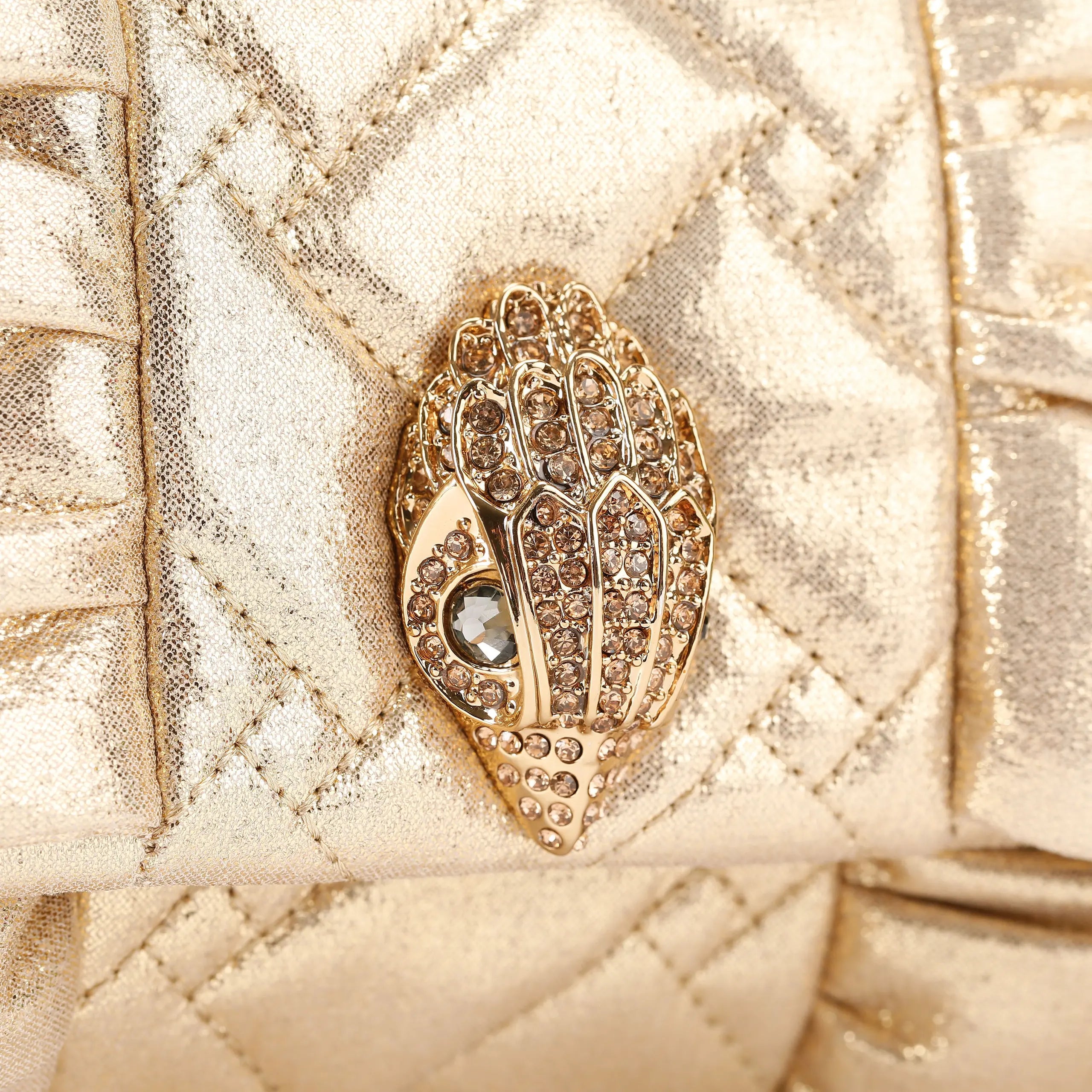 This Mini Kensington Bow Purse is crafted from a god metallic fabric. There are two frilly bow details at the sides and overstitch quilting detail at the centre. There is a gold eagle head with crystals sat in the centre of the purse.