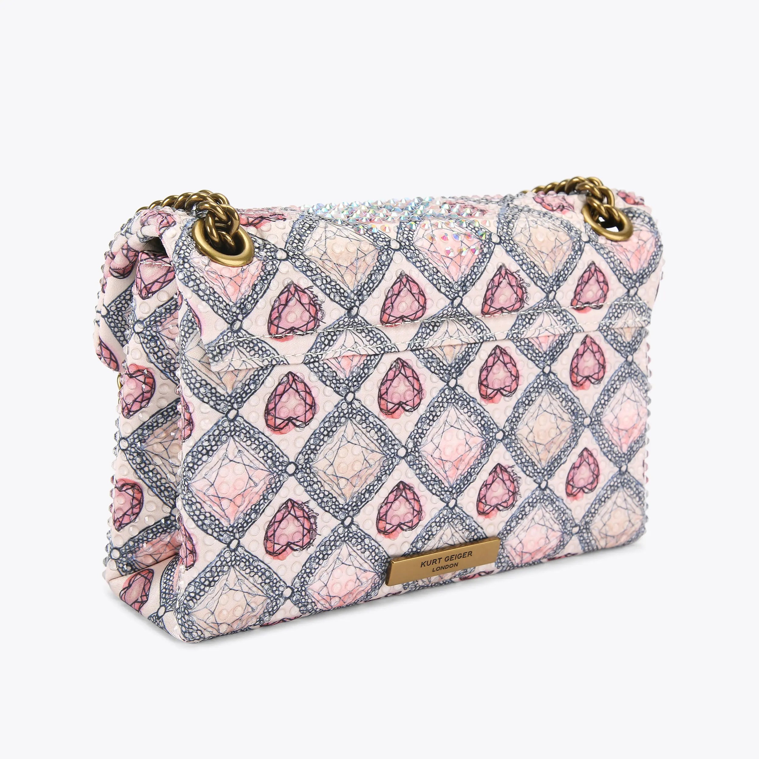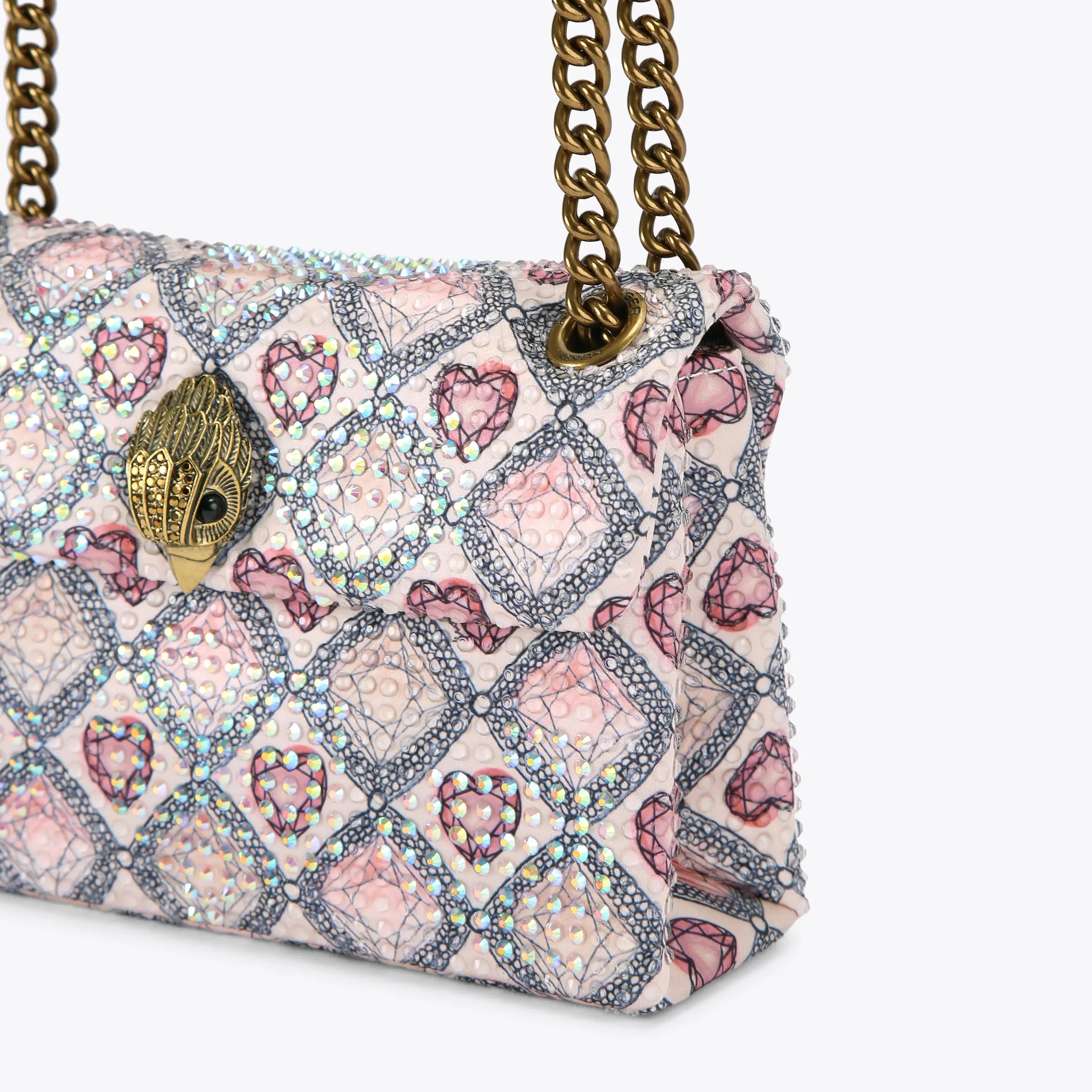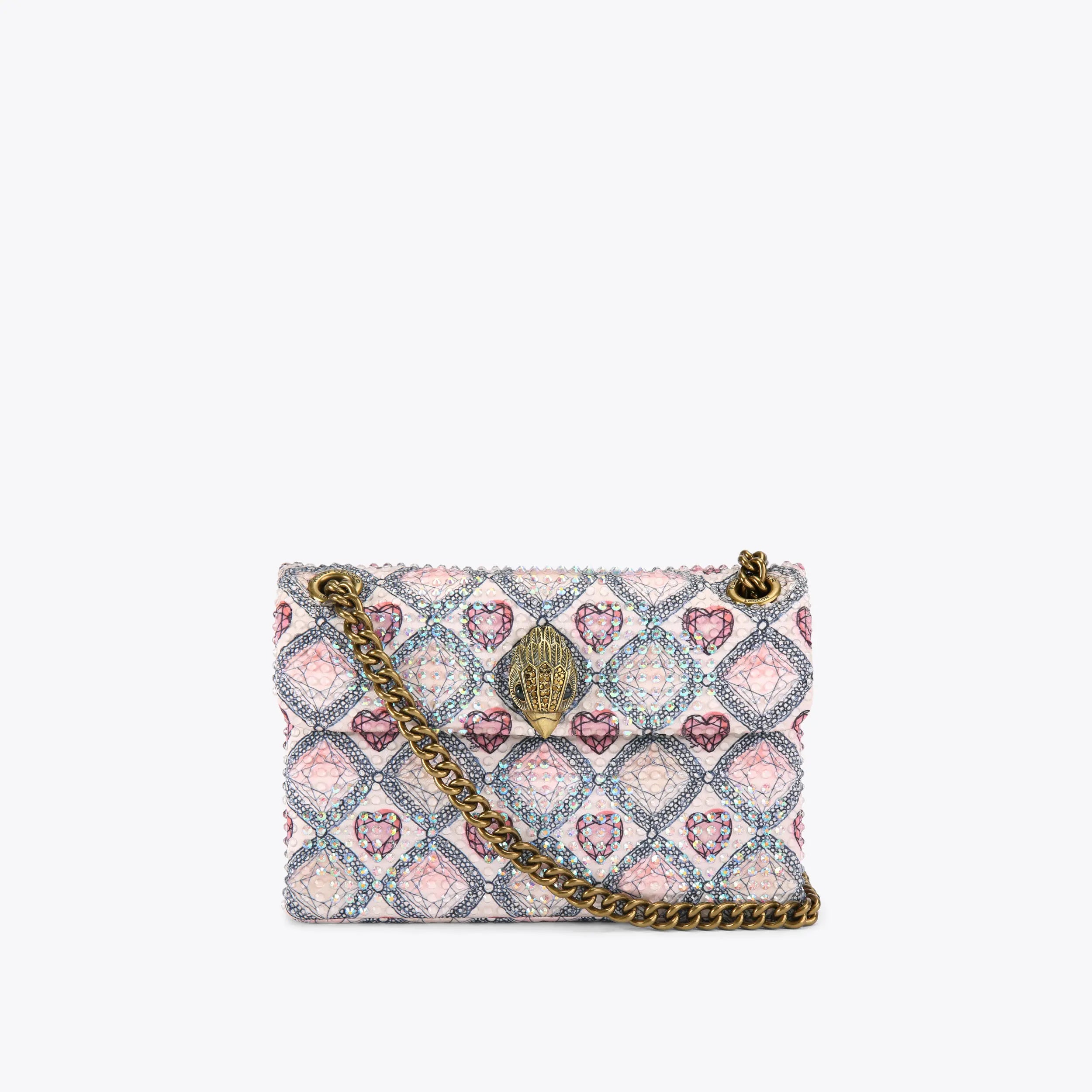 This Mini Fabric Kensington Purse is crafted from a printed satin with iridescent crystal embellishment. The front is finished with an antiqued brass eagle head with crystals on the flap.