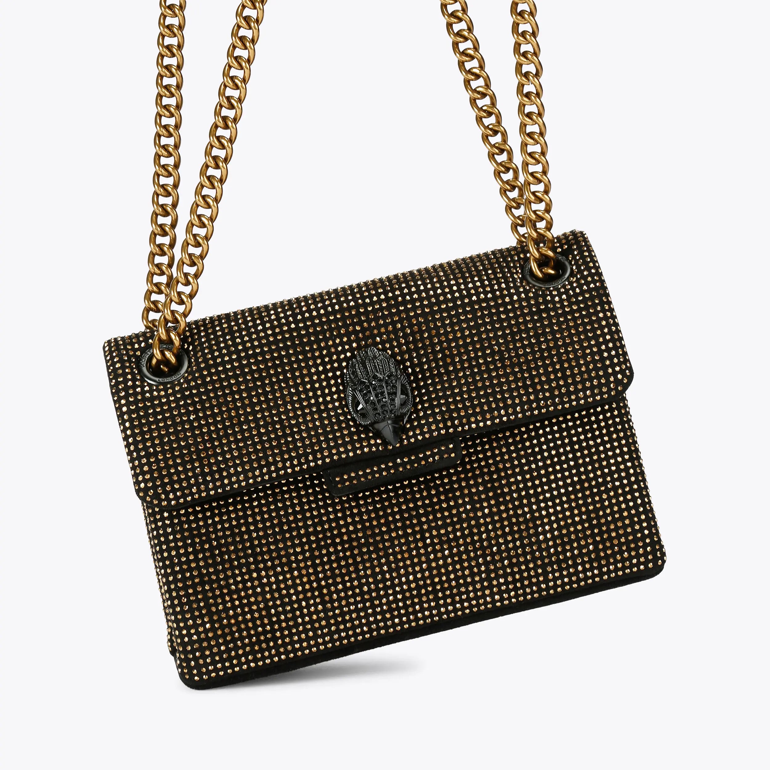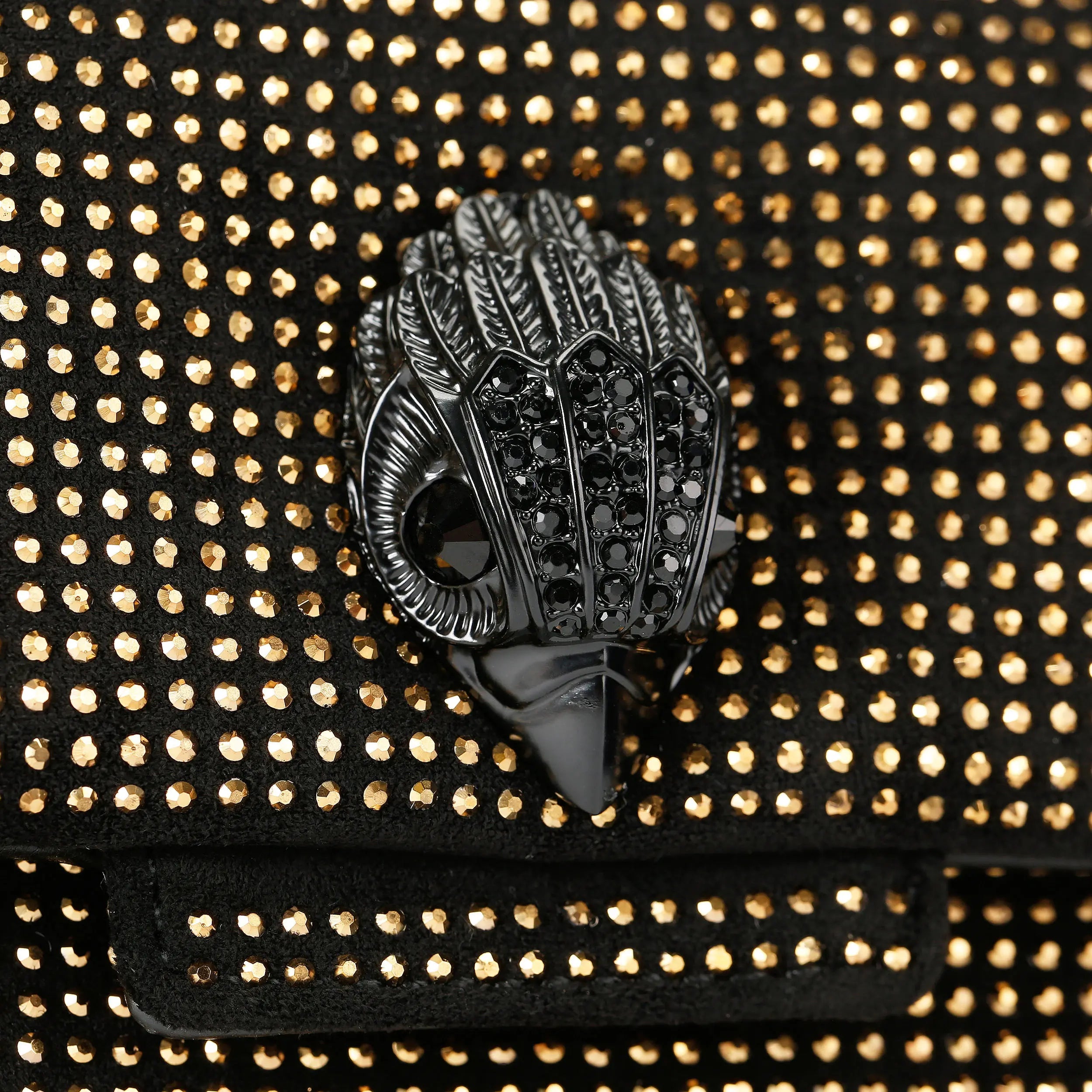 The Mini Fabric Kensington purse is crafted from a black fabric embellished with bronze crystals. The black eagle head features crystals and crystal eyes on the front flap.