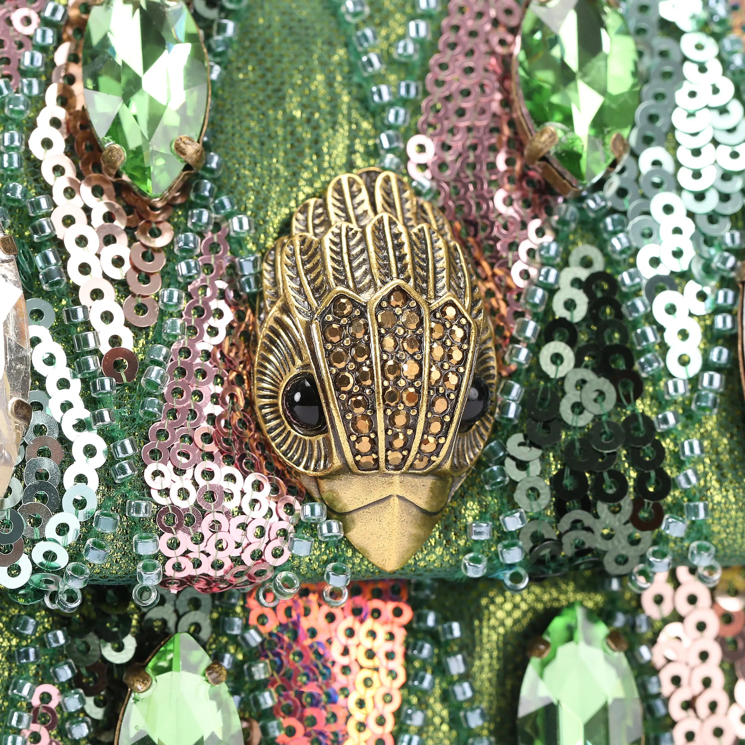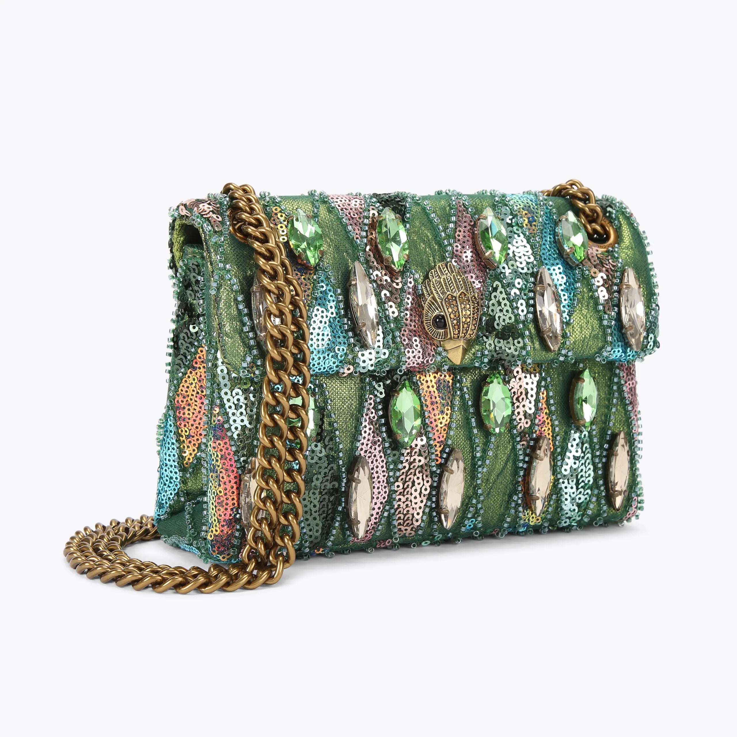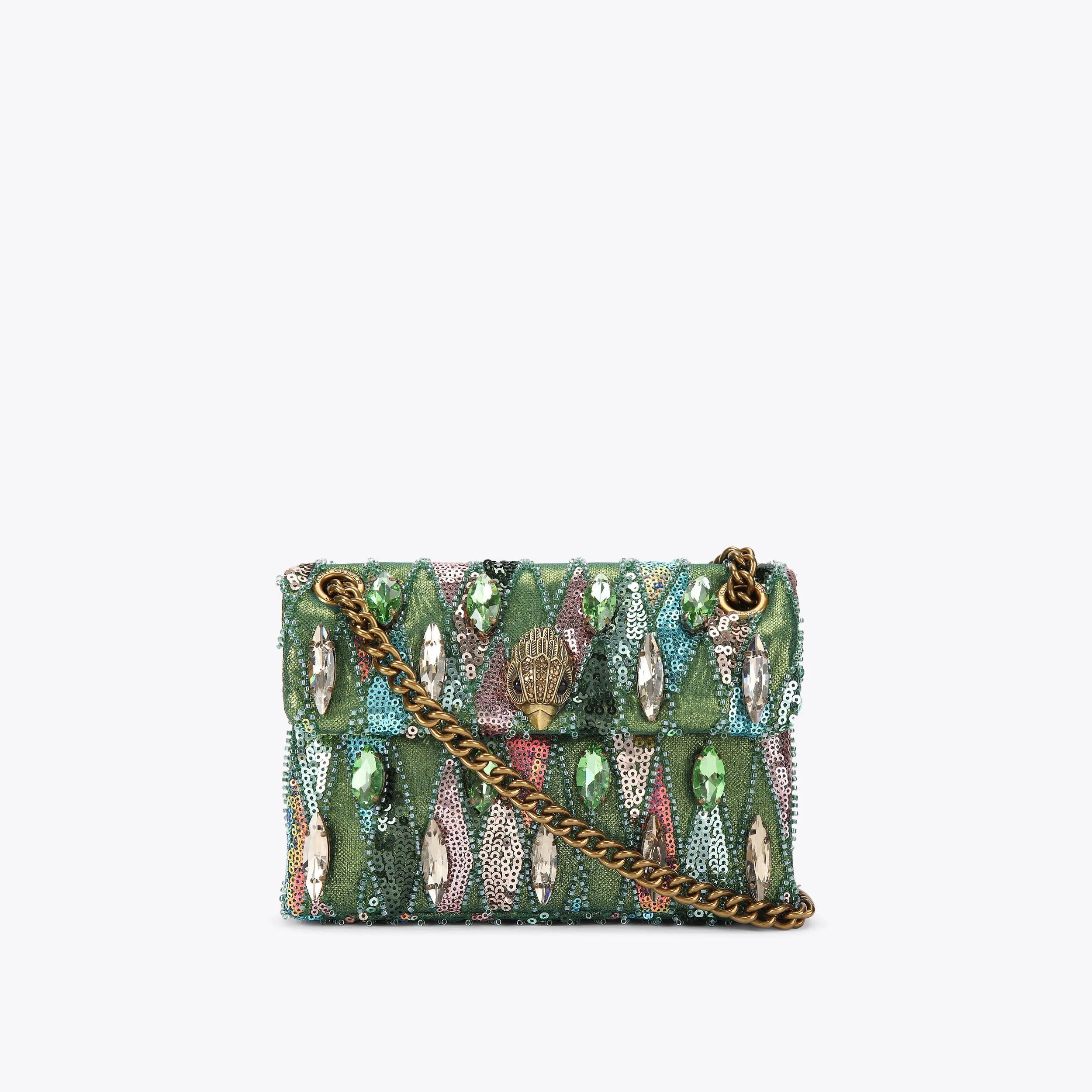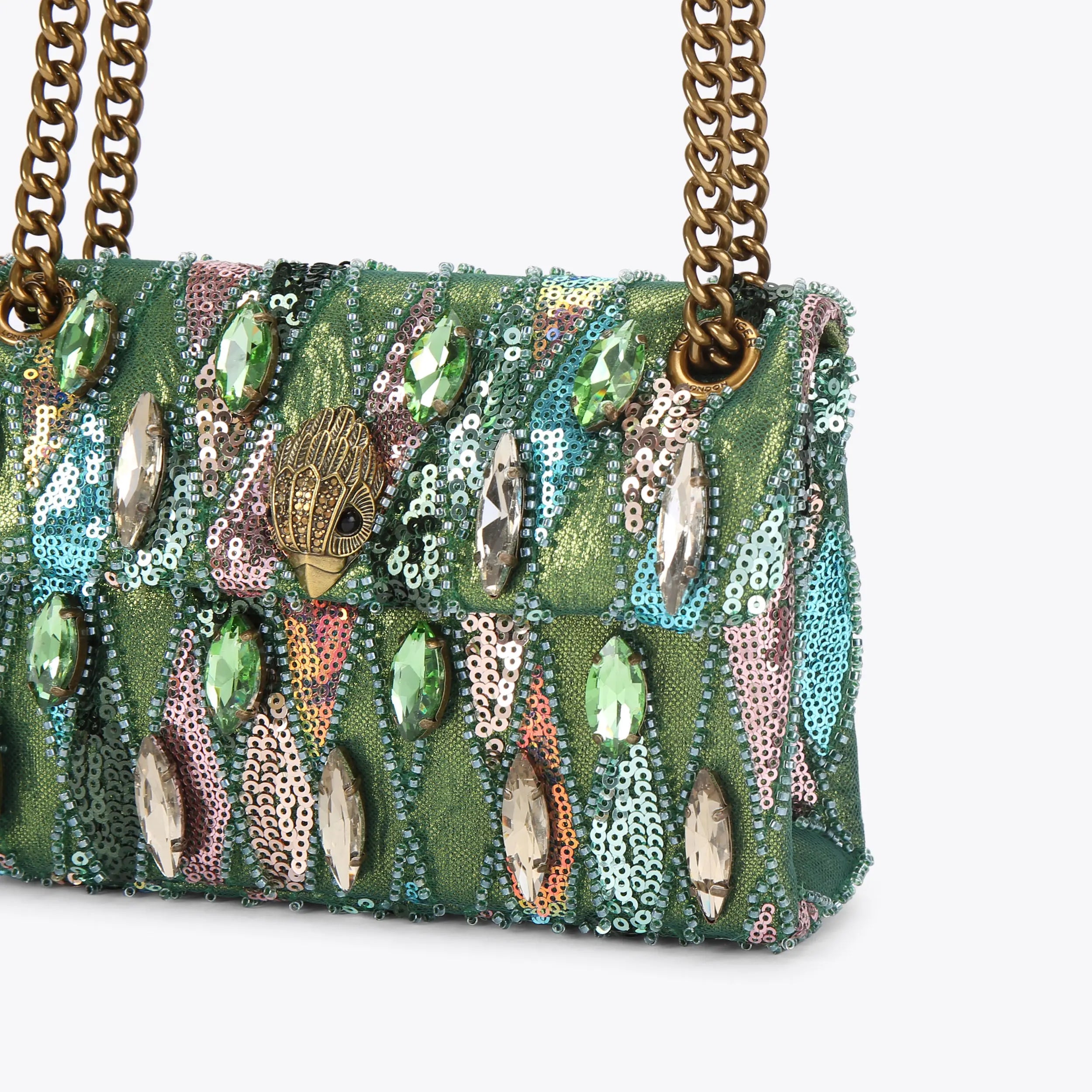 The Mini Sequin Kensington purse features green and silver marquise crystals across the front of the beaded purse. The antiqued brass eagle head features crystals on the front flap.