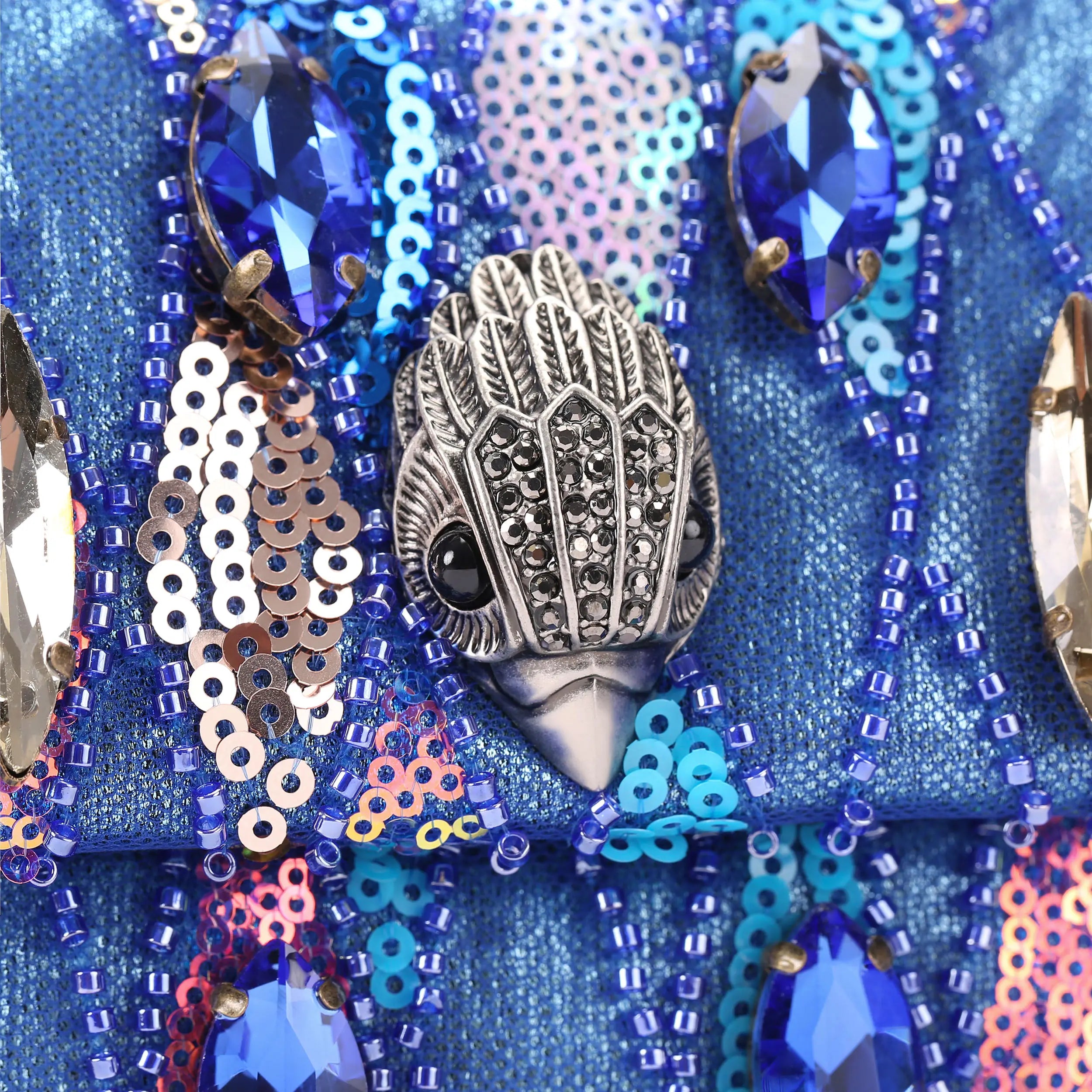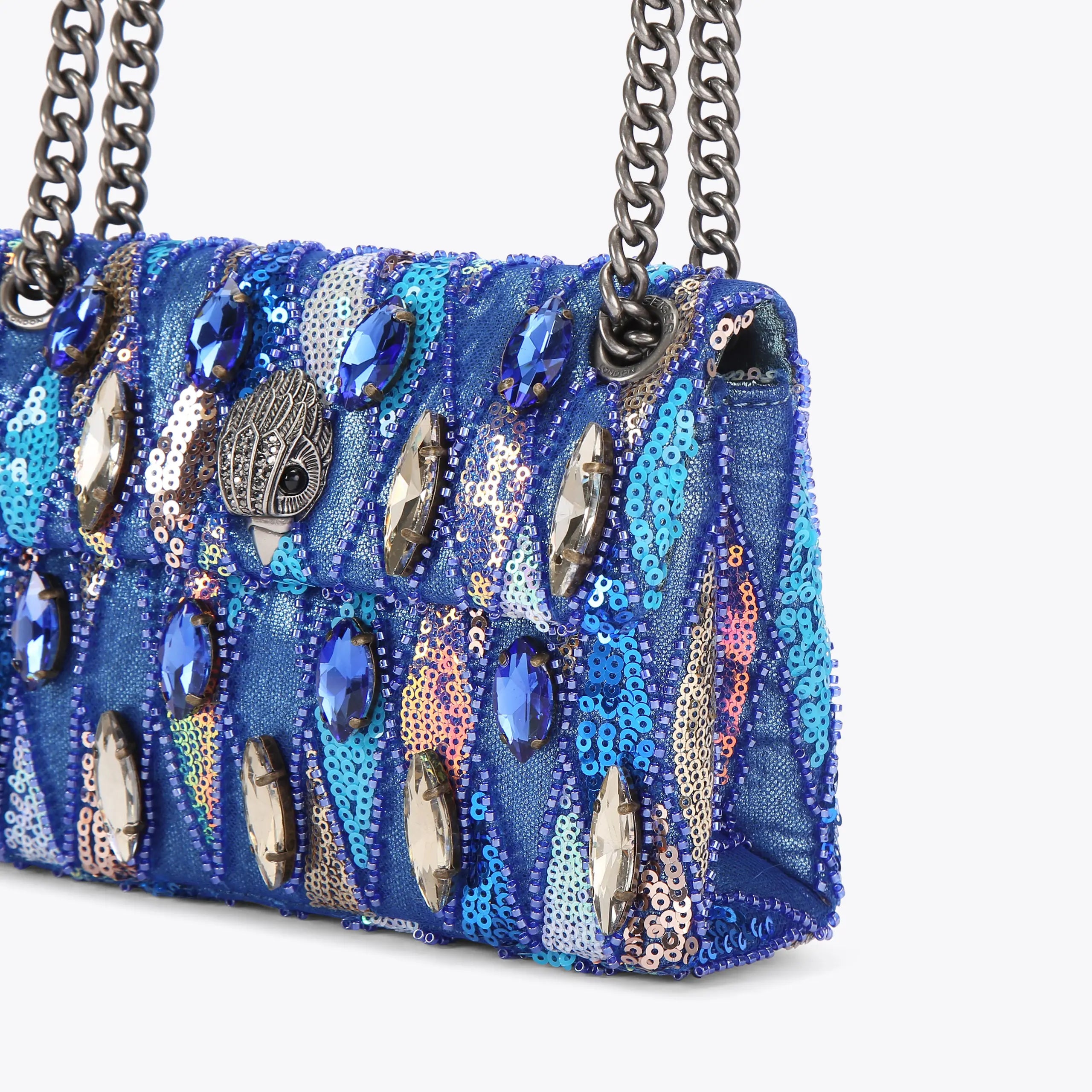 The Mini Sequin Kensington purse features blue and silver marquise crystals across the front of the beaded purse. The antiqued silver eagle head features crystals on the front flap.