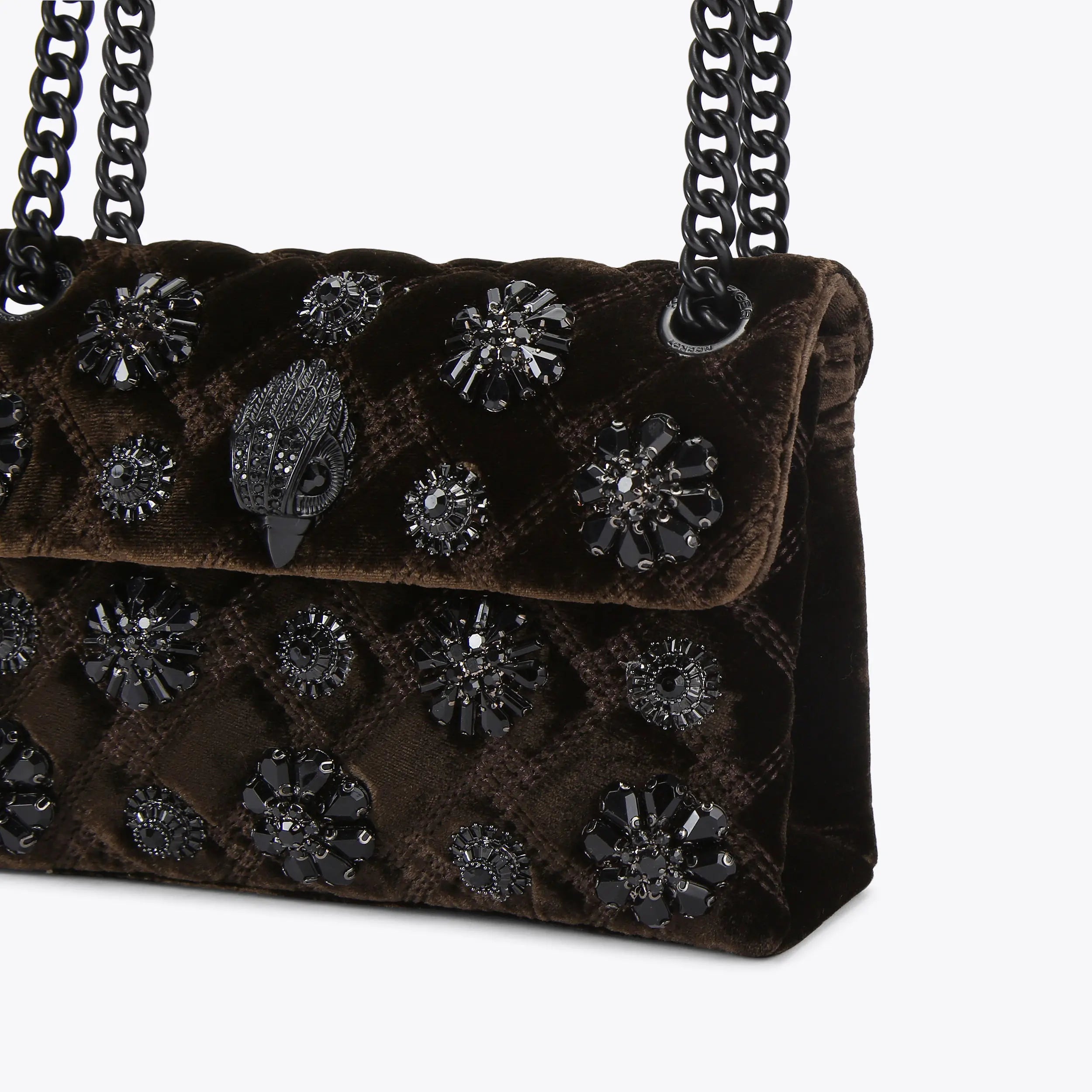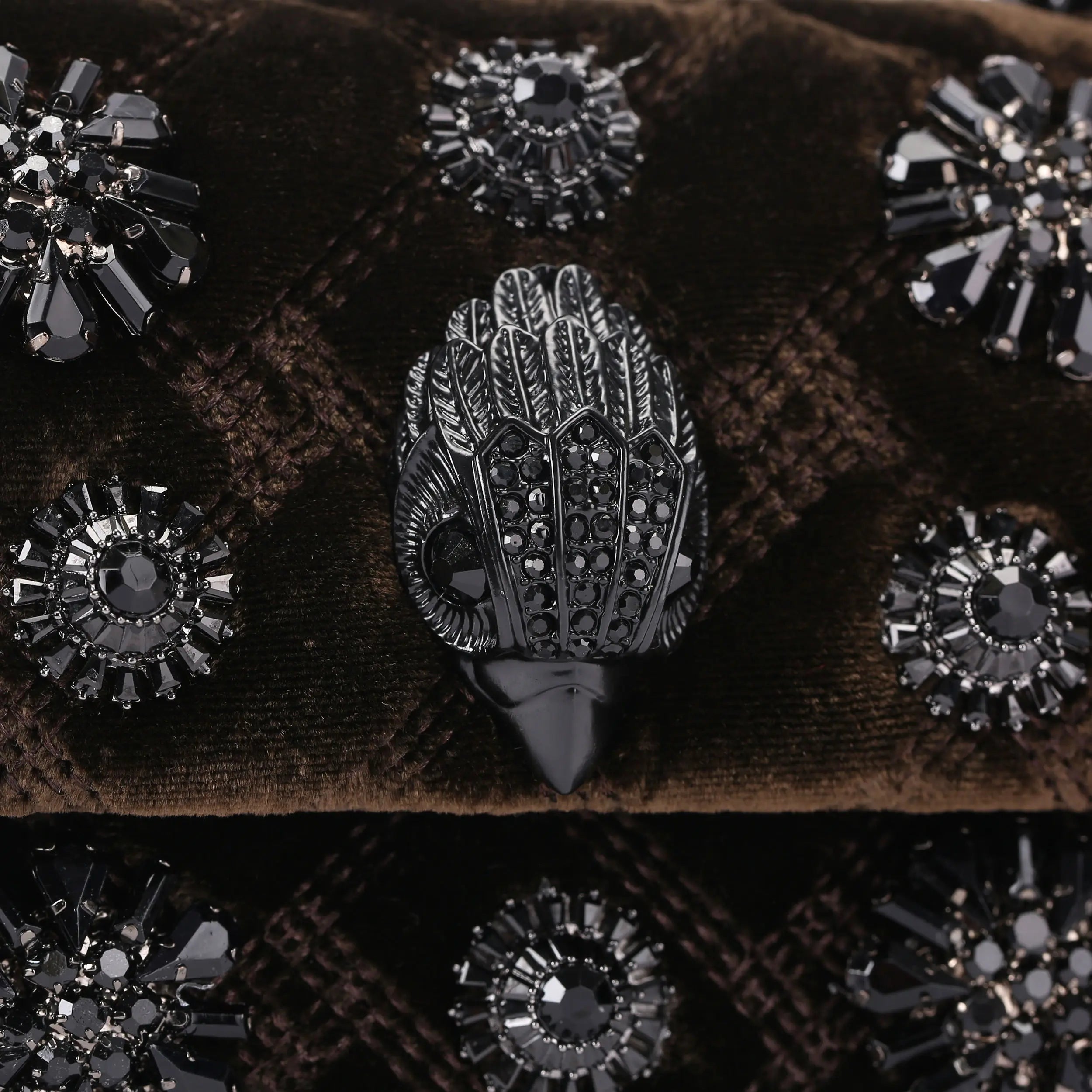 The Mini Velvet Kensington purse is crafted from a deep brown velvet fabric. The black metal eagle head sits amongst black crystals in floral motifs.