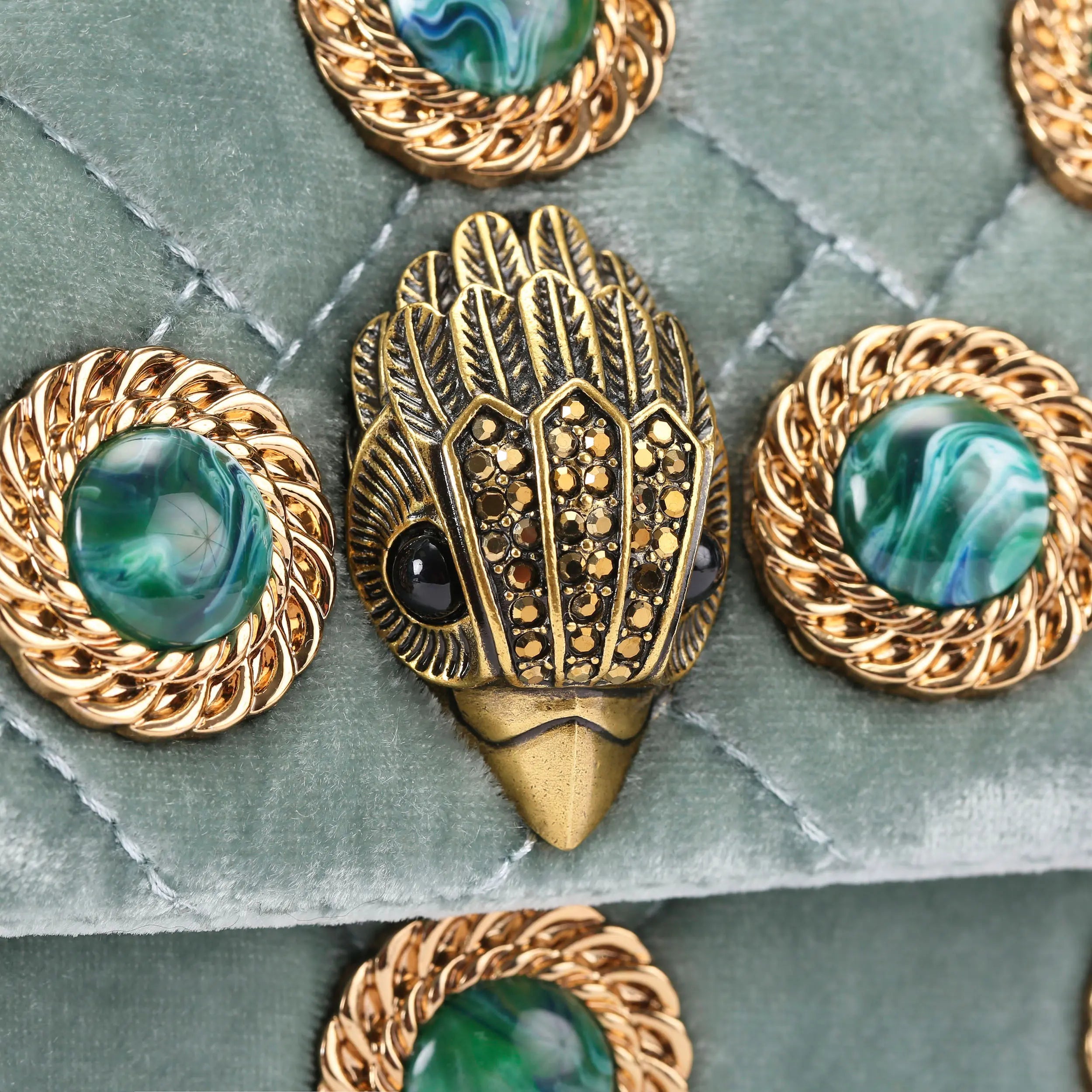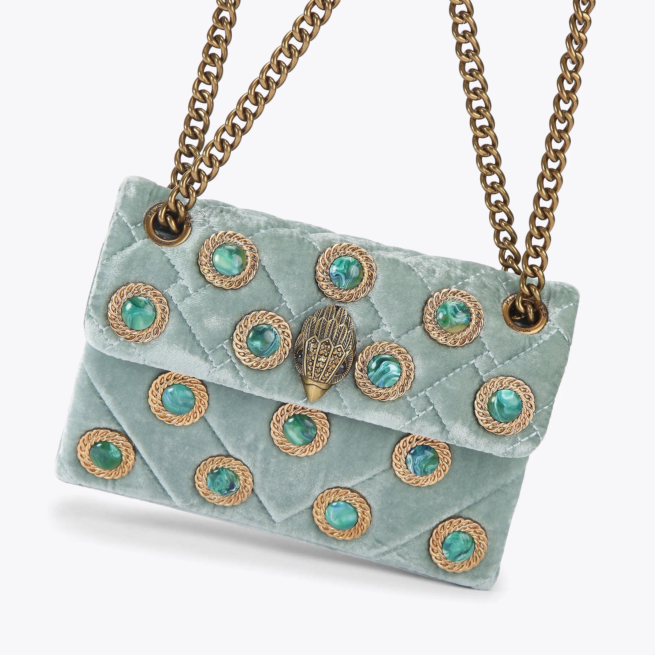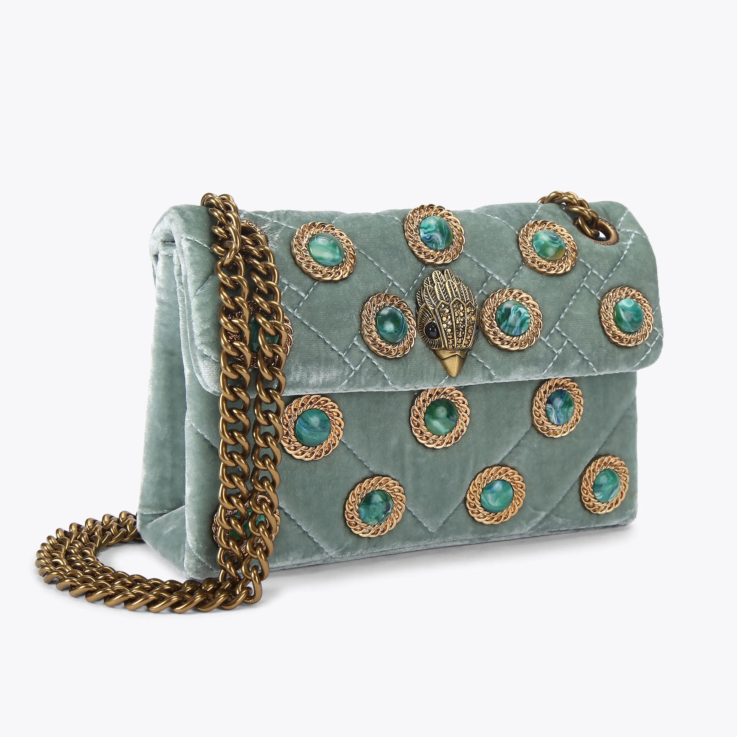 The Velvet Mini Kensington purse is crafted from a soft pale green velvet fabric. The antiqued brass eagle head sits amongst green stones and gold chain studs.