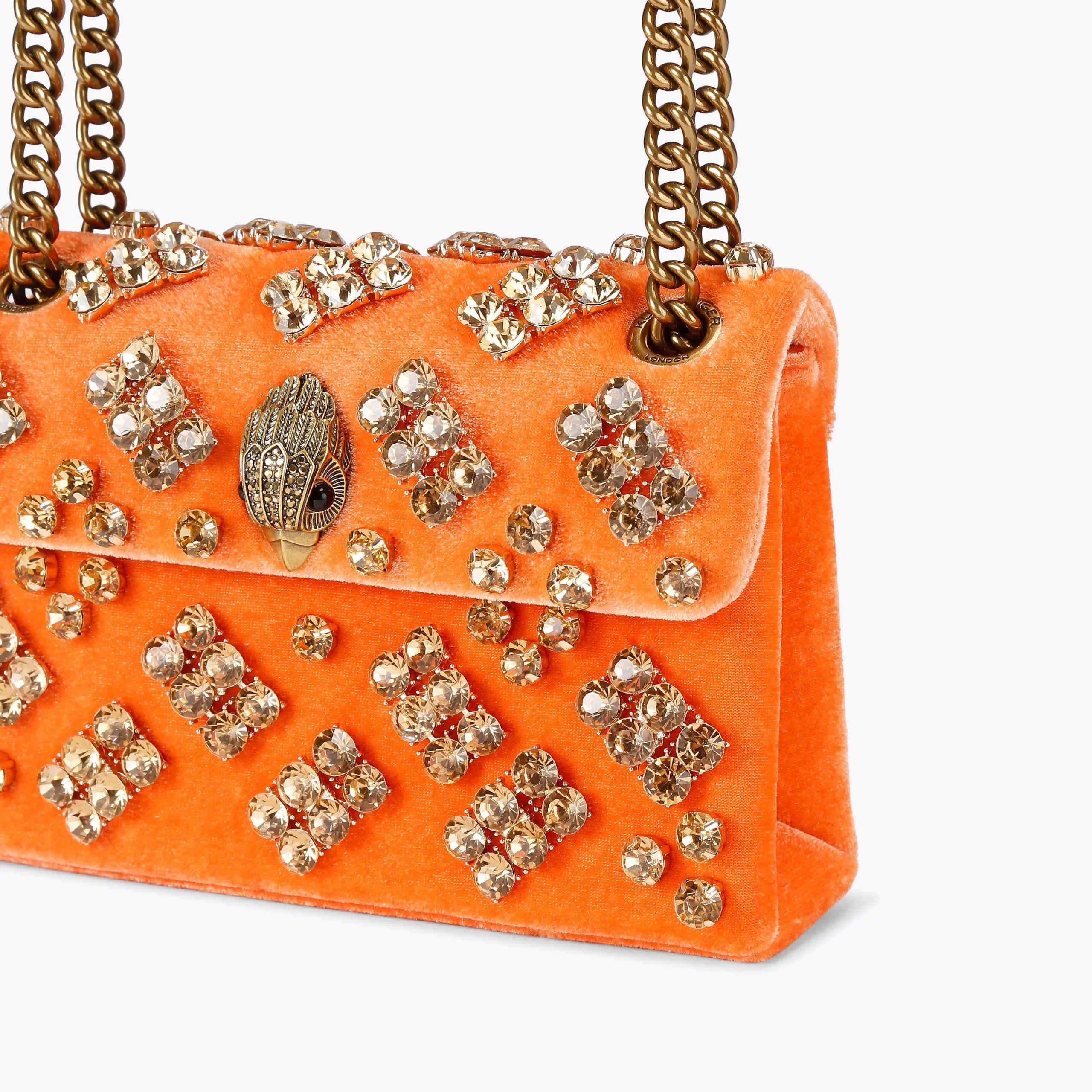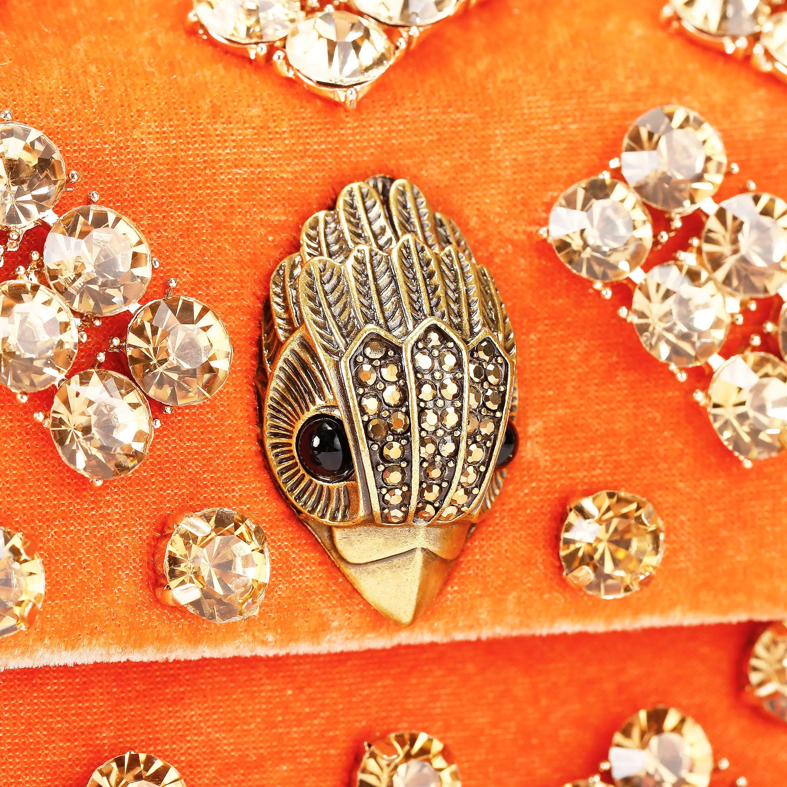 The Velvet Mini Kensington is crafted from a soft orange velvet fabric. The antiqued brass eagle head sits amongst crystals creating a quilted design.