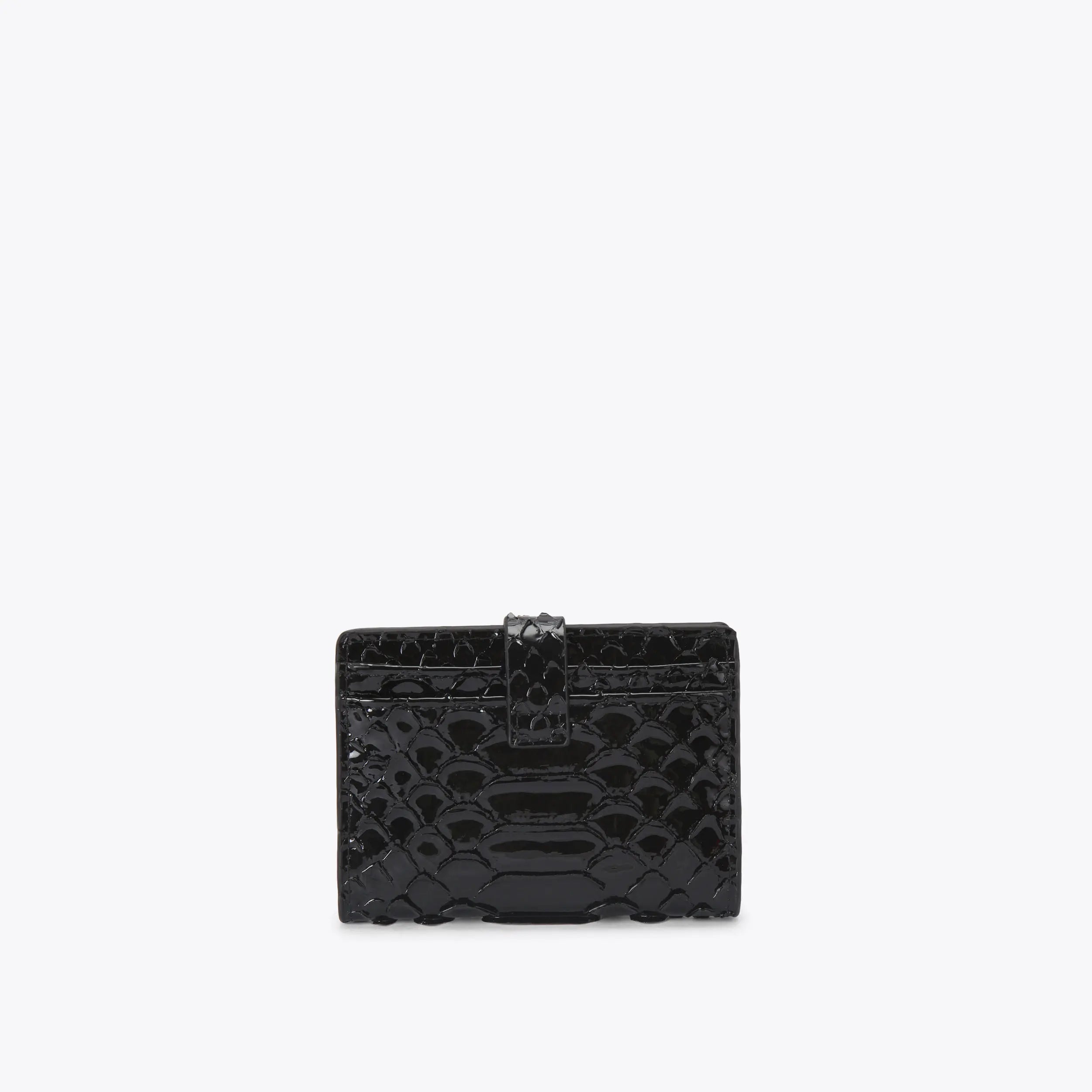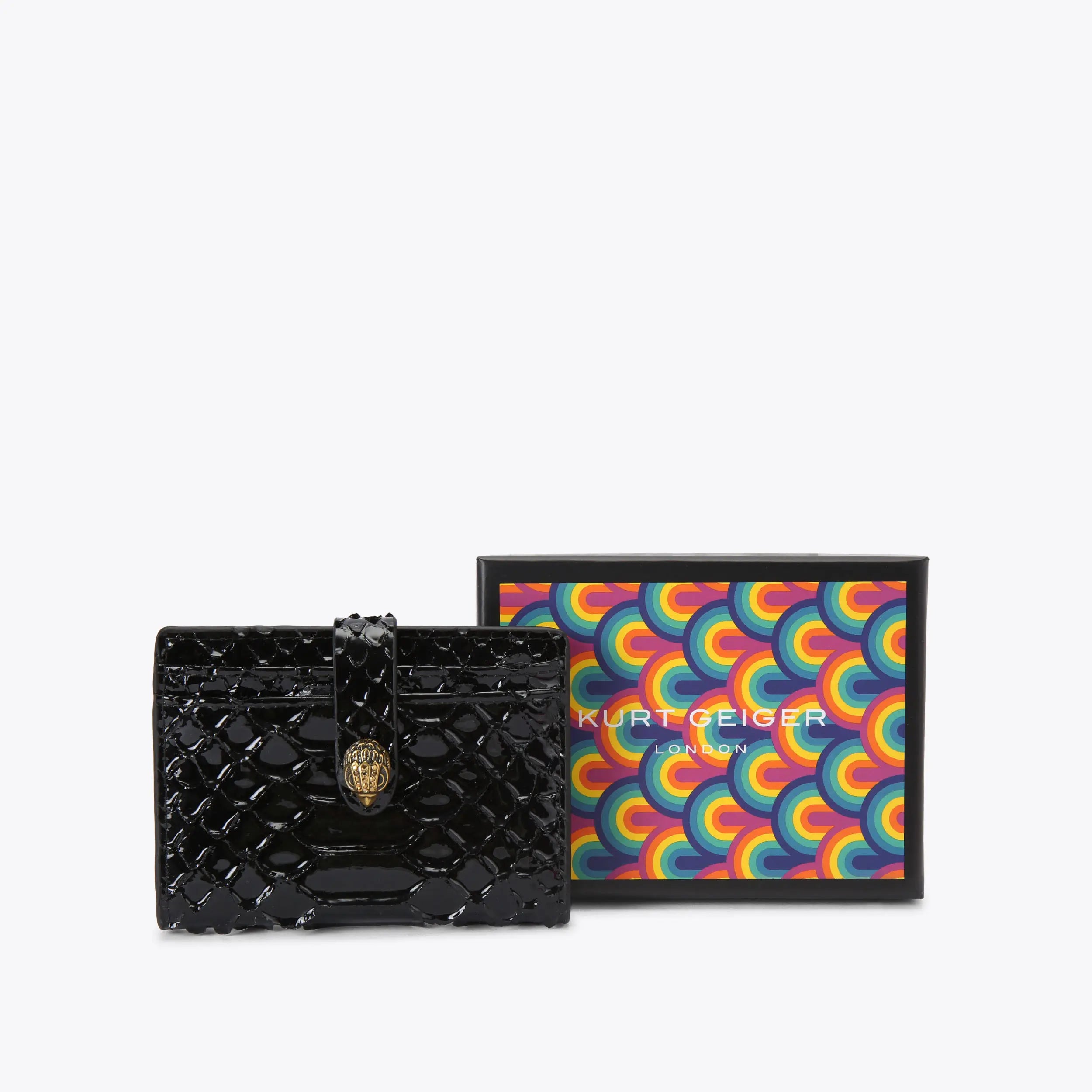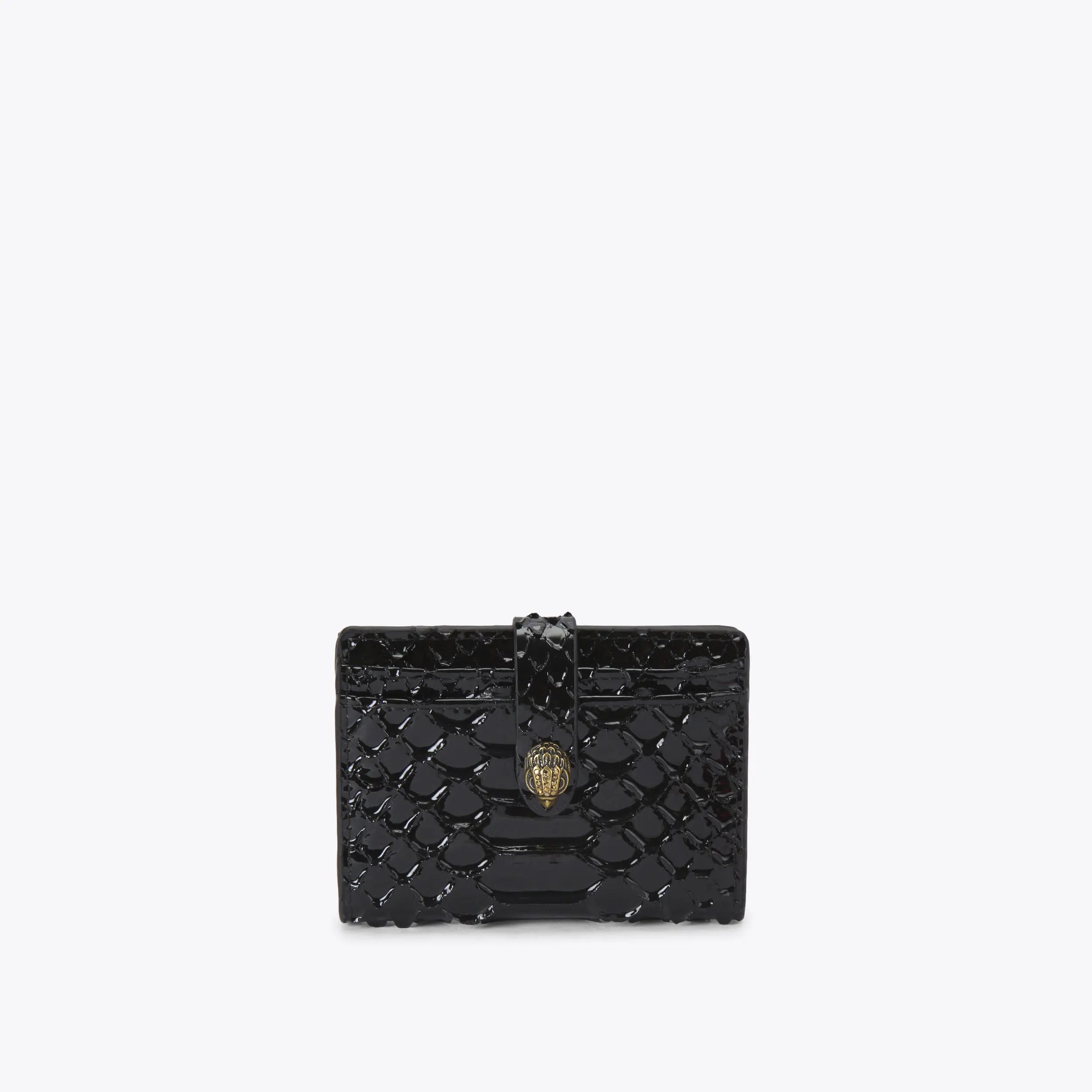 The Multi Card Holder is crafted from a black 3D croc embossed leather. The antiqued brass eagle head features crystals and black bead eyes which sits on the closure.