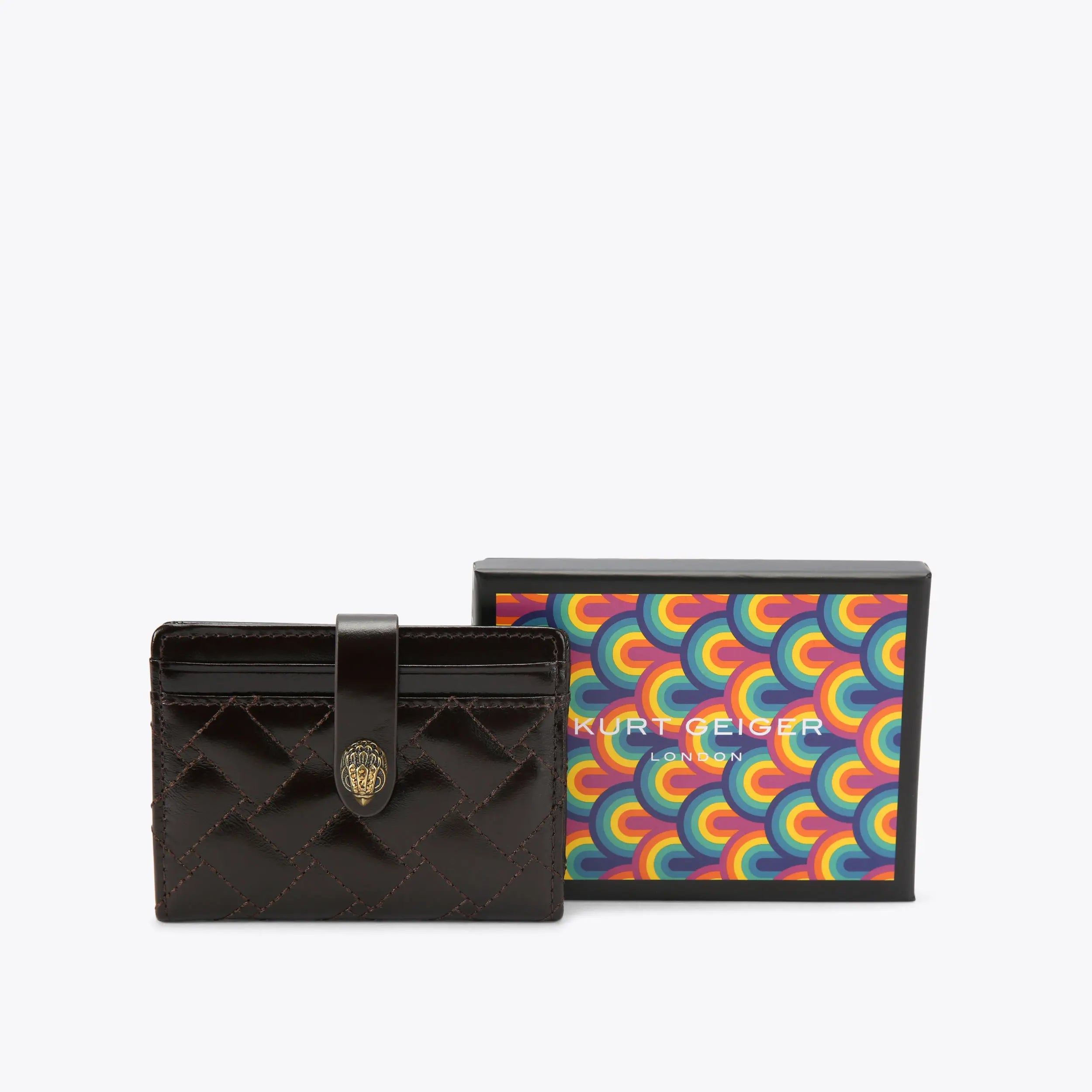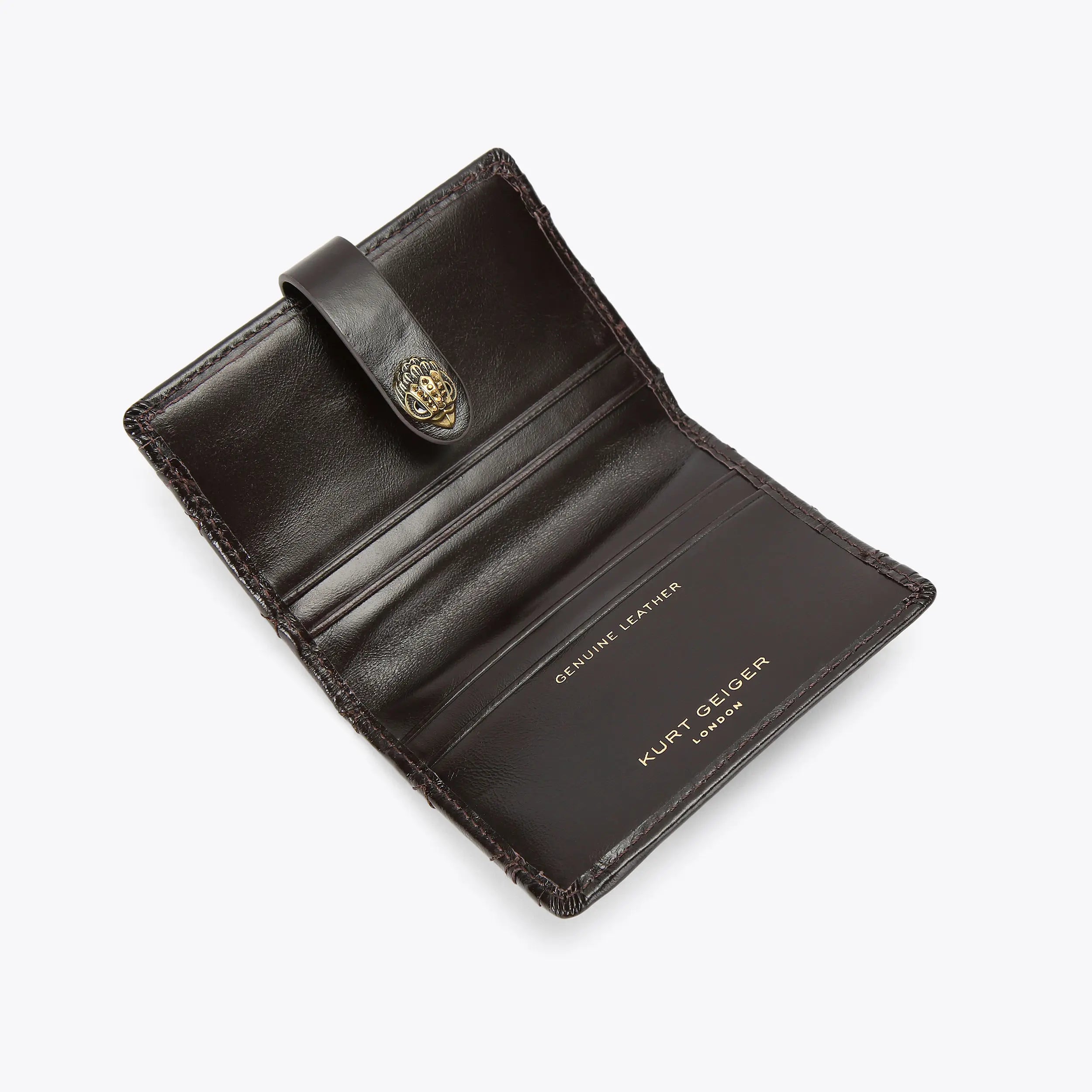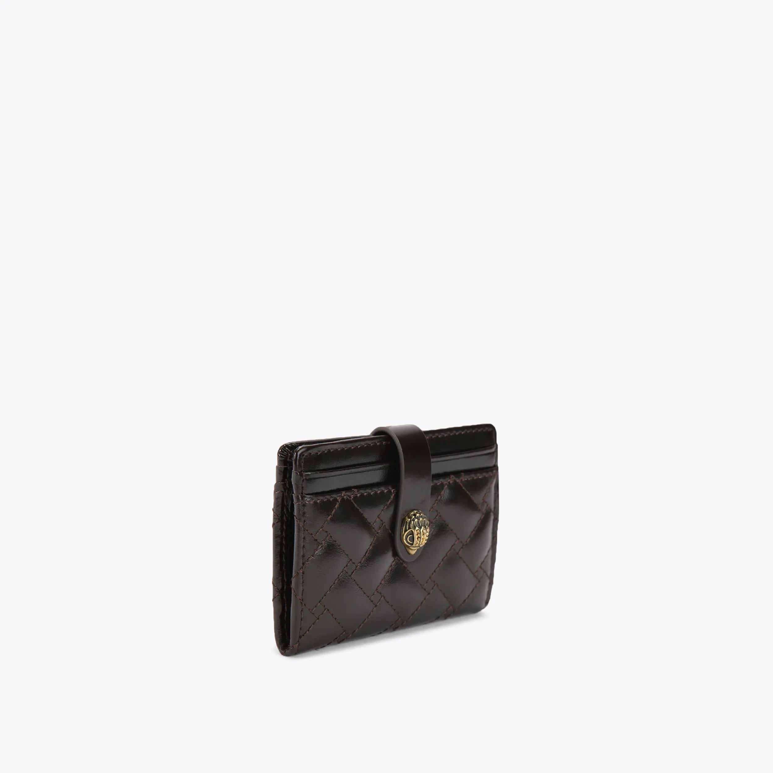 The Multi Card Holder is crafted from a soft dark brown leather. The antiqued brass eagle head features crystals and black bead eyes which sits on the closure.