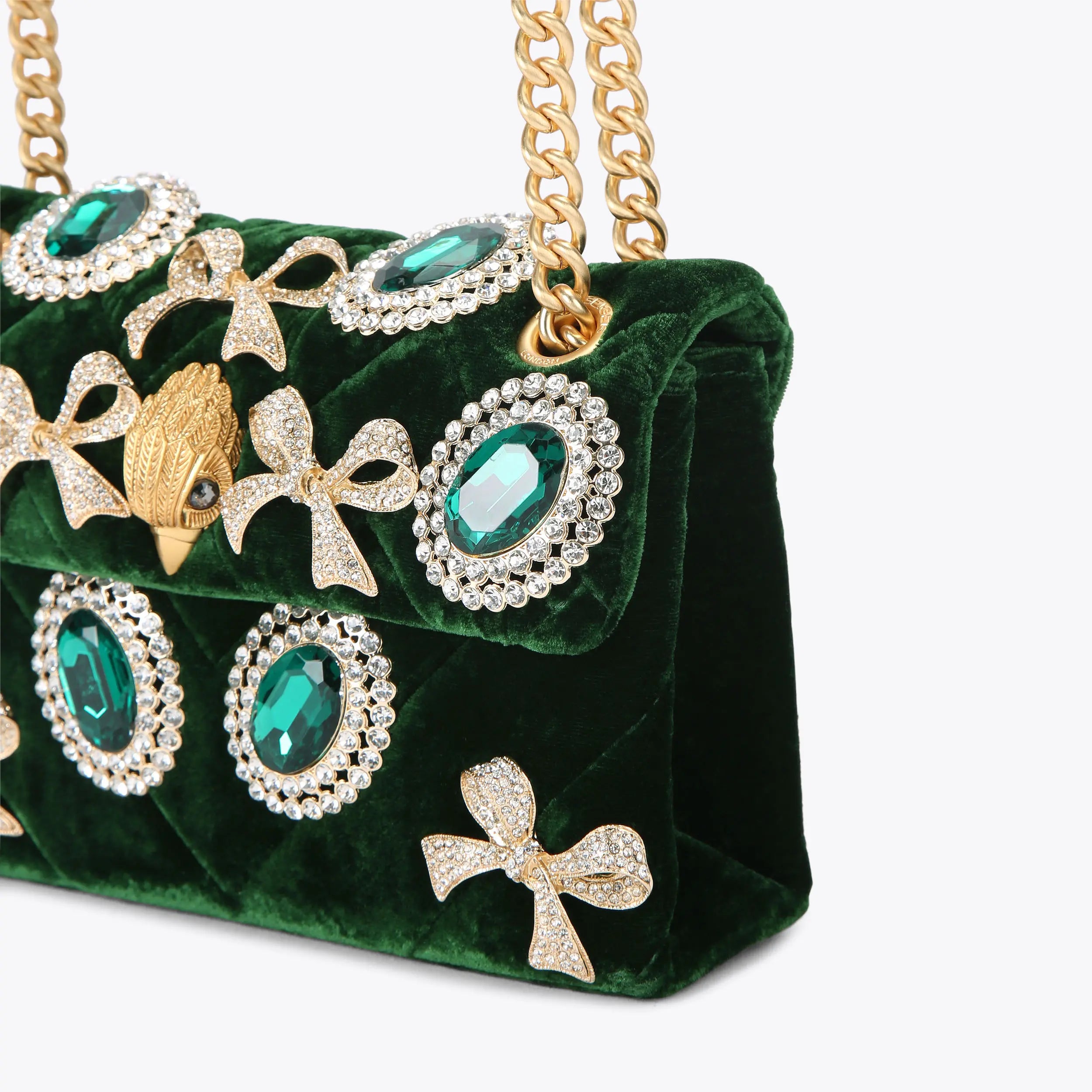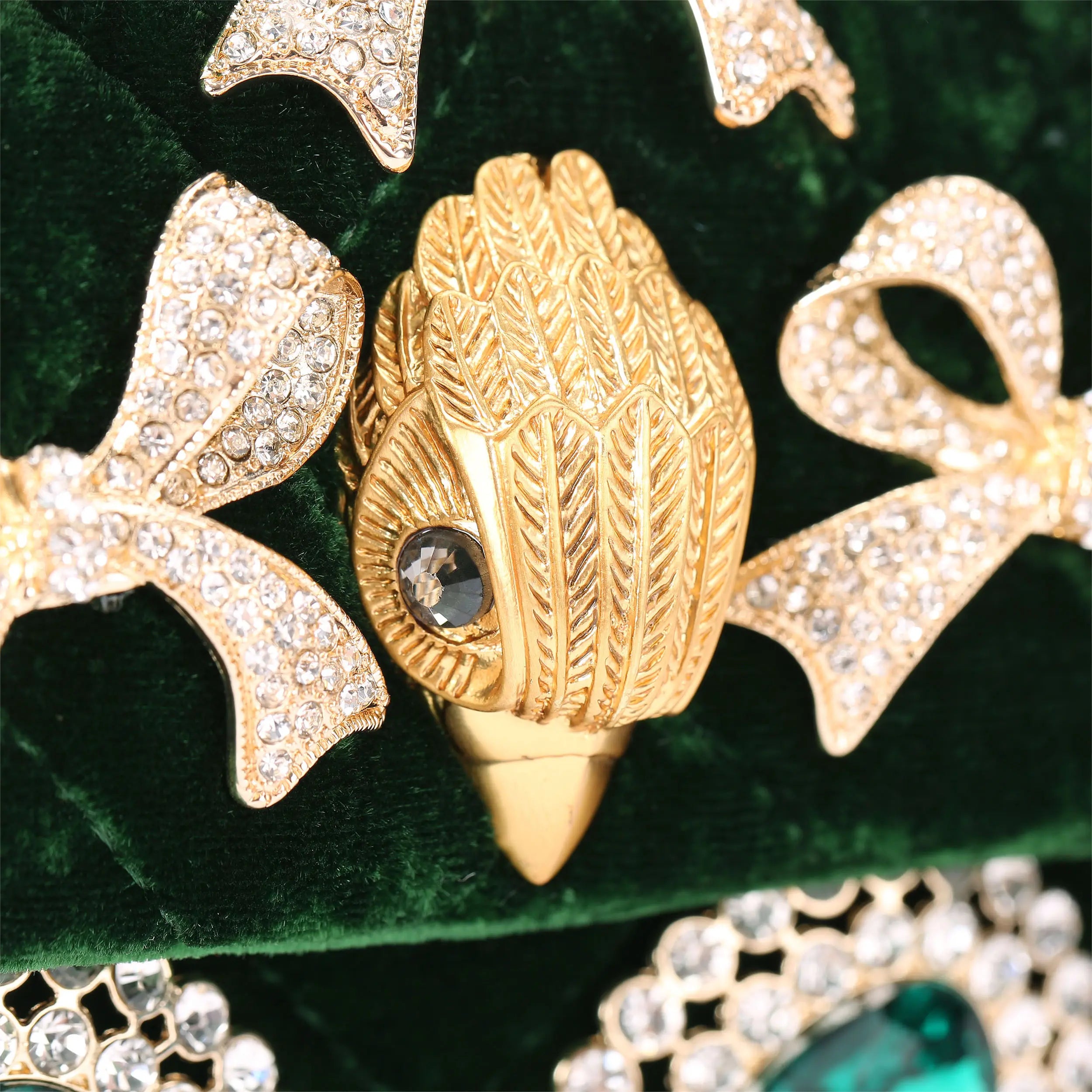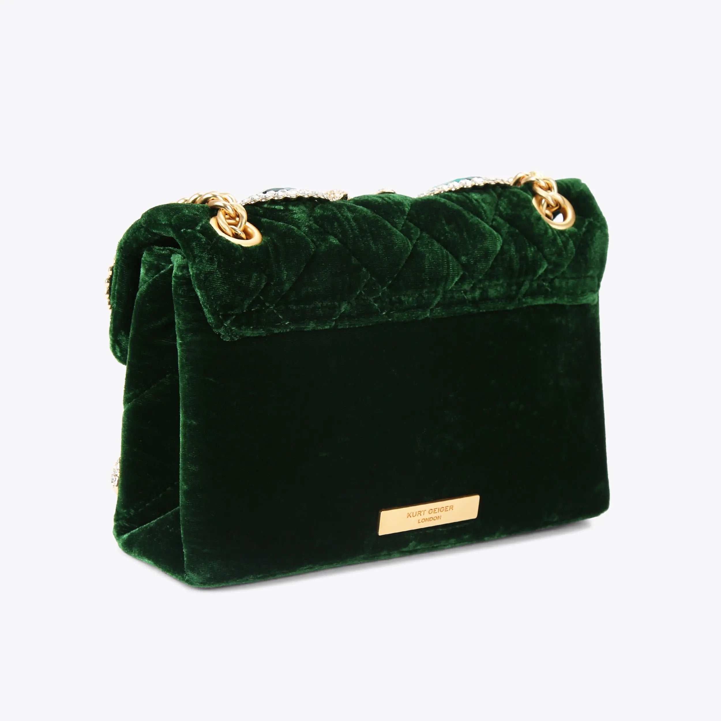 The Velvet Mini Kensington is crafted from a soft blue black fabric. The antiqued gold eagle head sits amongst stars and large green crystals.