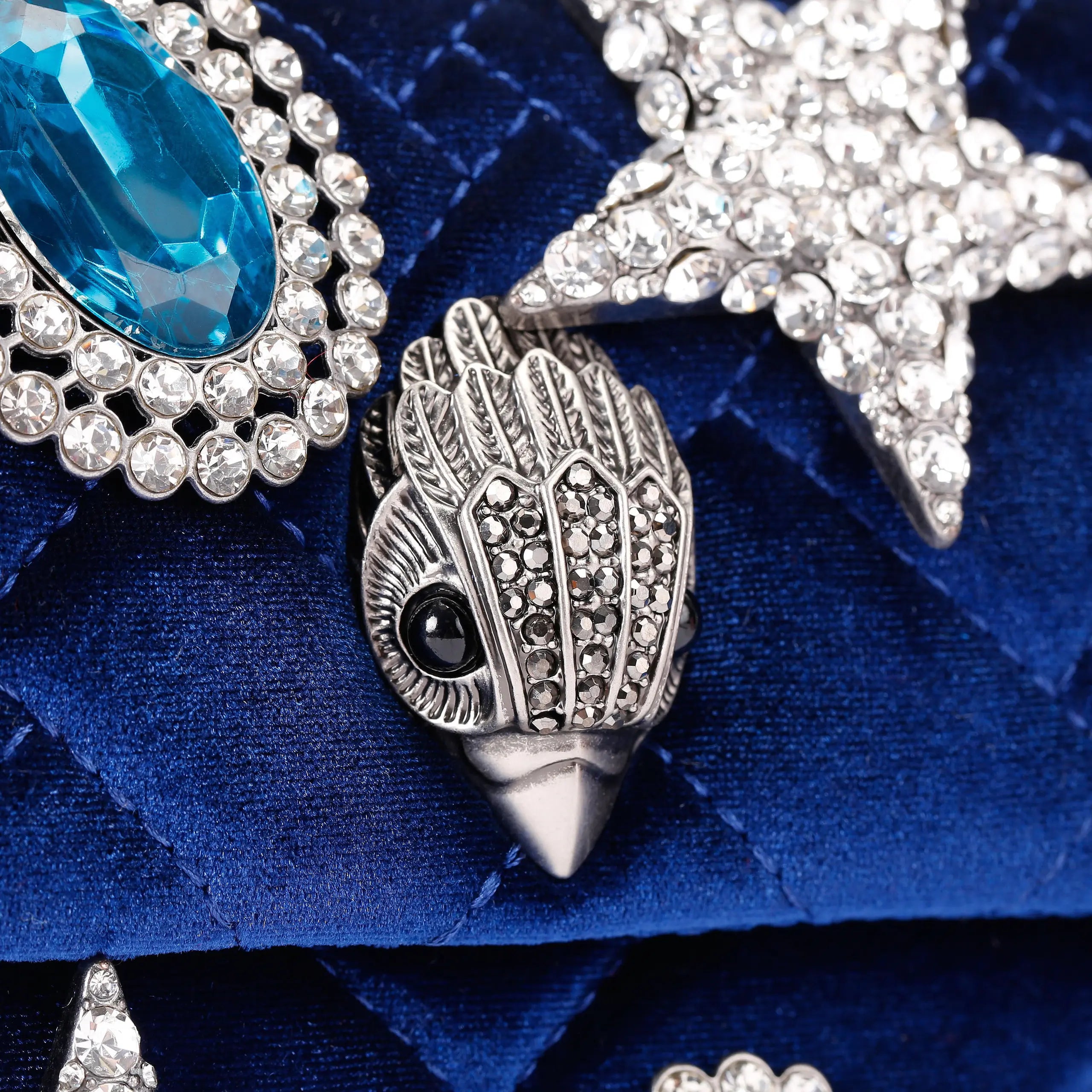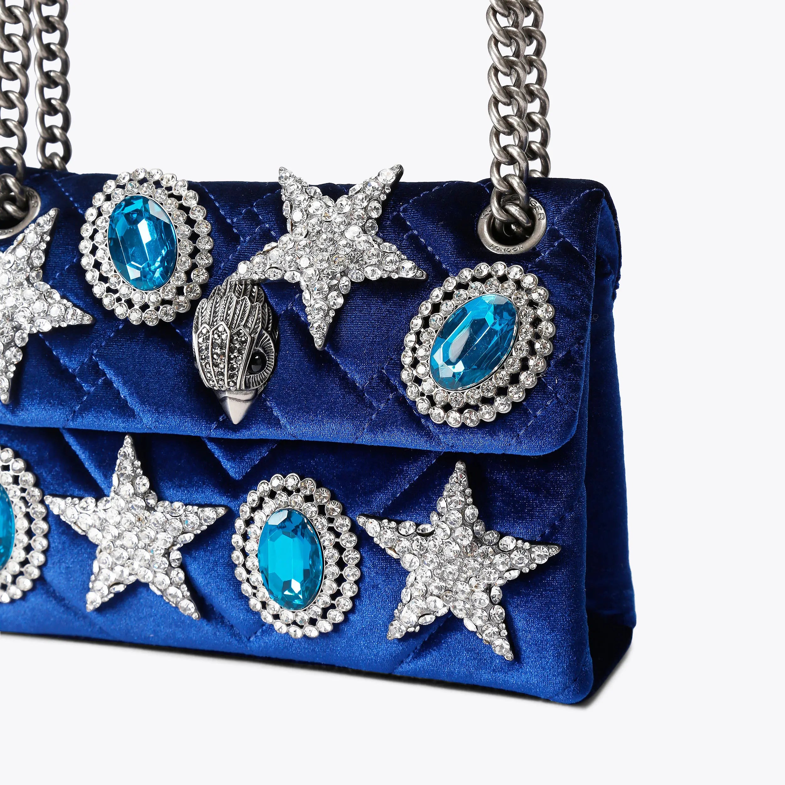 The Velvet Mini Kensington is crafted from a soft blue velvet fabric. The antiqued silver eagle head sits amongst stars and large blue crystals.