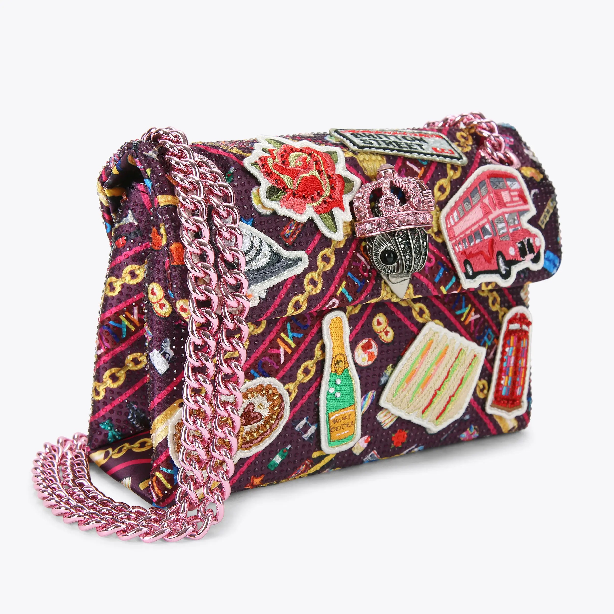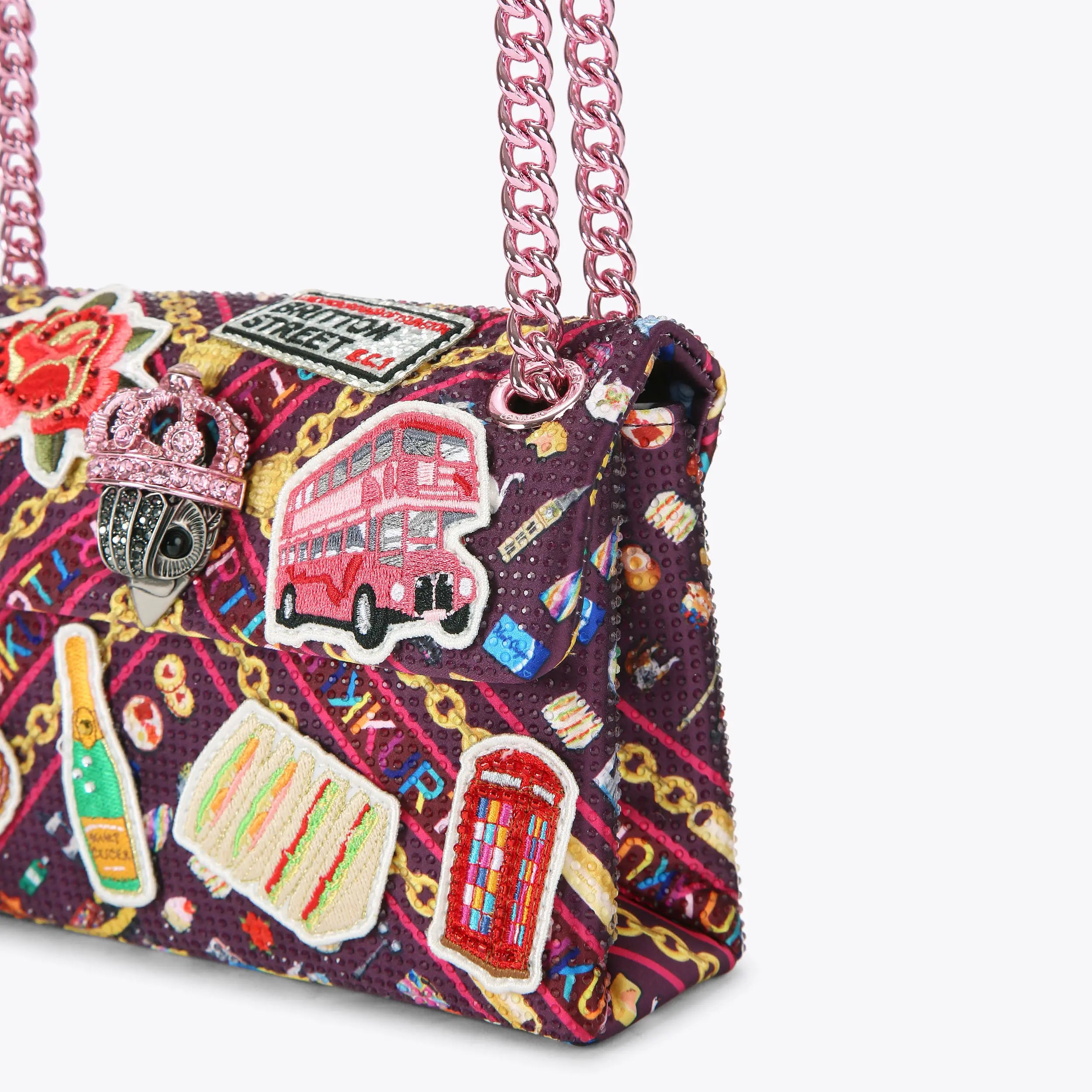 The Mini London Kensington purse features a purple Kurt Geiger printed satin which is embellished with clear crystals. There are fabric patches of iconic British symbols. The antiqued silver eagle head features a pink crown on the front flap.