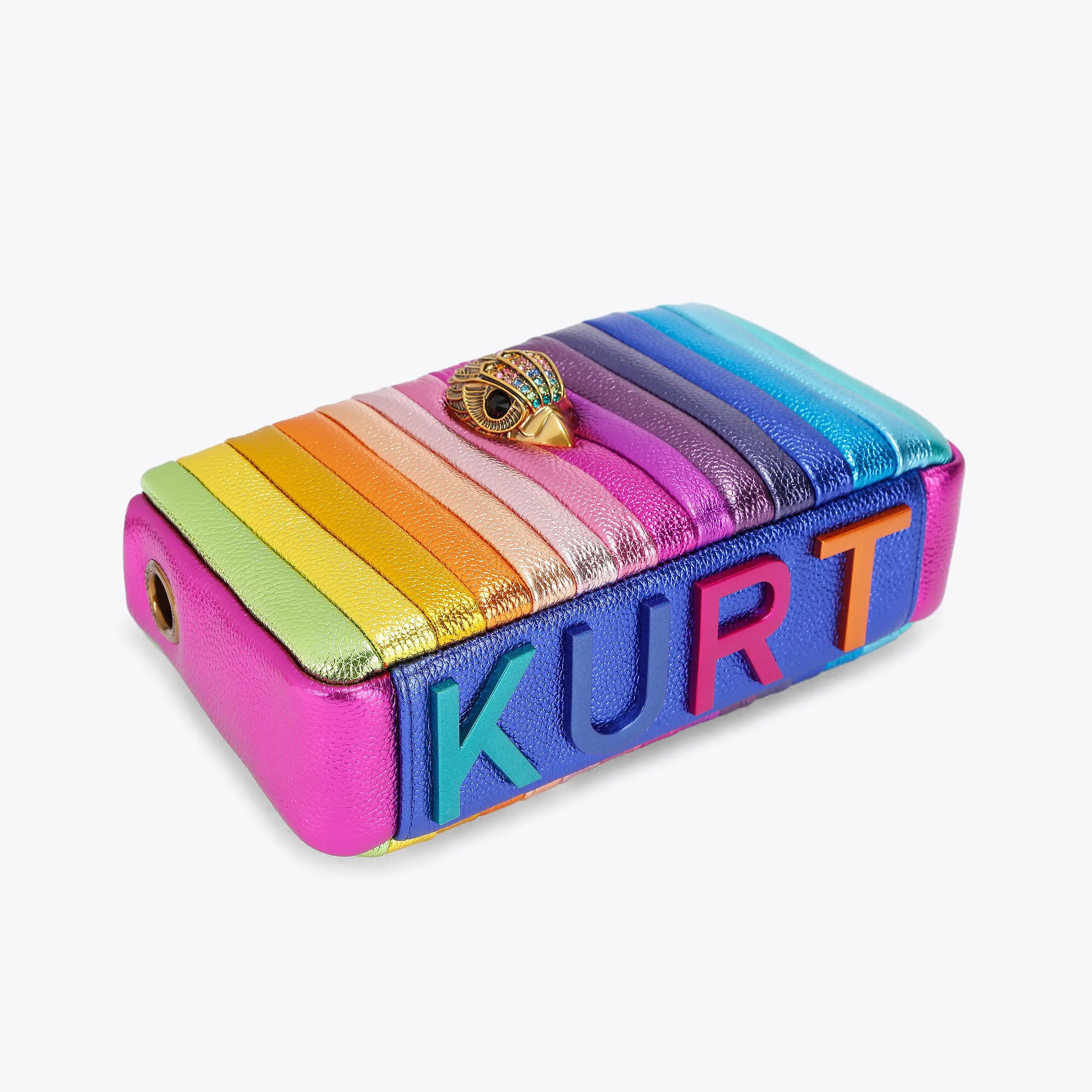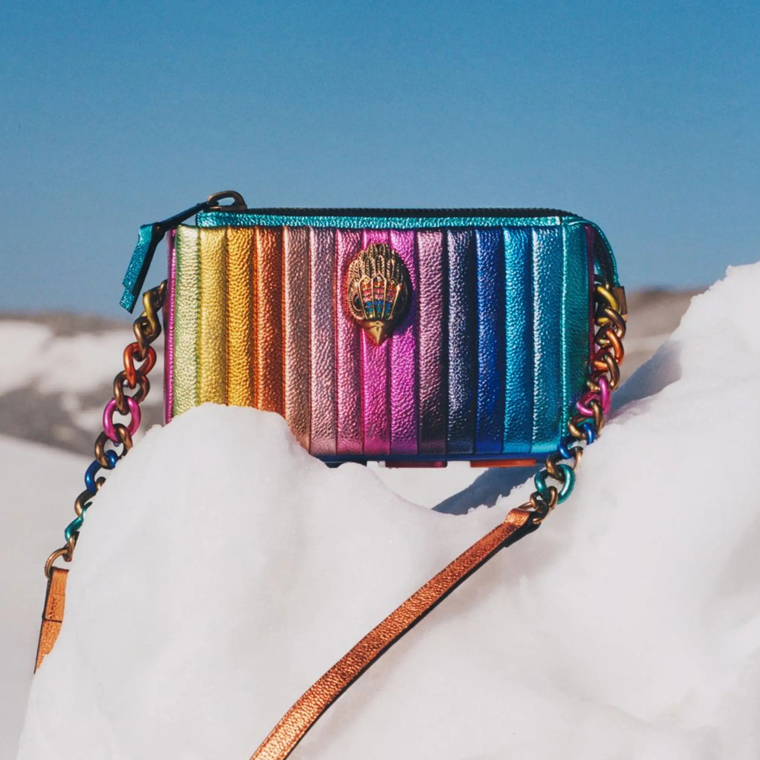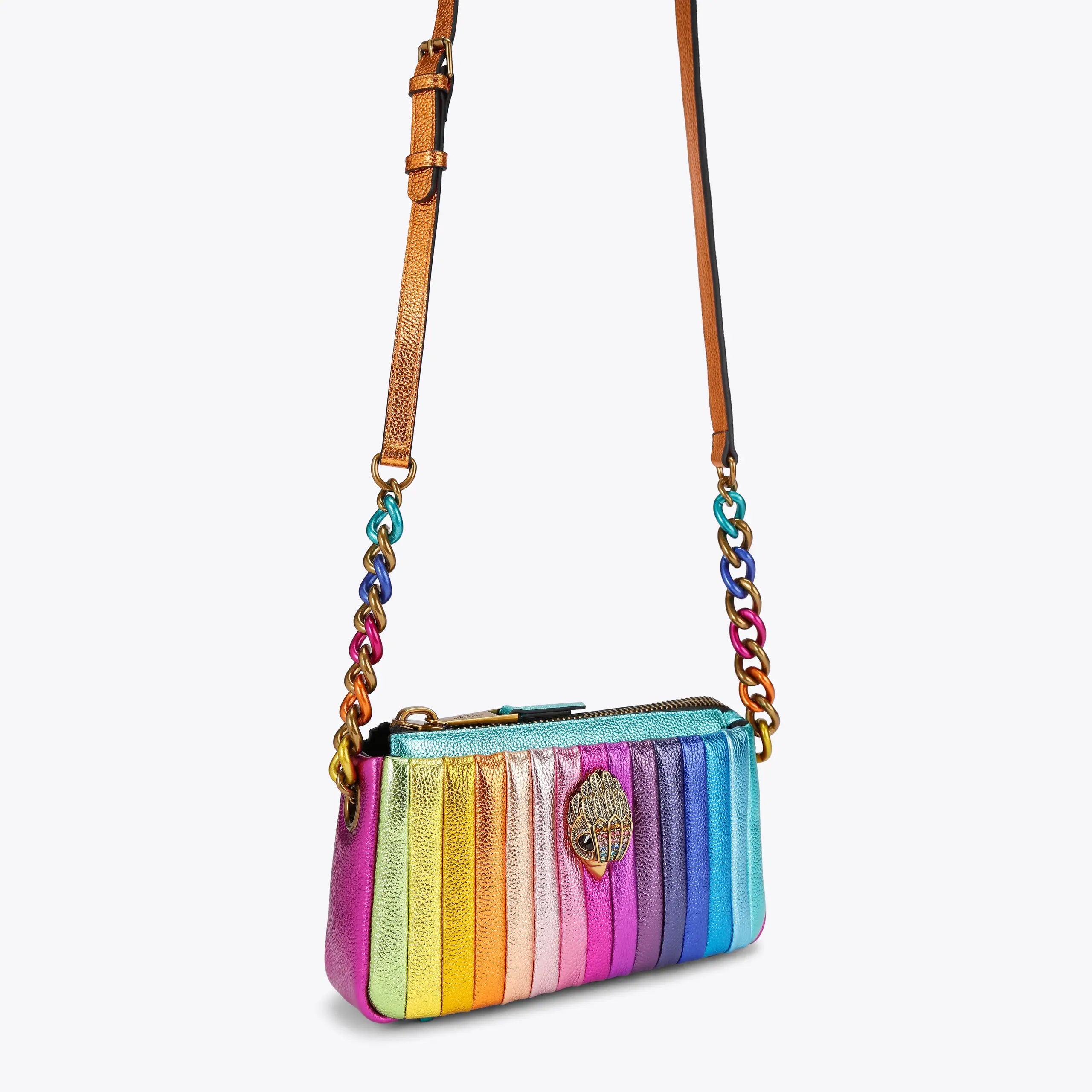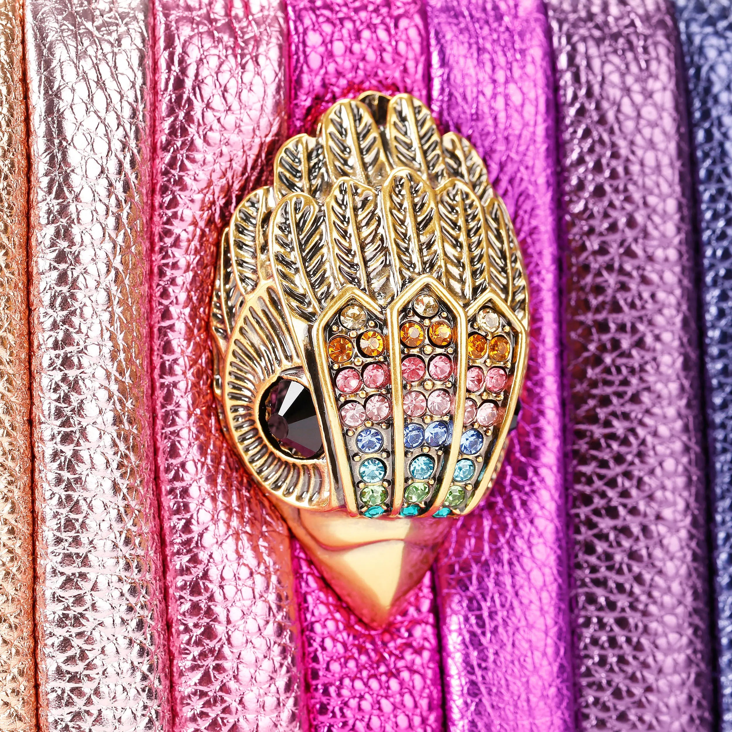 This Kensington Cross Body Bag is crafted from a pebble grained leather in a new edition of the Kensington rainbow stripe. here is a large antiqued brass eagle head on the front. There are two magnetic pockets on either side of the zipped compartment.