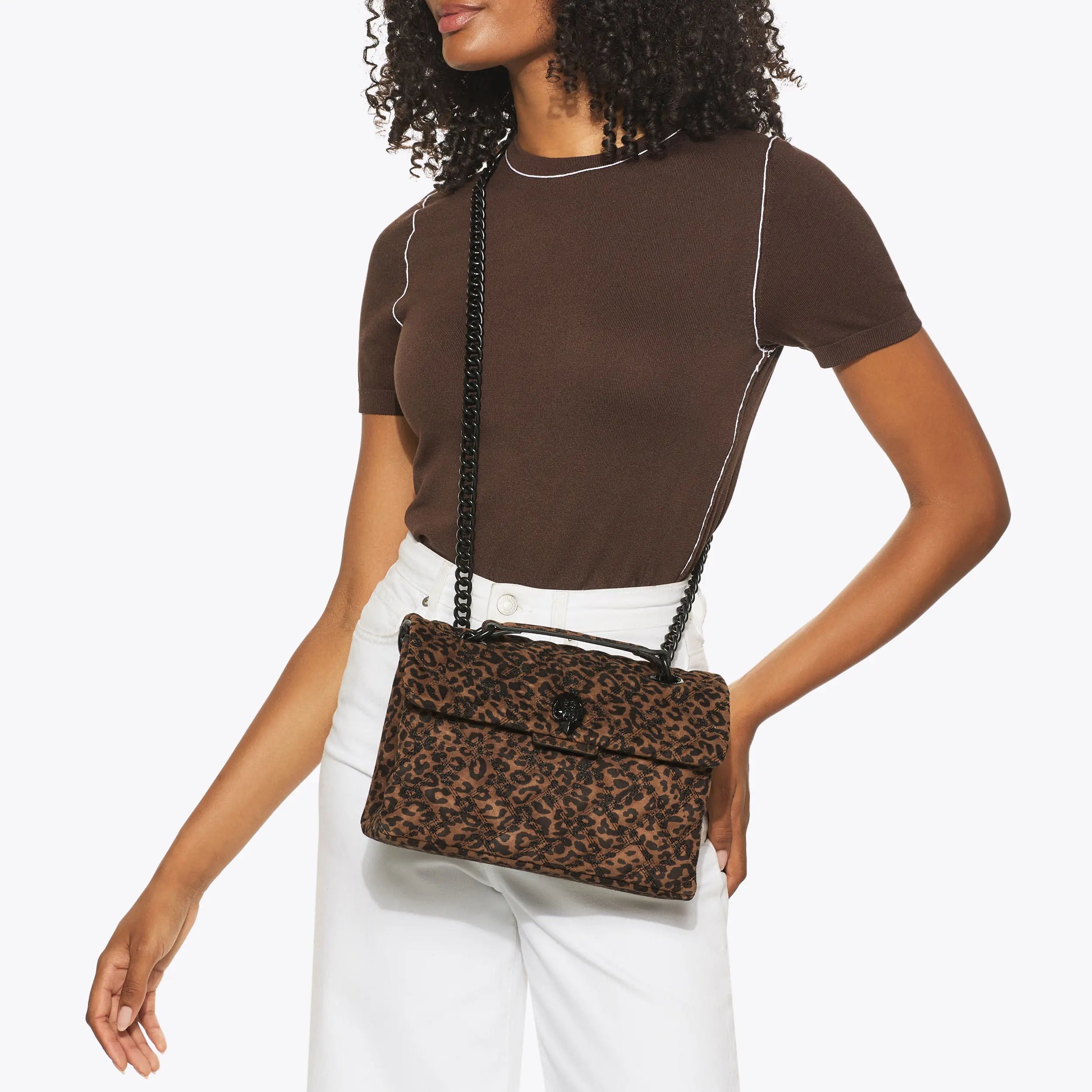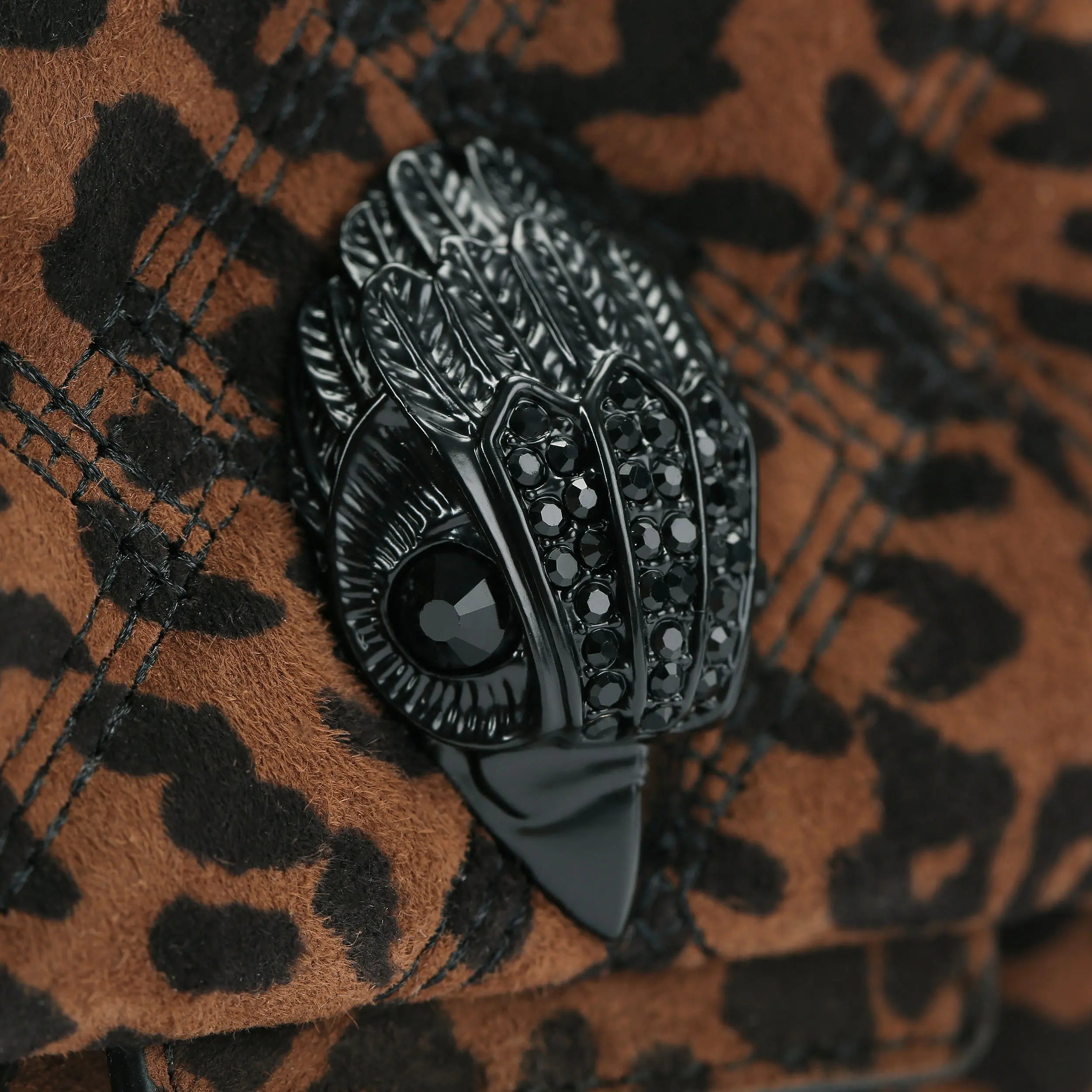 The Leather Kensington bag is crafted from a leopard printed brown suede with black overstitch quilting. The black metal eagle head features crystals and black bead eyes on the front flap.