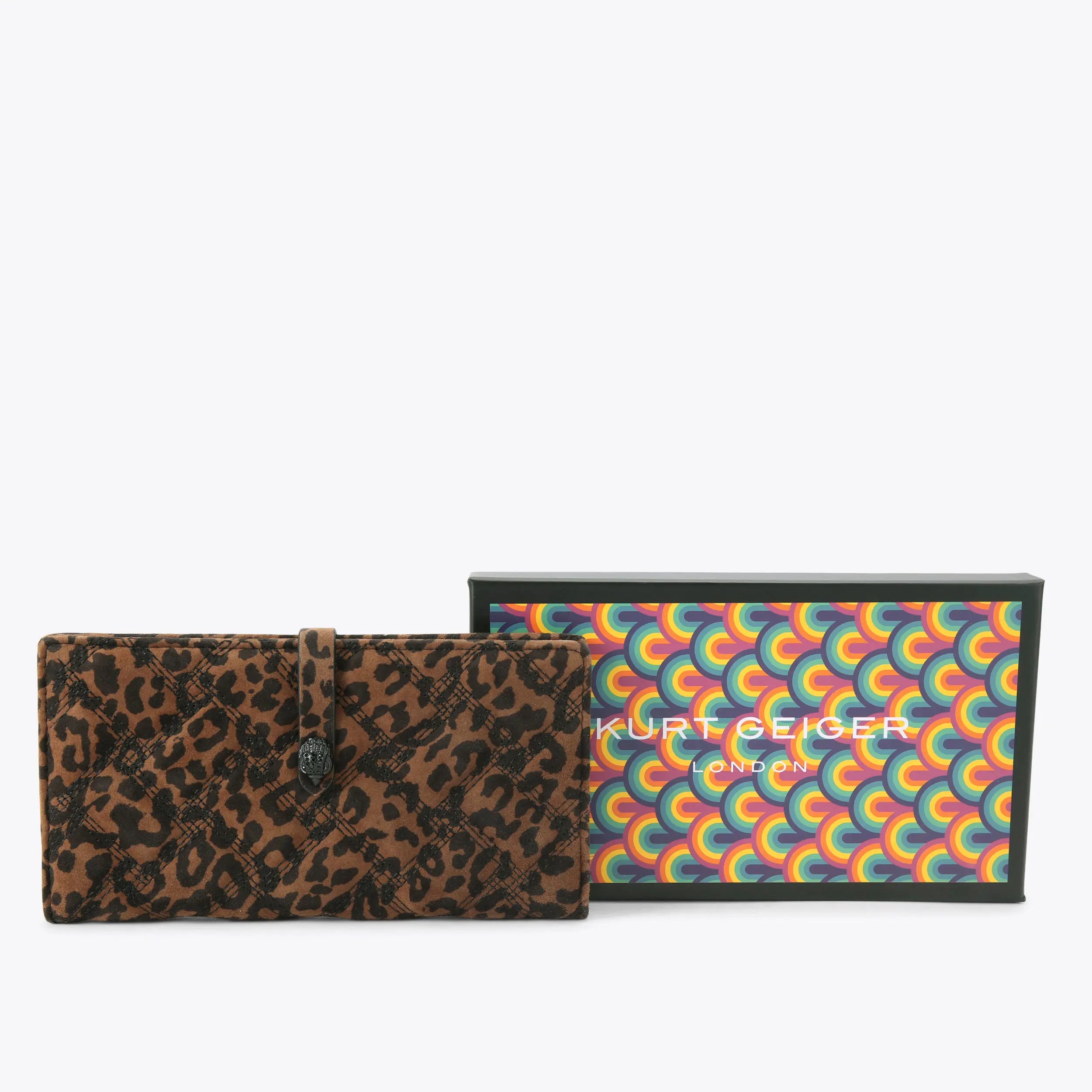 The Soft Wallet is crafted from a leopard printed suede leather with overstitch quilting. The black eagle head features crystals and black bead eyes on the front flap.