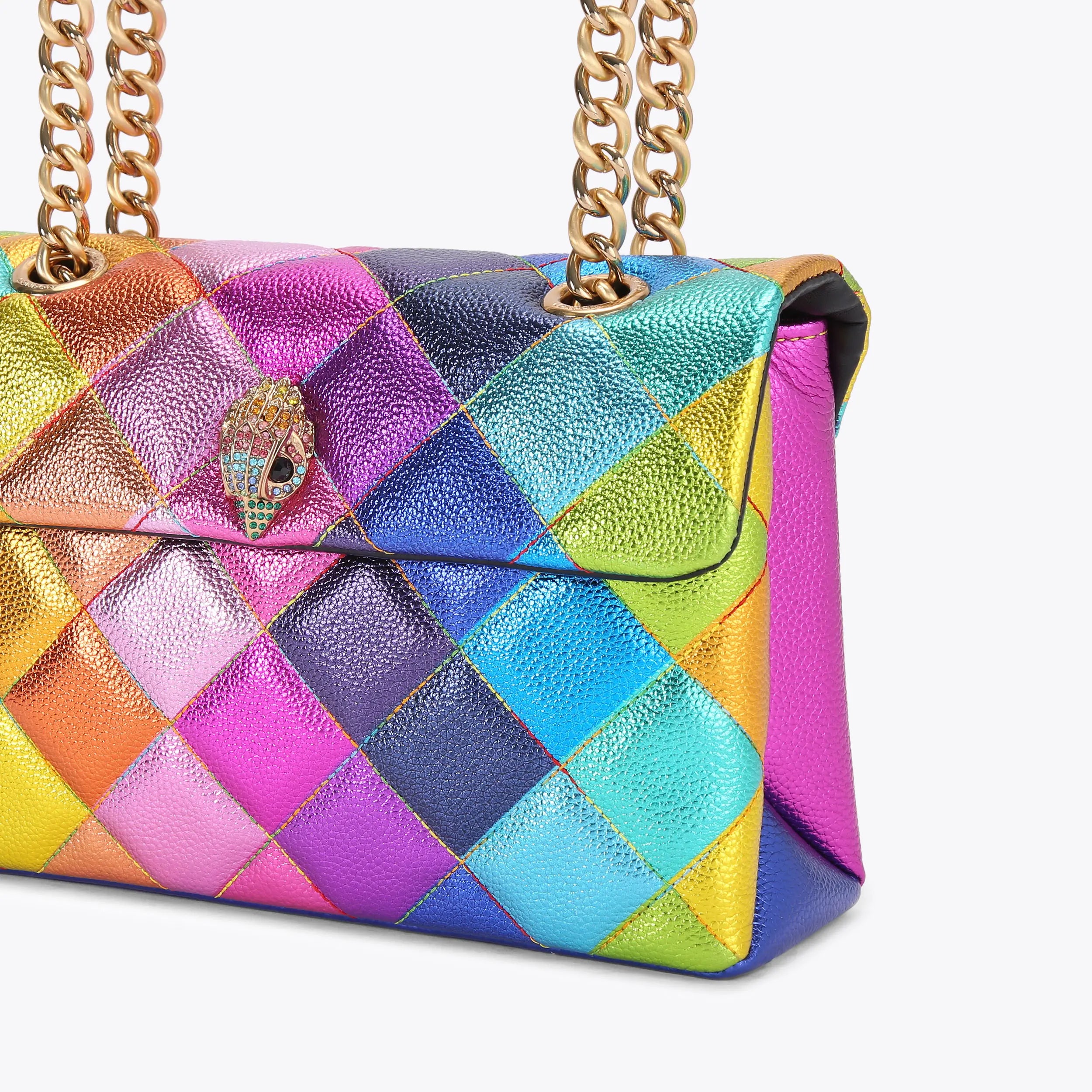 This Kensington Purse is crafted from a pebble grained leather which is in a diamond design resembling the glass in the flagship Oxford Street store. The gold eagle head features rainbow crystals on the front flap.