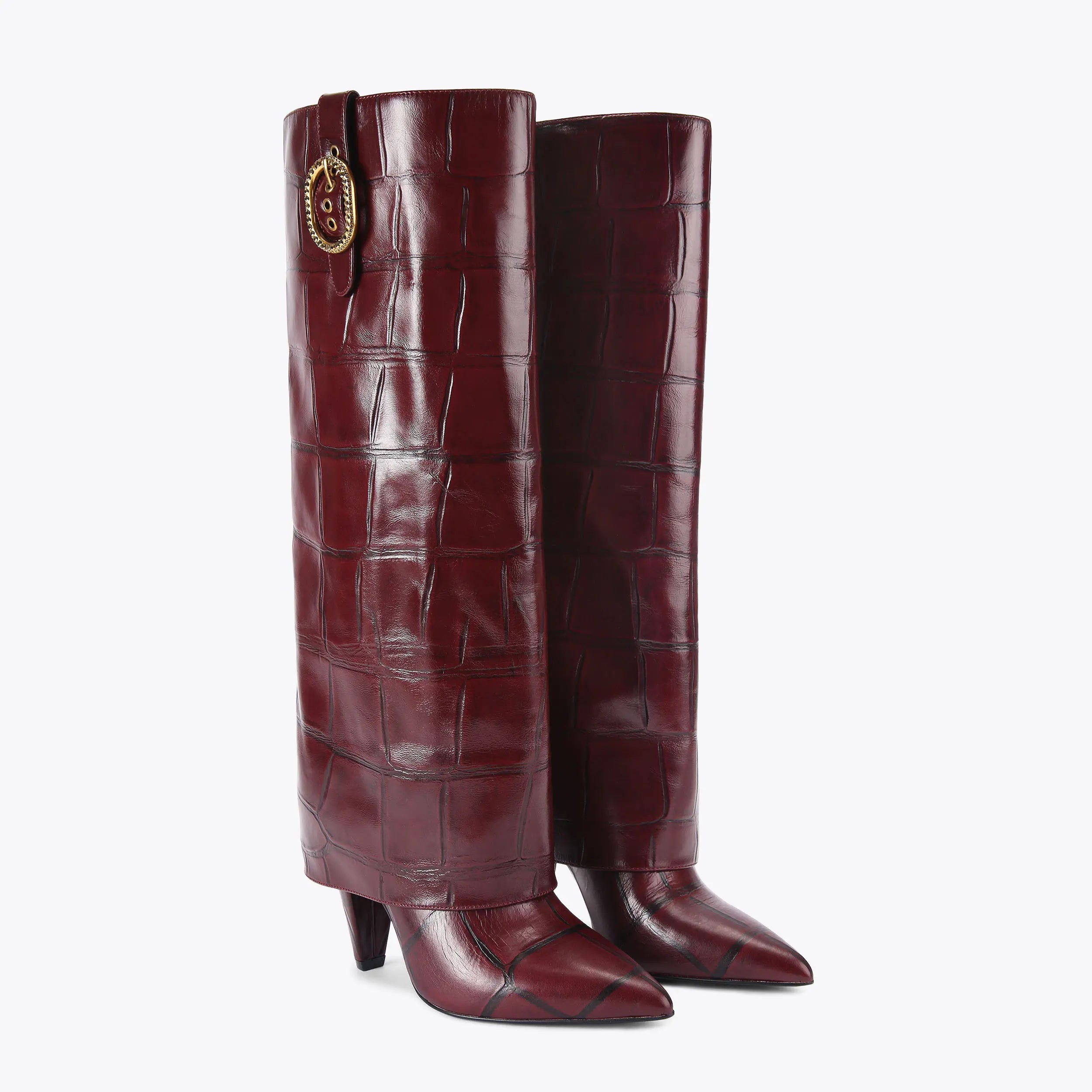 This Fold Over Tall Boot features a high ankle shaft which is embossed in enlarged croc print. There is an antiqued brass buckle on the outer side of the ankle and the heel is in a cone style.