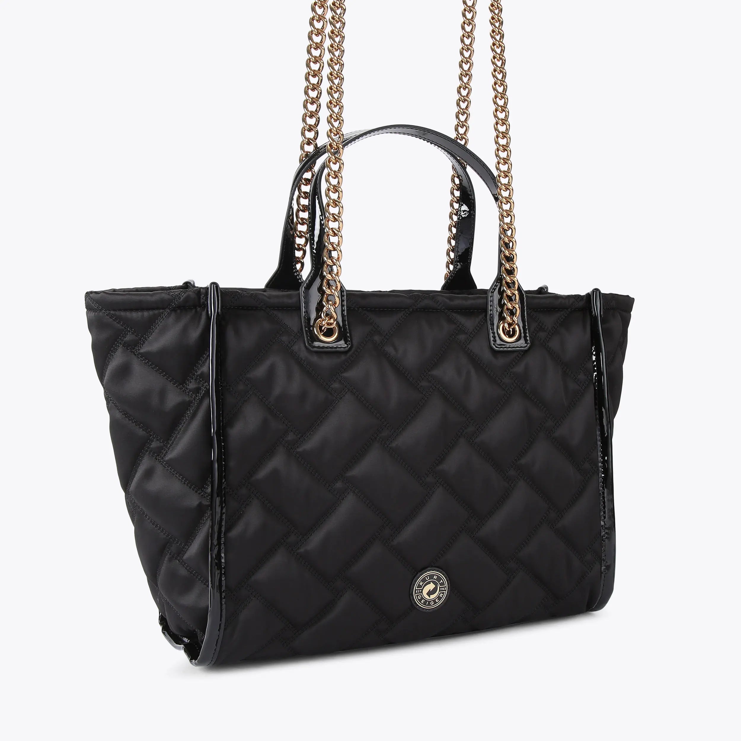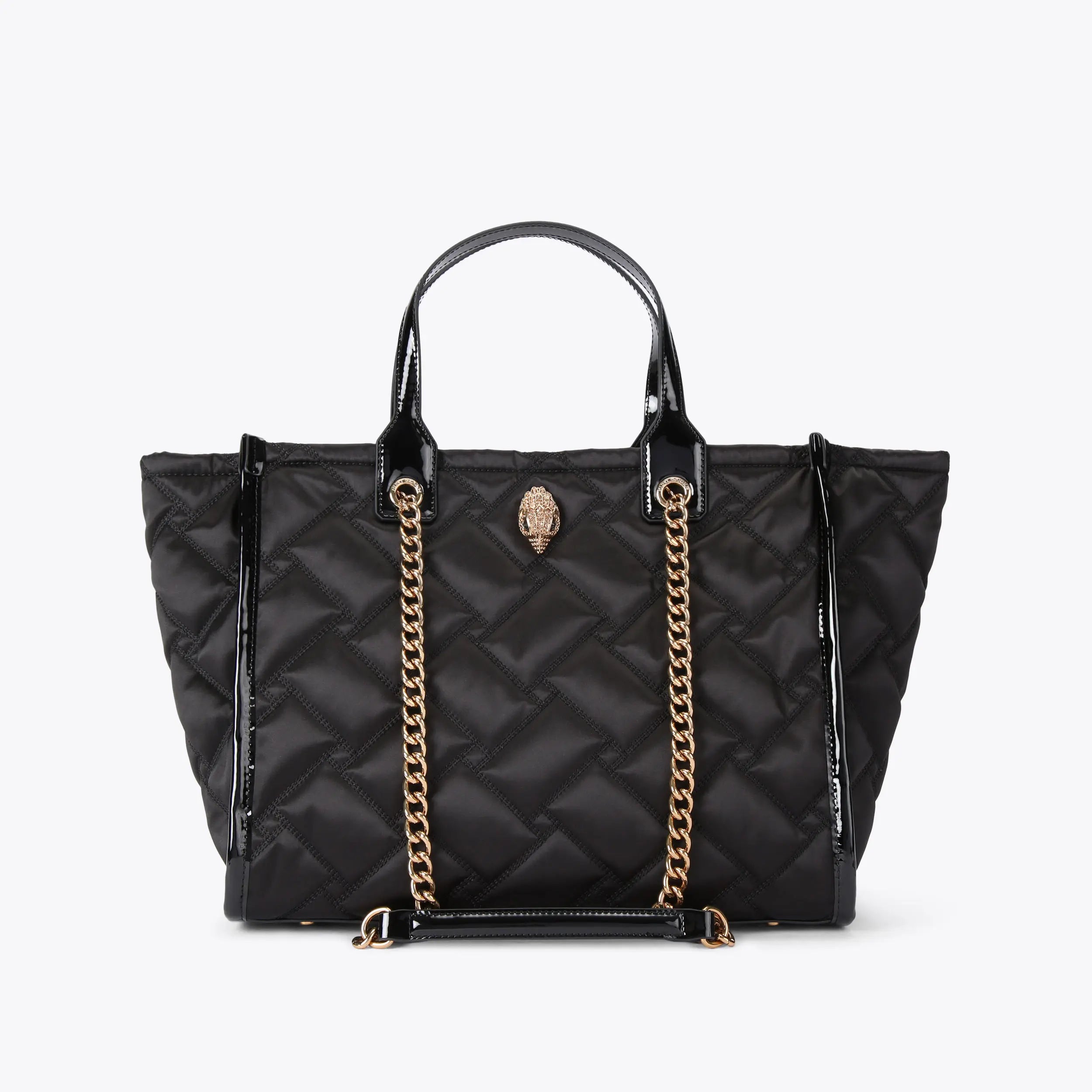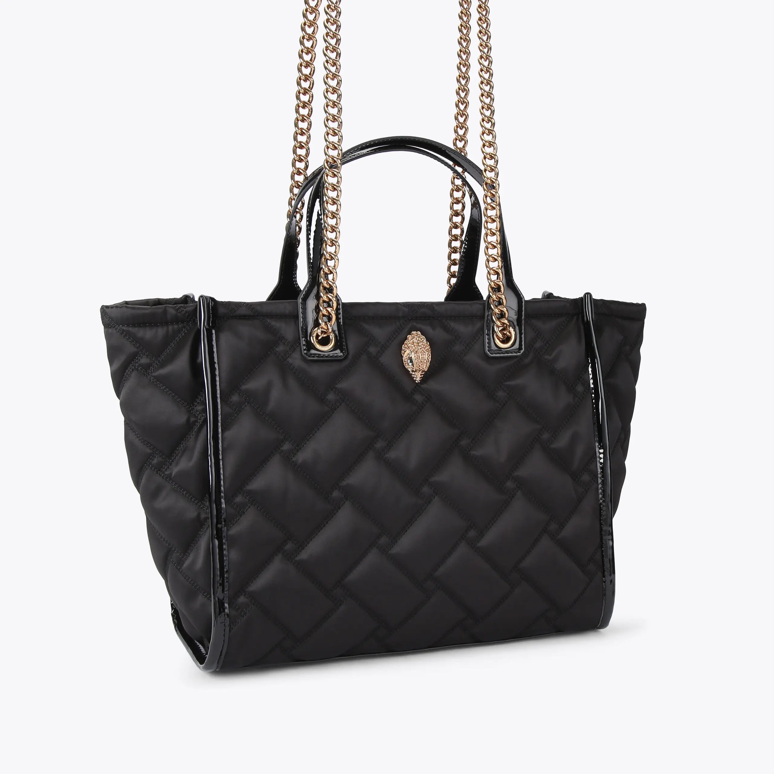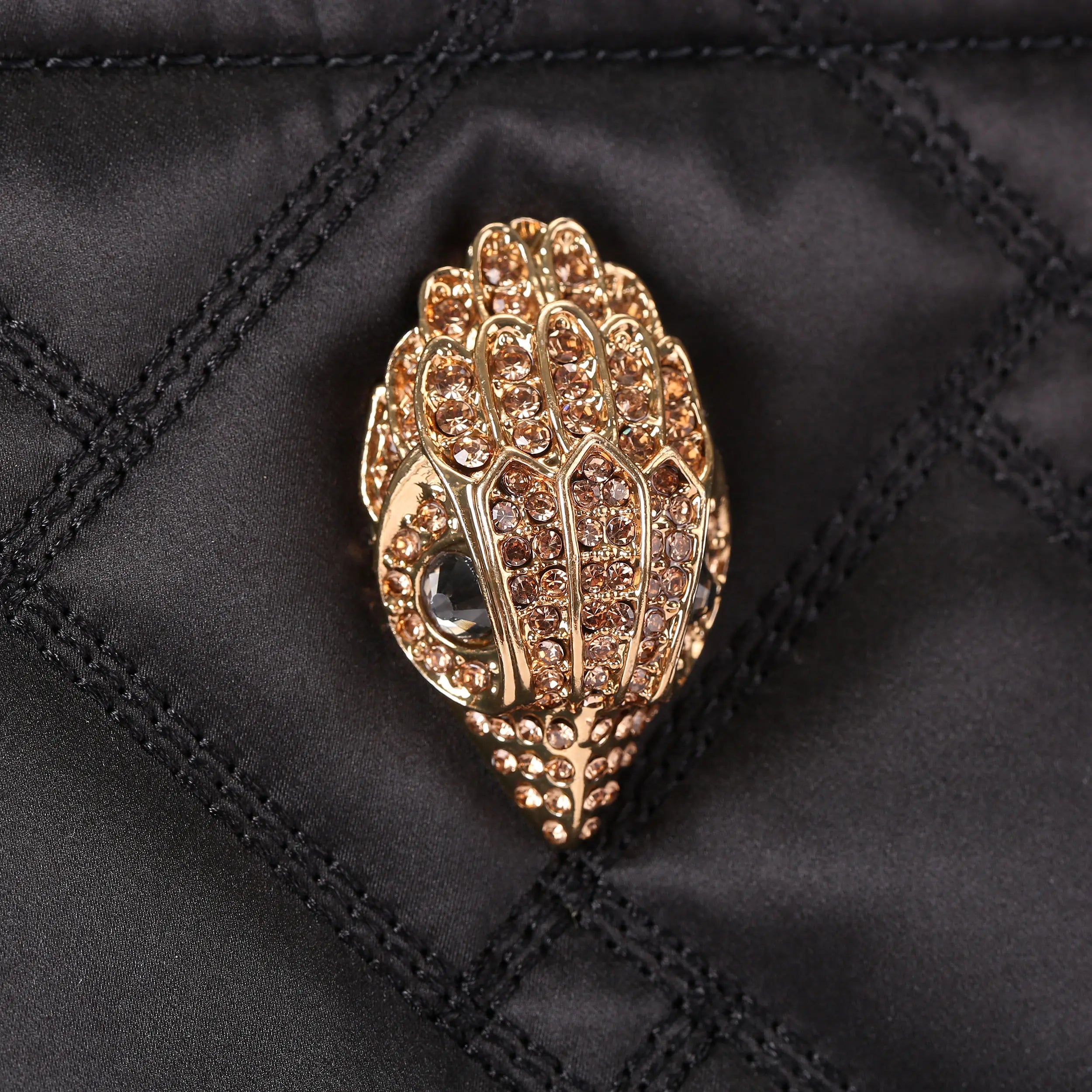 This Hoxton Shopper is a black nylon shopper purse with overstitch quilting. There is a gold crystal embellished eagle head sat on the front of the purse.