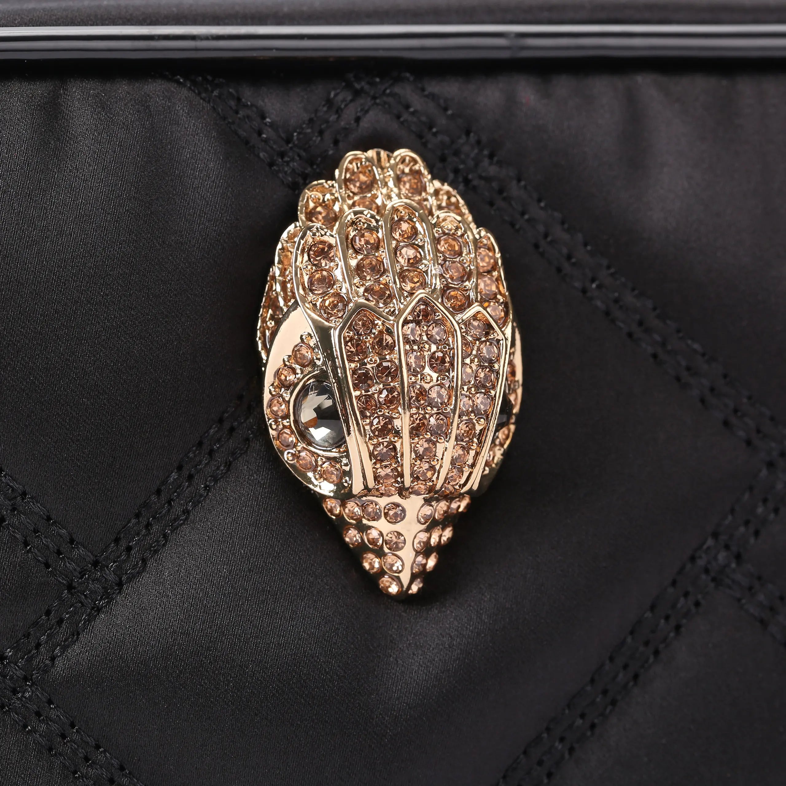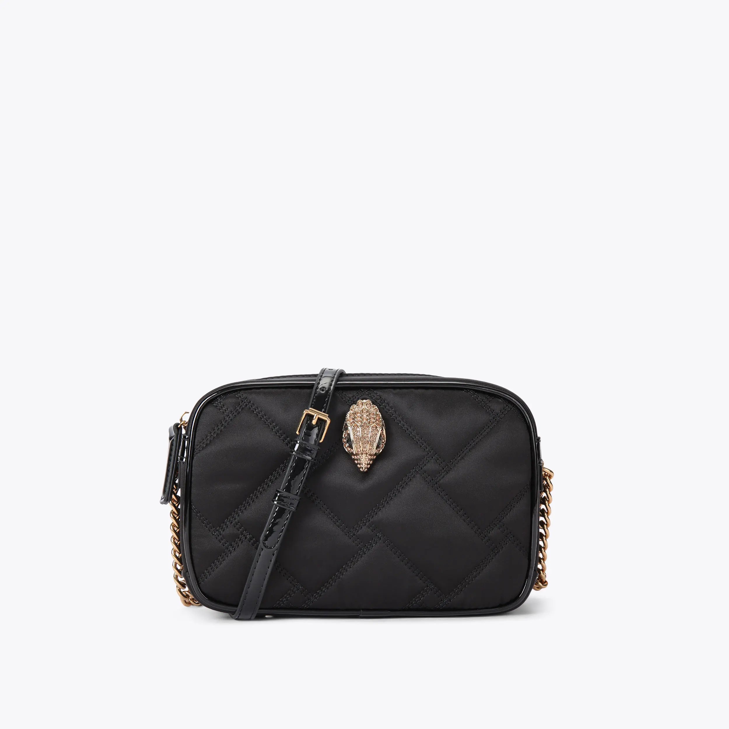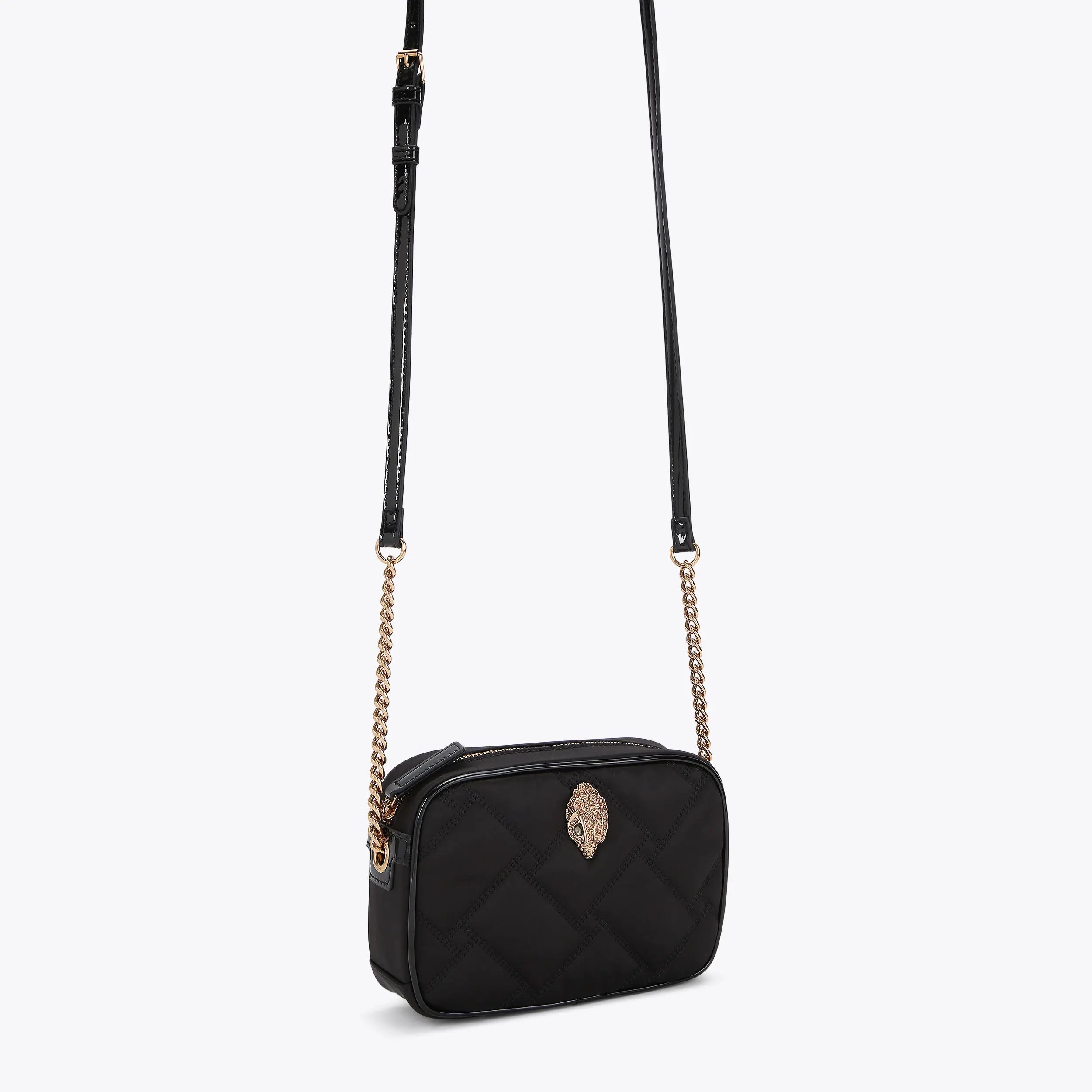 This Hoxton Camera is a cross body camera bag crafted from a black recycled nylon. There is a large gold eagle head sat on the front of the bag and a recycled branding badge on the back.
