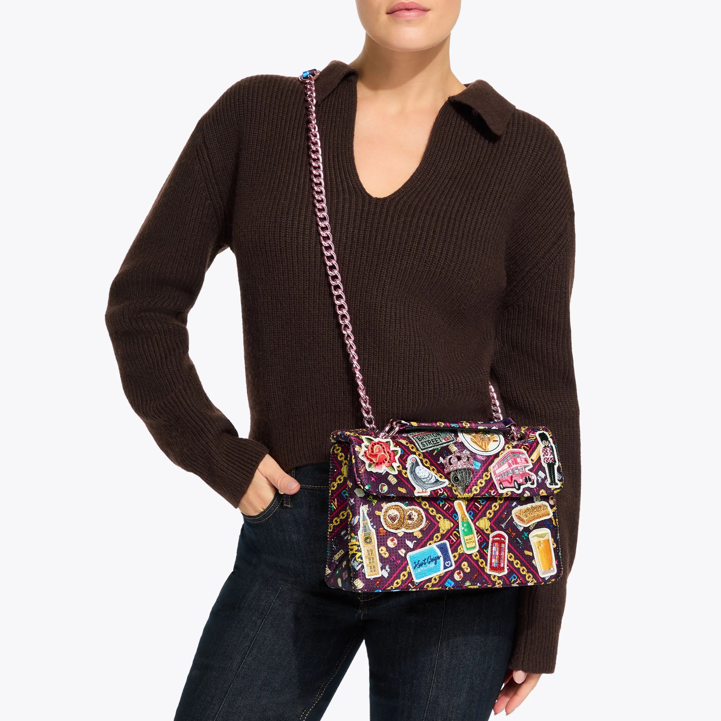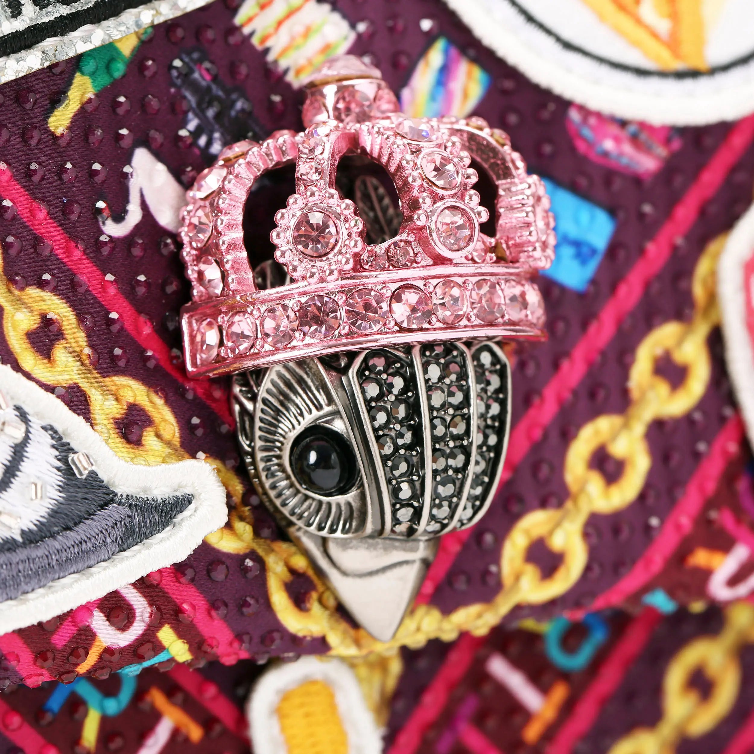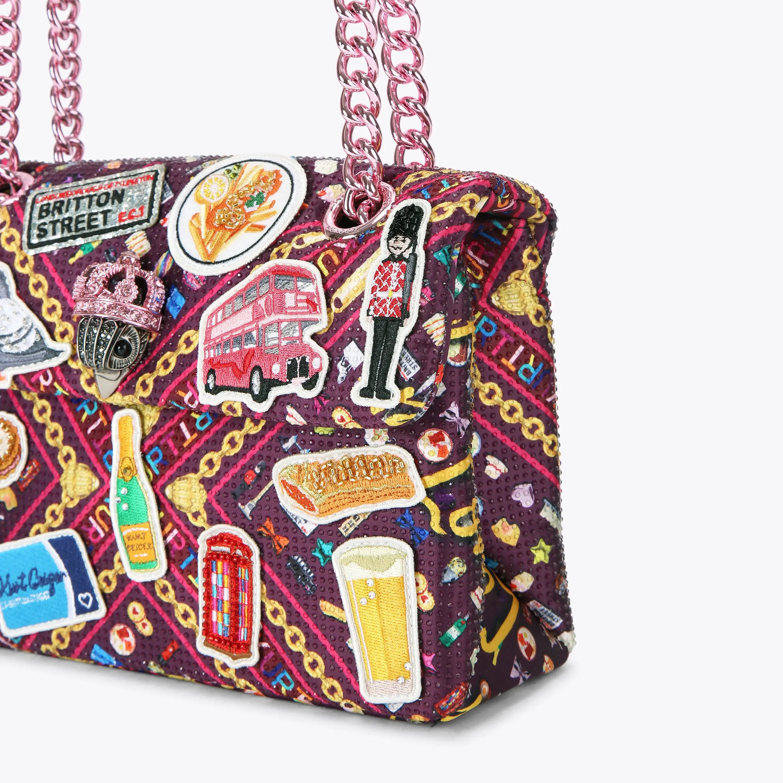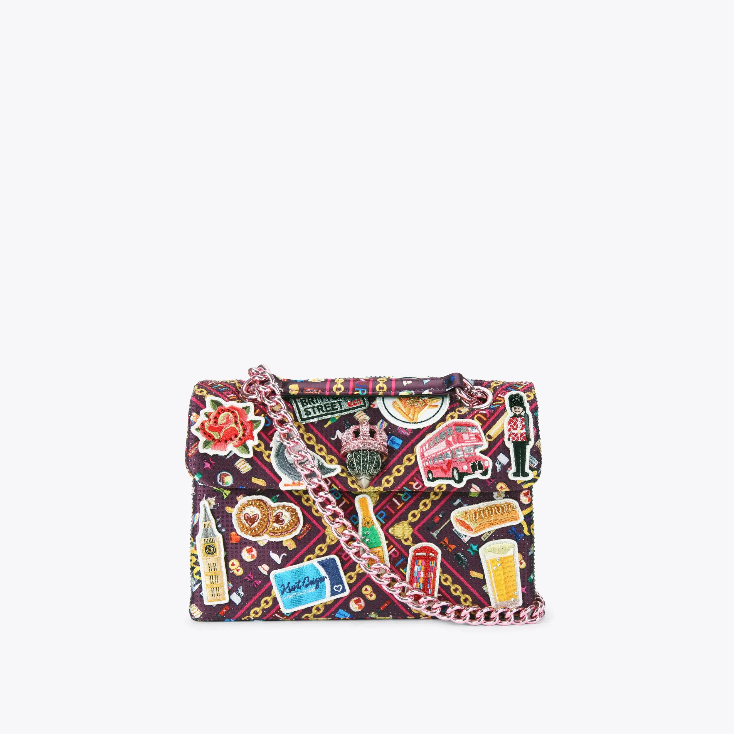The London Kensington purse features a purple Kurt Geiger printed satin which is embellished with clear crystals. There are fabric patches of iconic British symbols. The antiqued silver eagle head features a pink crown on the front flap.