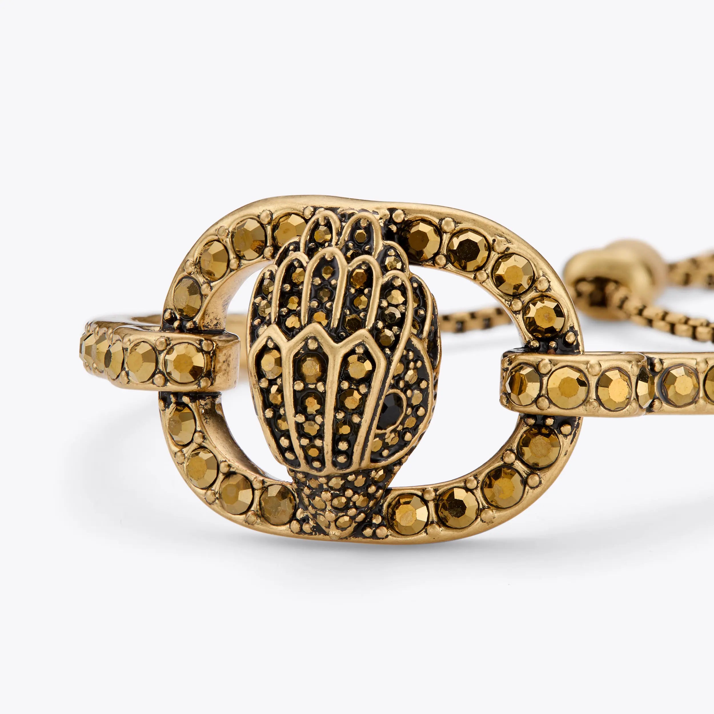 This Chelsea Bracelet is comprised of an antiqued brass structured bangle with crystal embellishment. There is an oval trim with eagle head at the centre to sit at the top of the wrist.