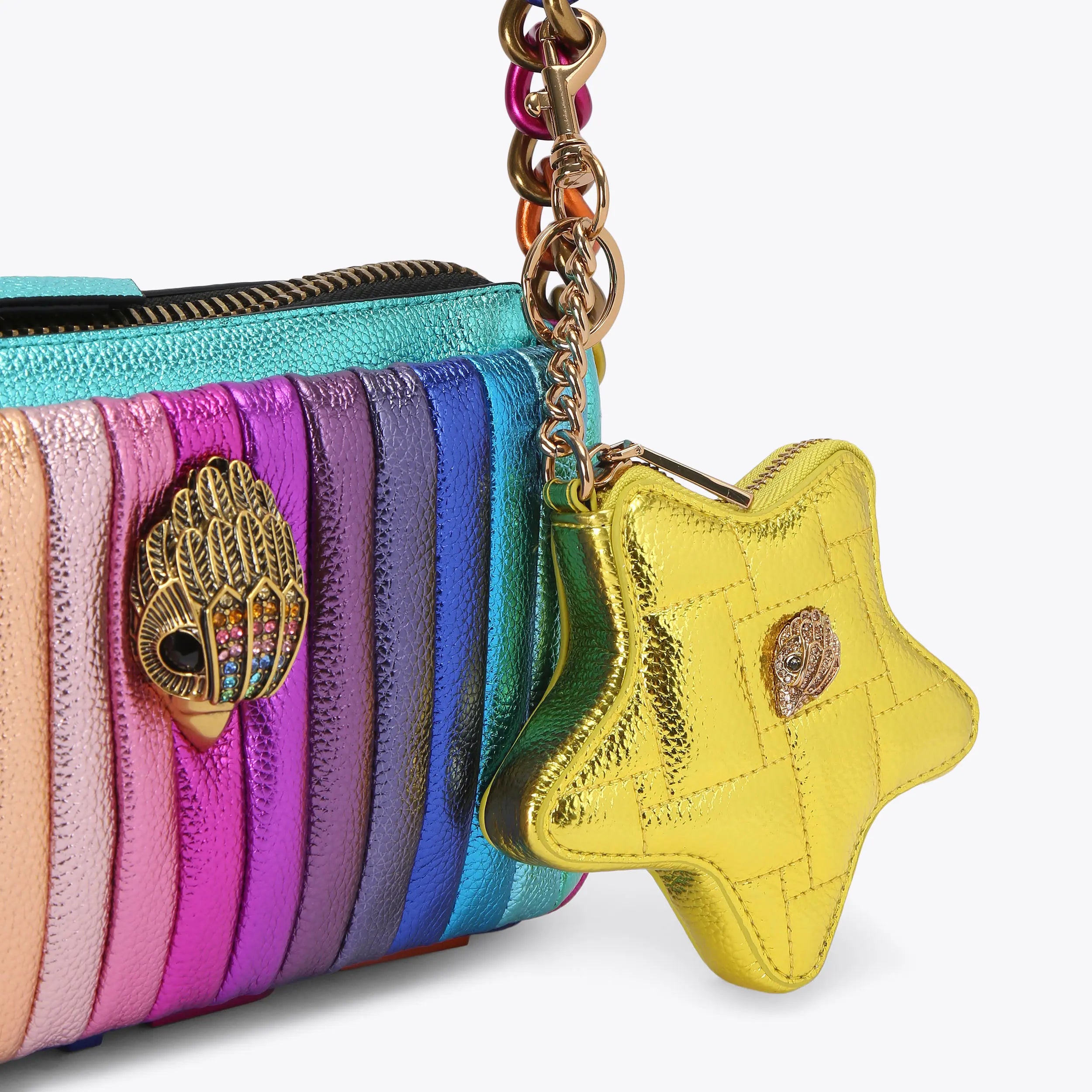 This Kensington Star charm is a micro star purse charm crafted in a metallic yellow pebble grained leather alternative. There is signature overstitch quilting across the exterior and the front features a gold eagle head.