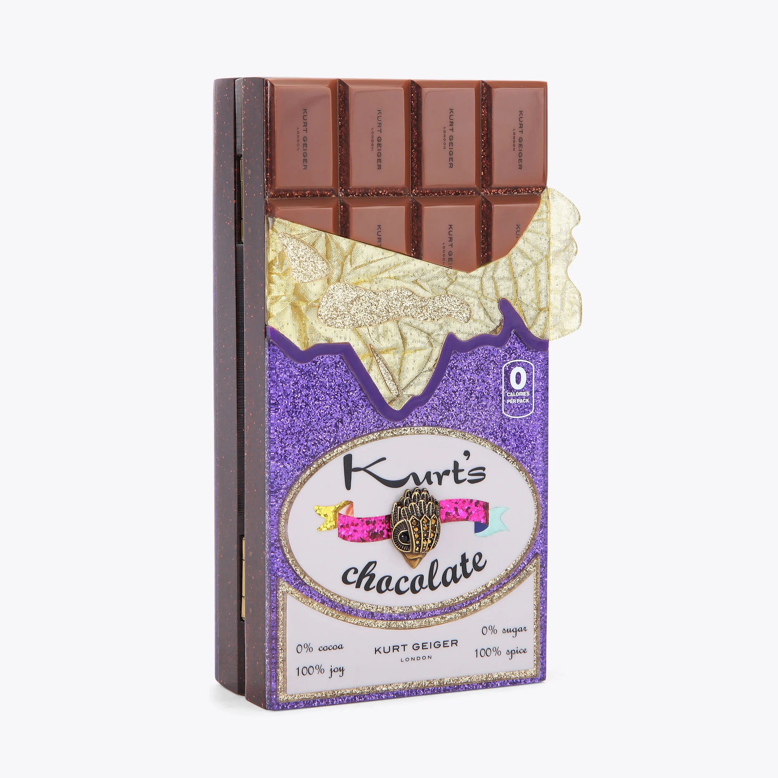 This Chocolate Clutch features a statement acrylic exterior which is crafted to imitate an unwrapped chocolate bar with Kurt Geiger branding.