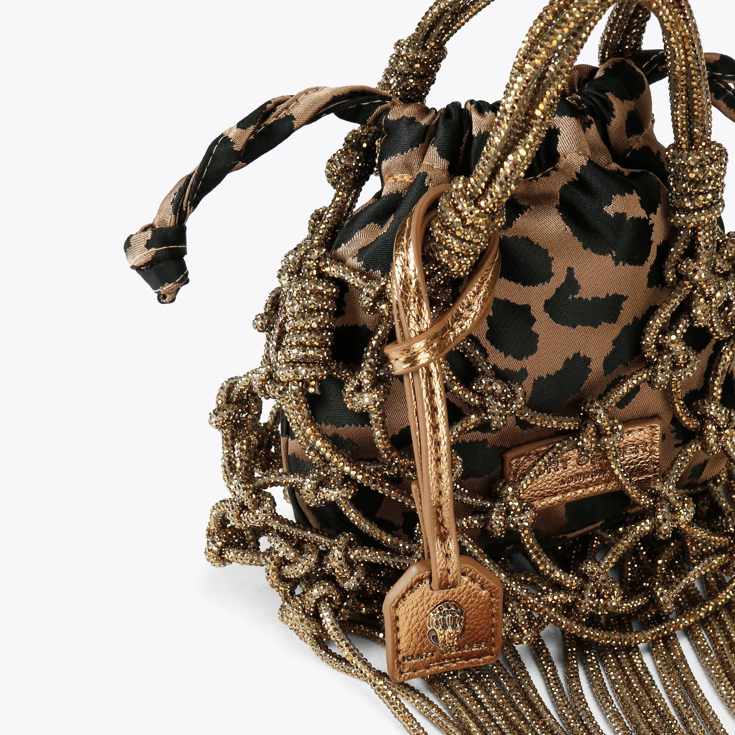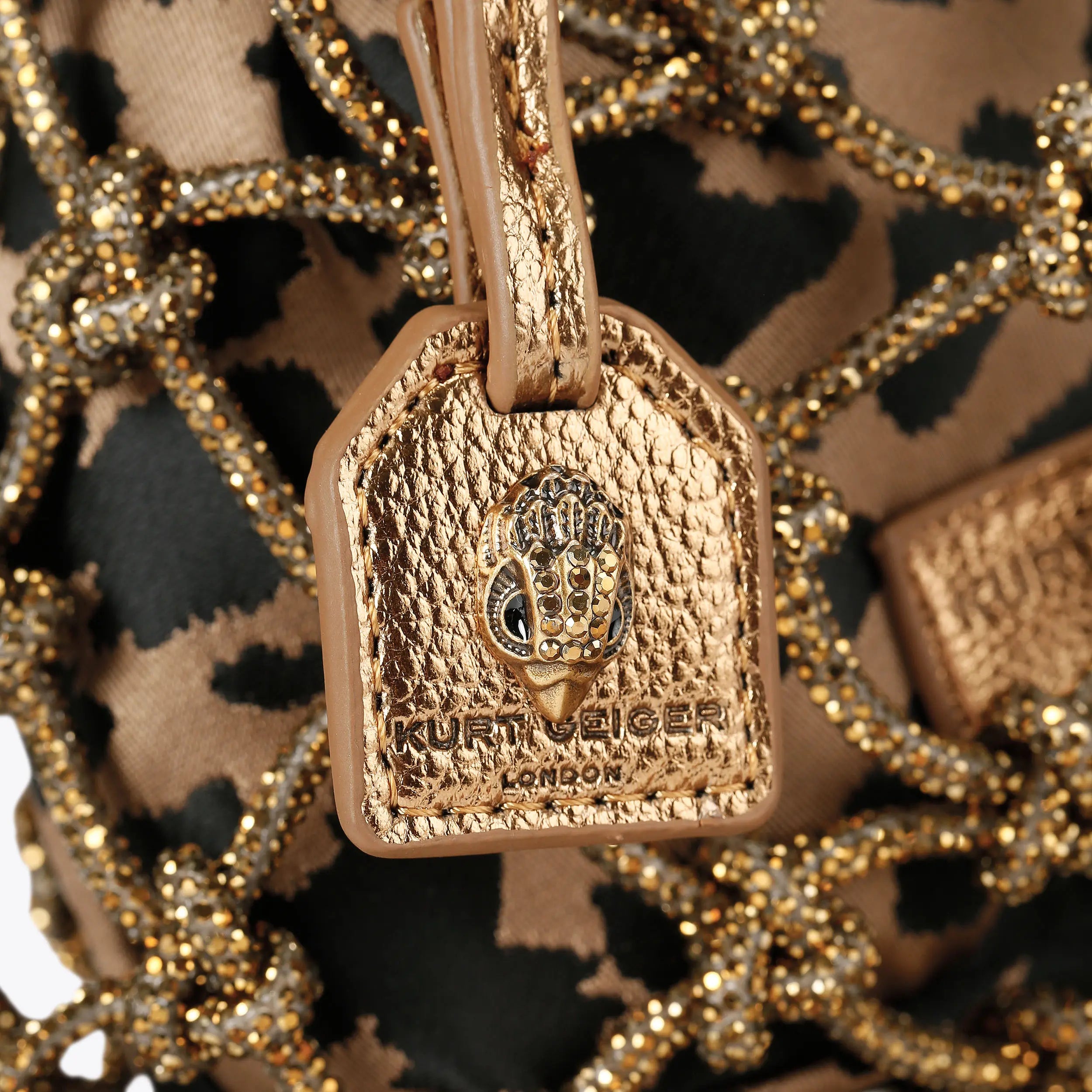 This Mini Macrame crystal purse has a gold crystal embellishment across the knotted structure. There is a crystal antiqued brass eagle head on the luggage tag.