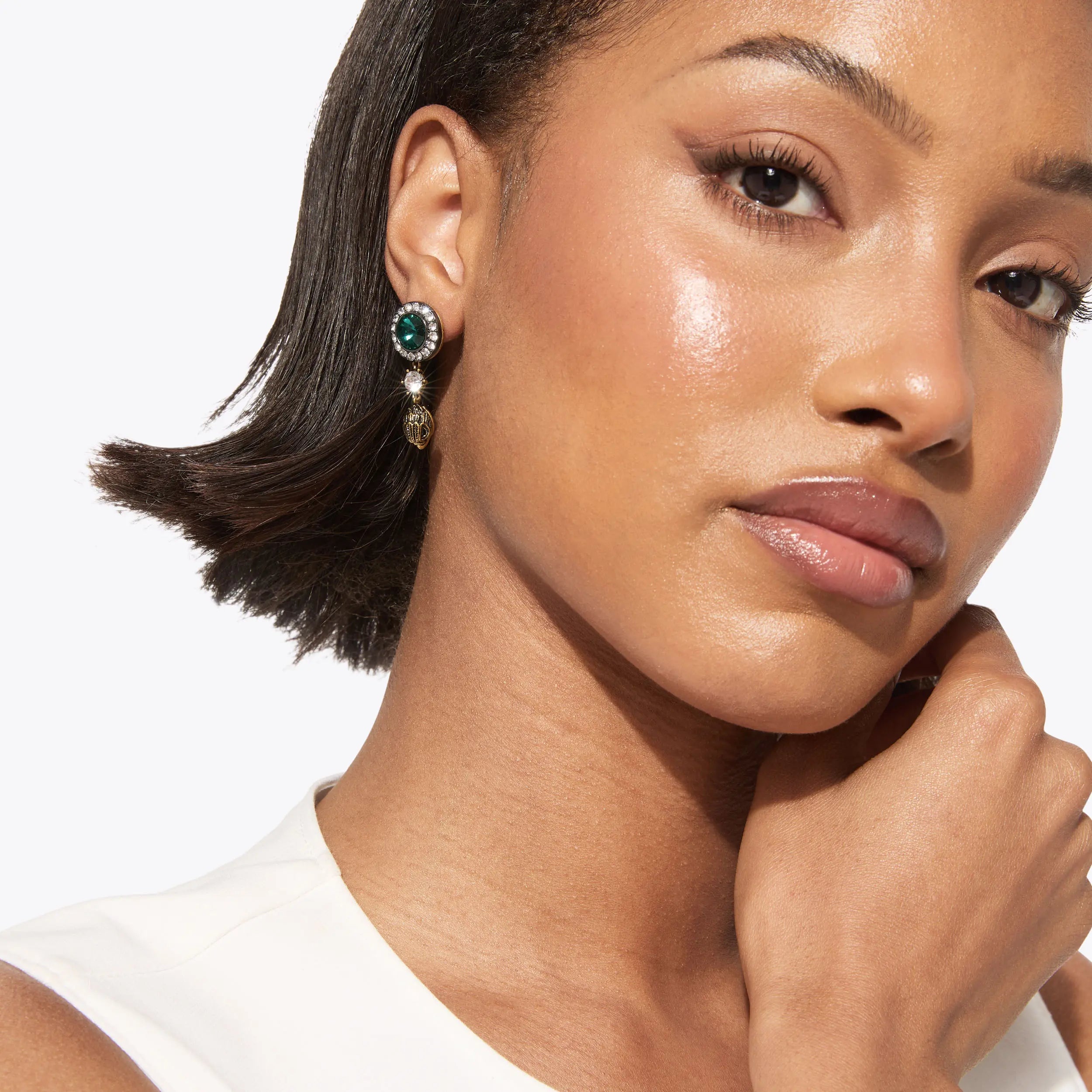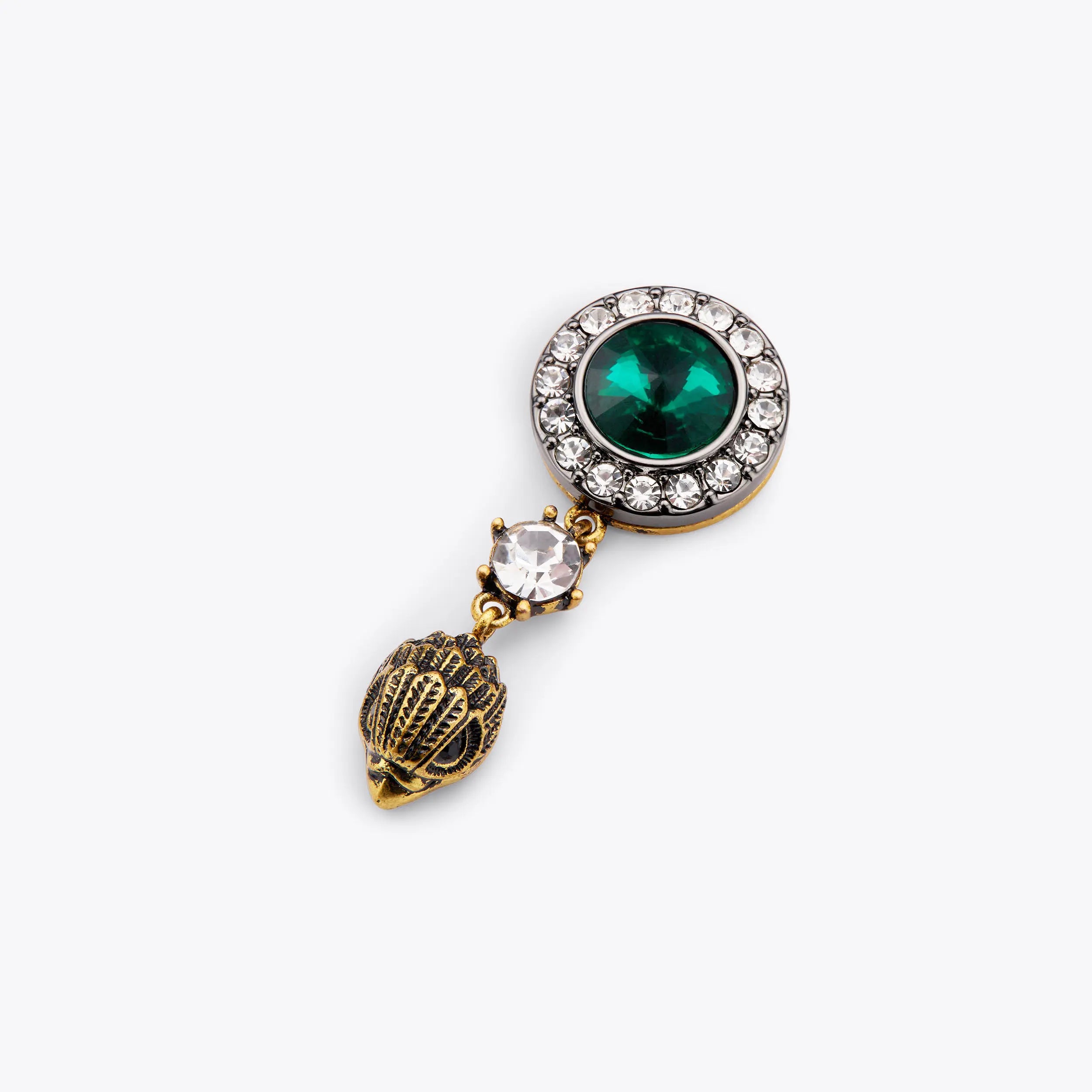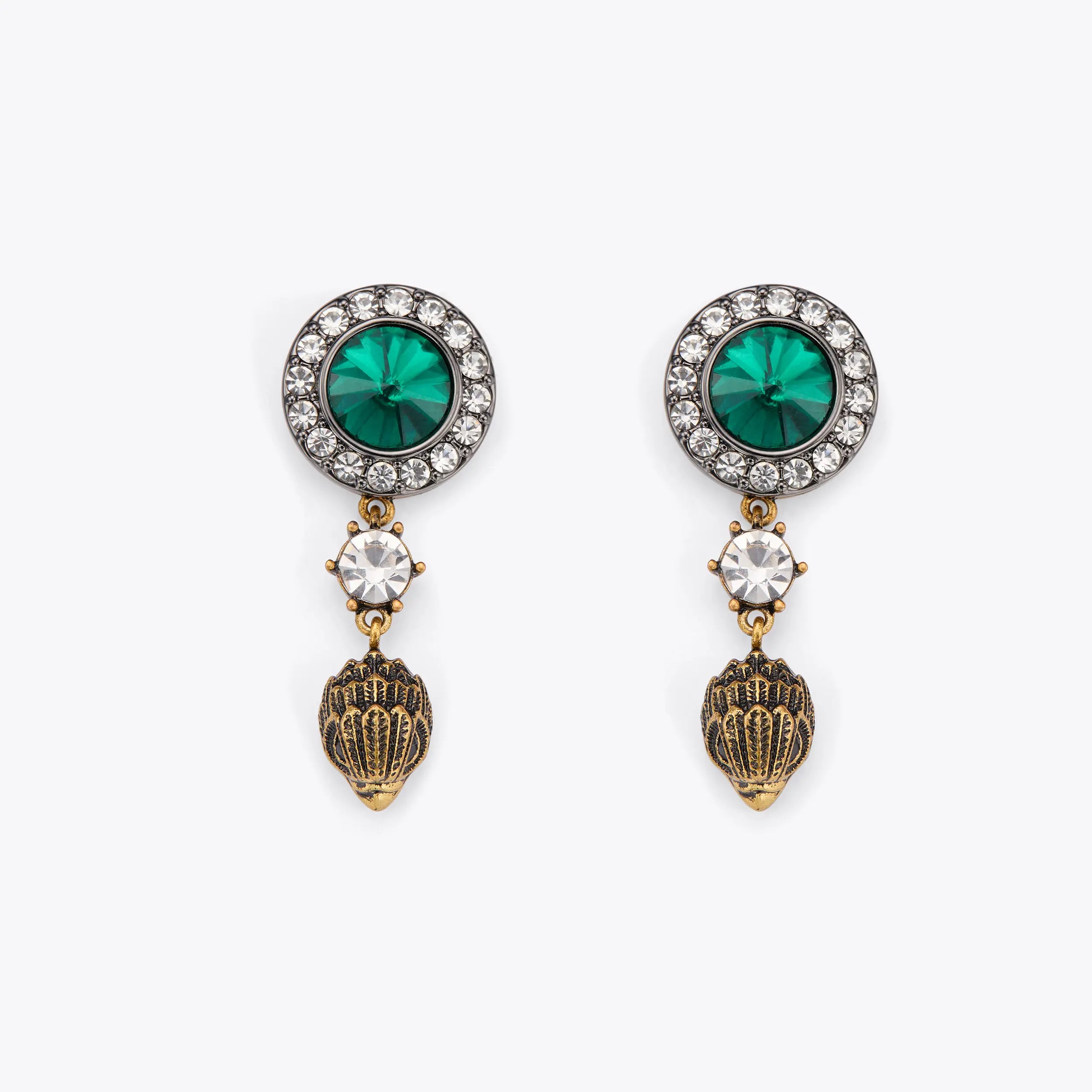 This pair of Octavia Eagle Earrings have a large green crystal studs as well as an antiqued bras eagle head drop charm with simple crystal between.
