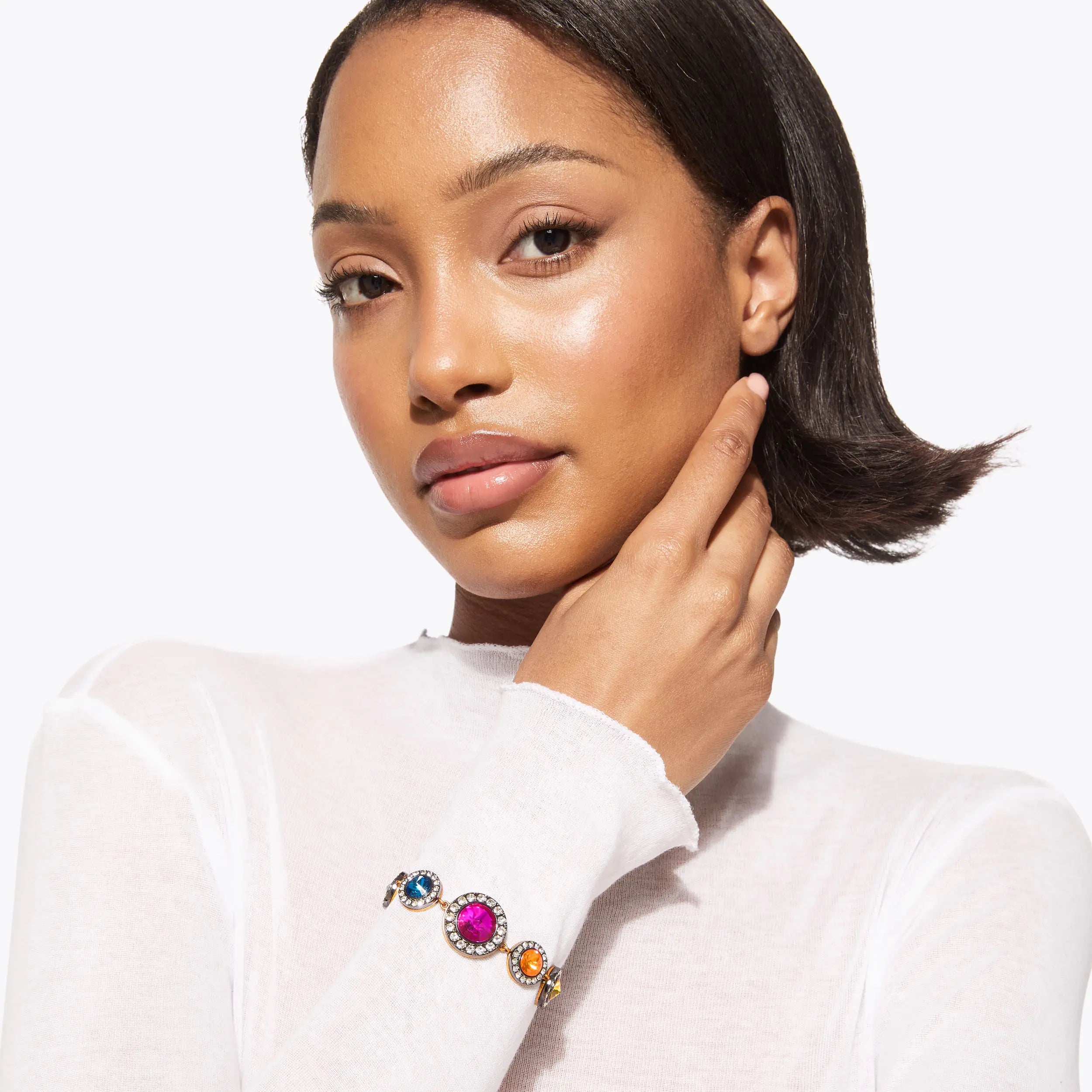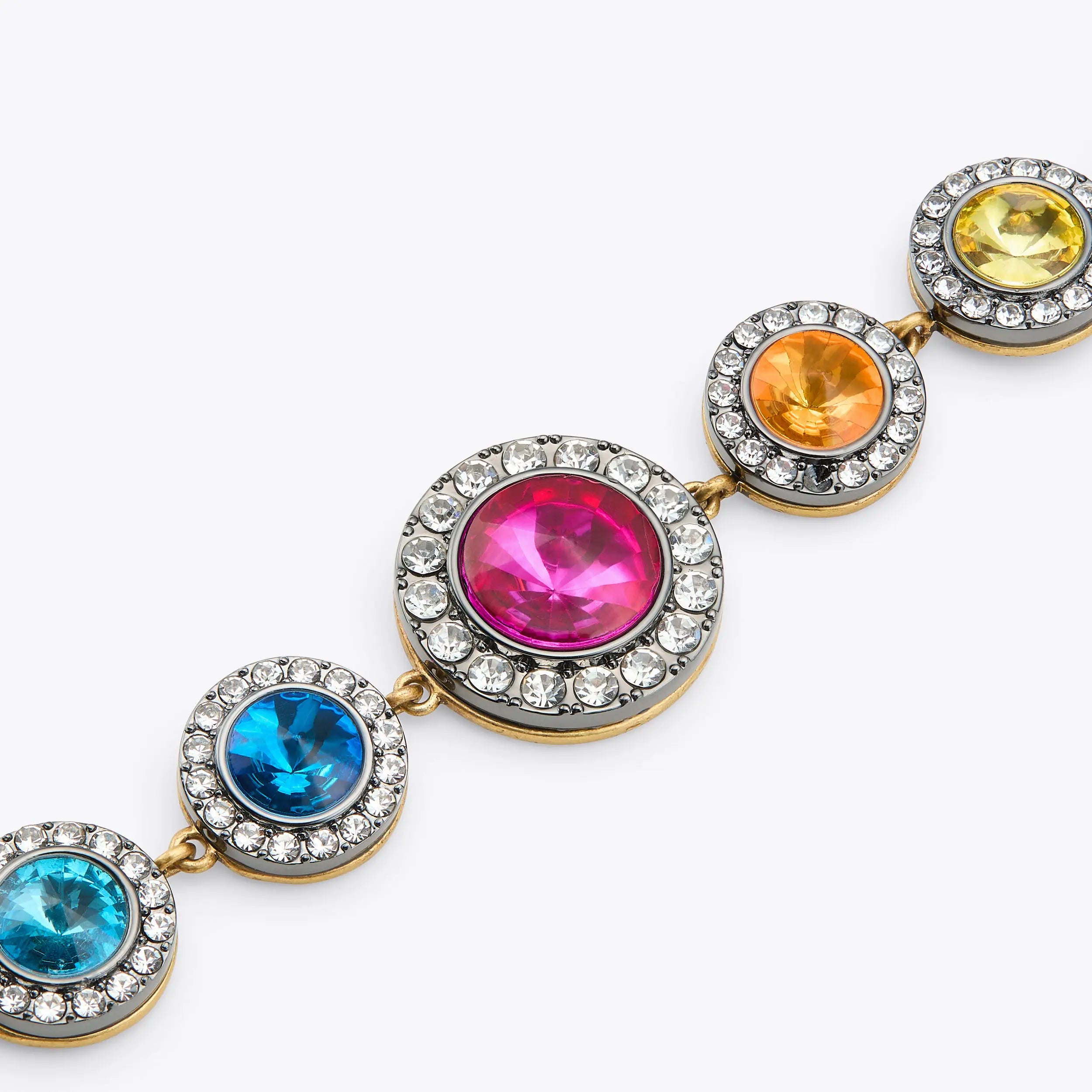 This Octavia Bracelet adds a colourful twist to an accessories collection. The gold chain is accented with multiple large coloured gemstones.