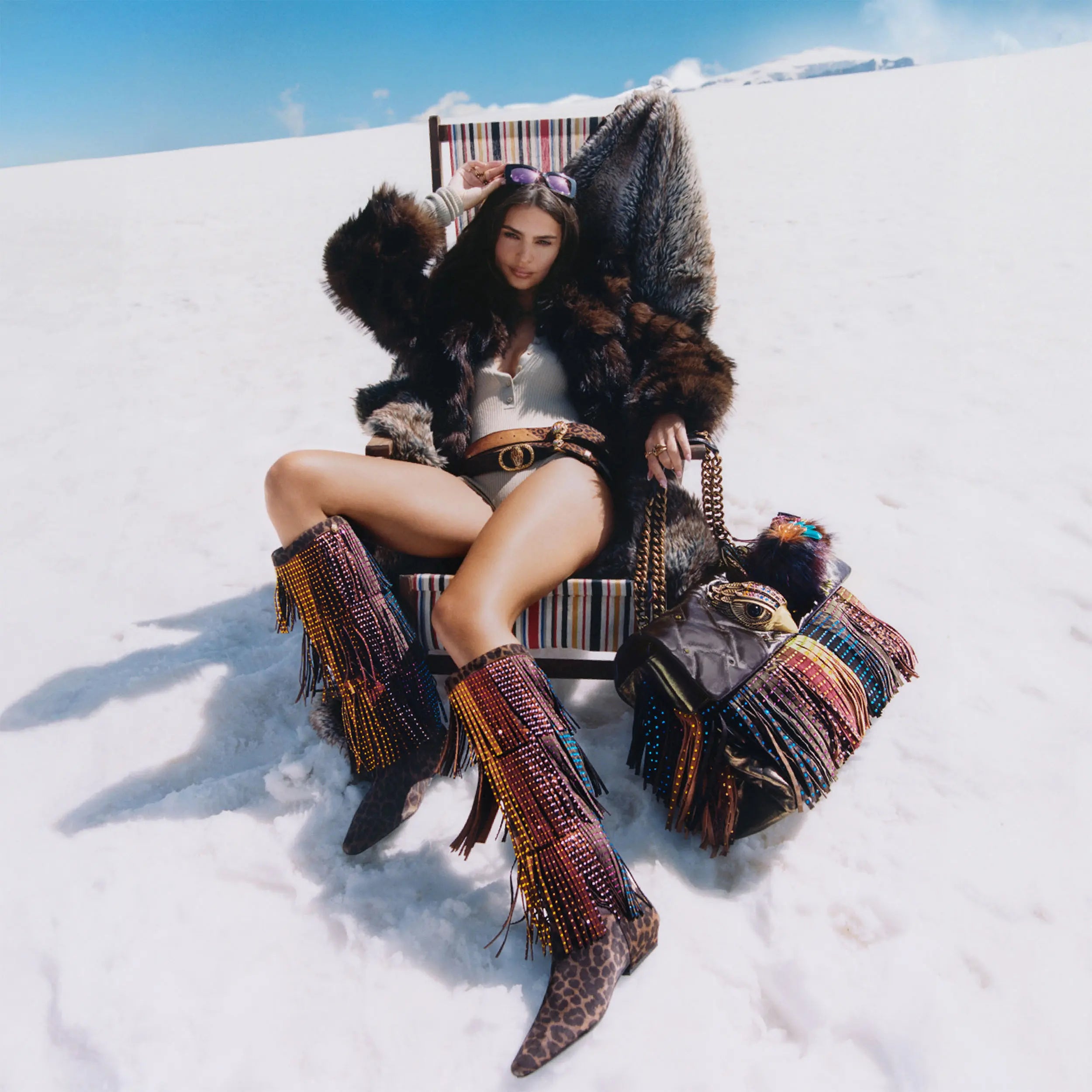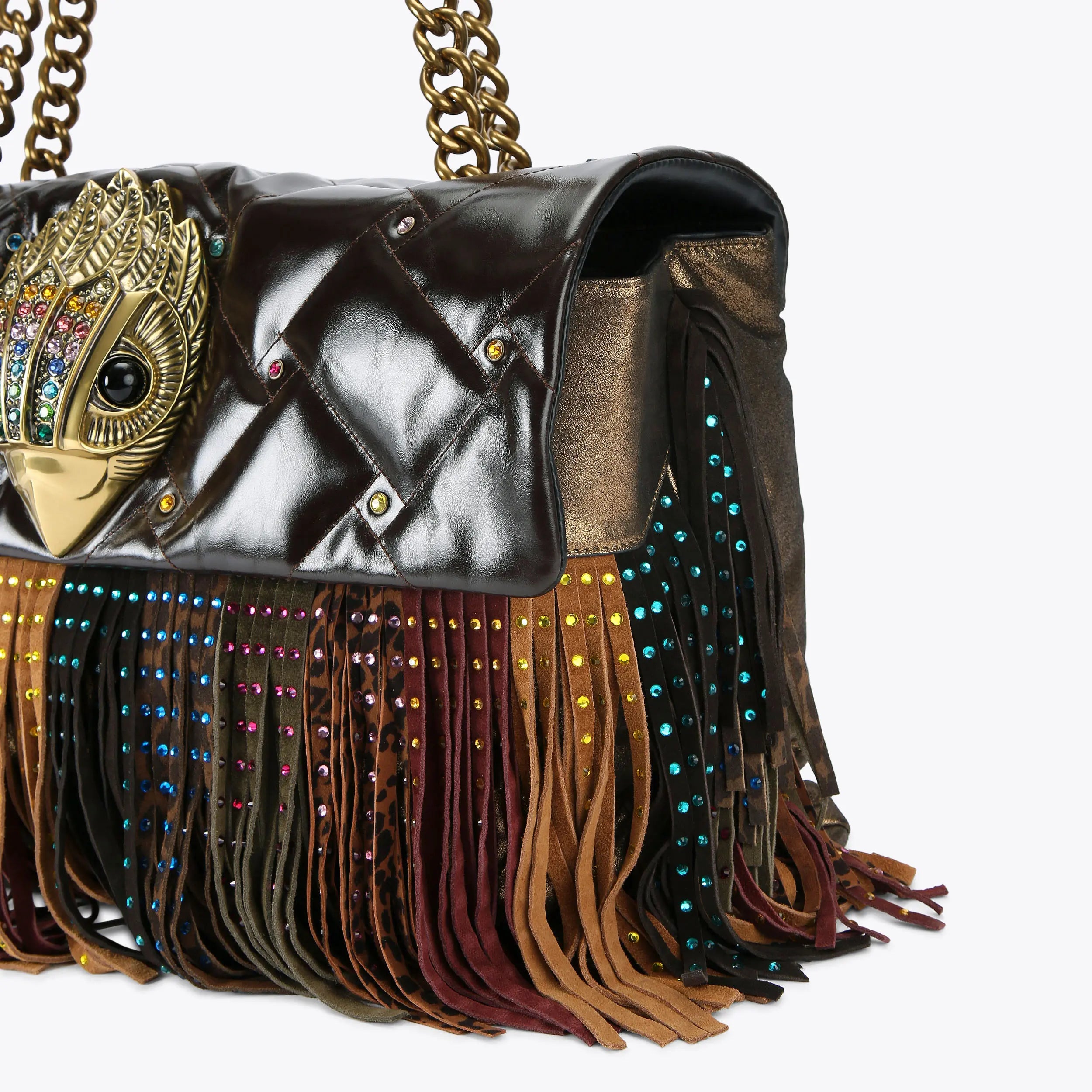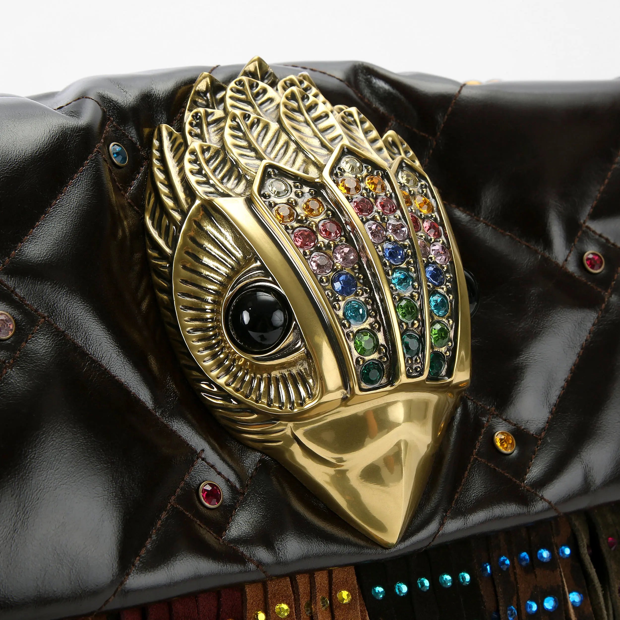 The Macro Kensington Bag is crafted from a deep brown leather on the flat and a metal bronze leather on the base. There is a suede tassel fringe detail surrounding the base which is embellished with crystals. The XL antiqued brass eagle head features crystals sitting on the front flap.