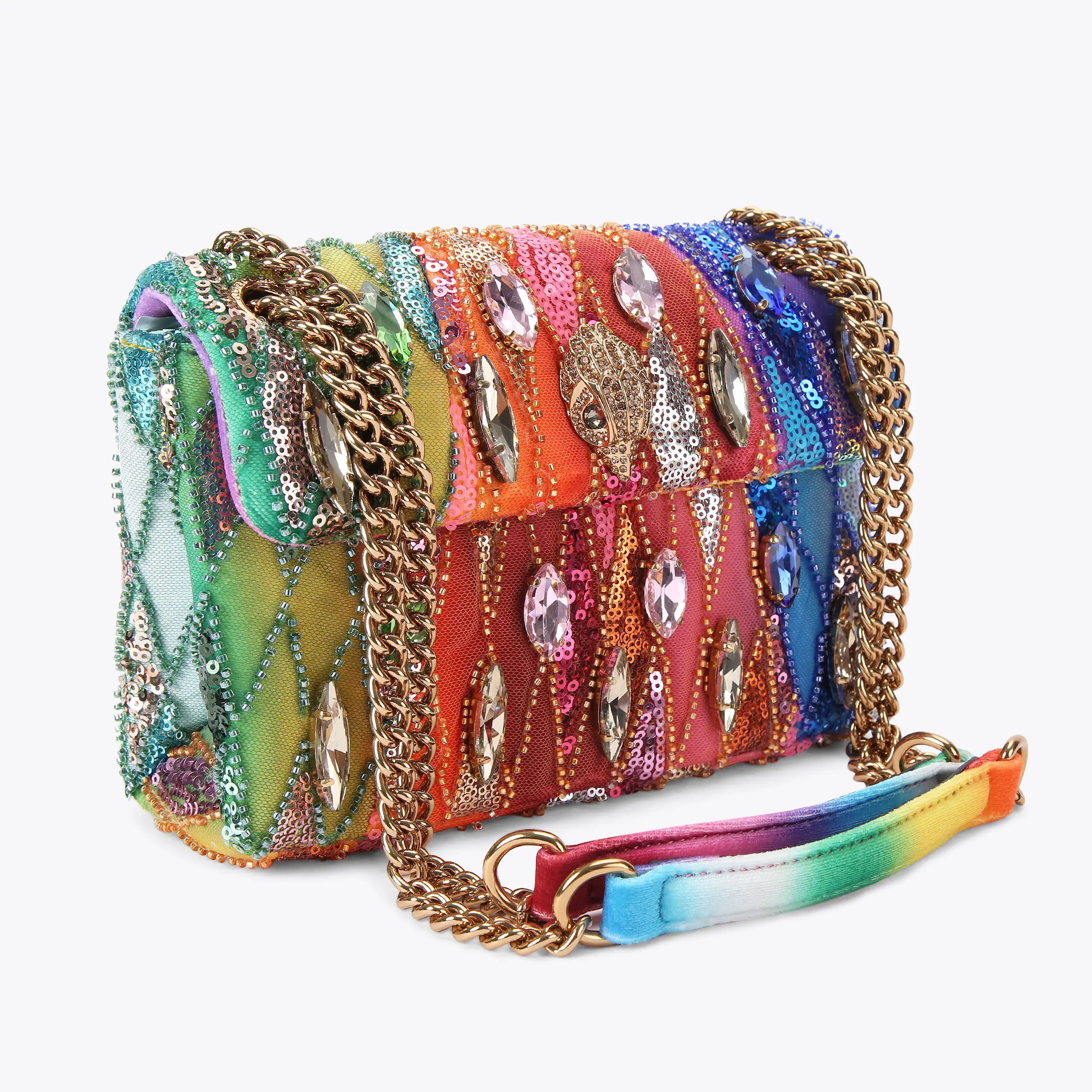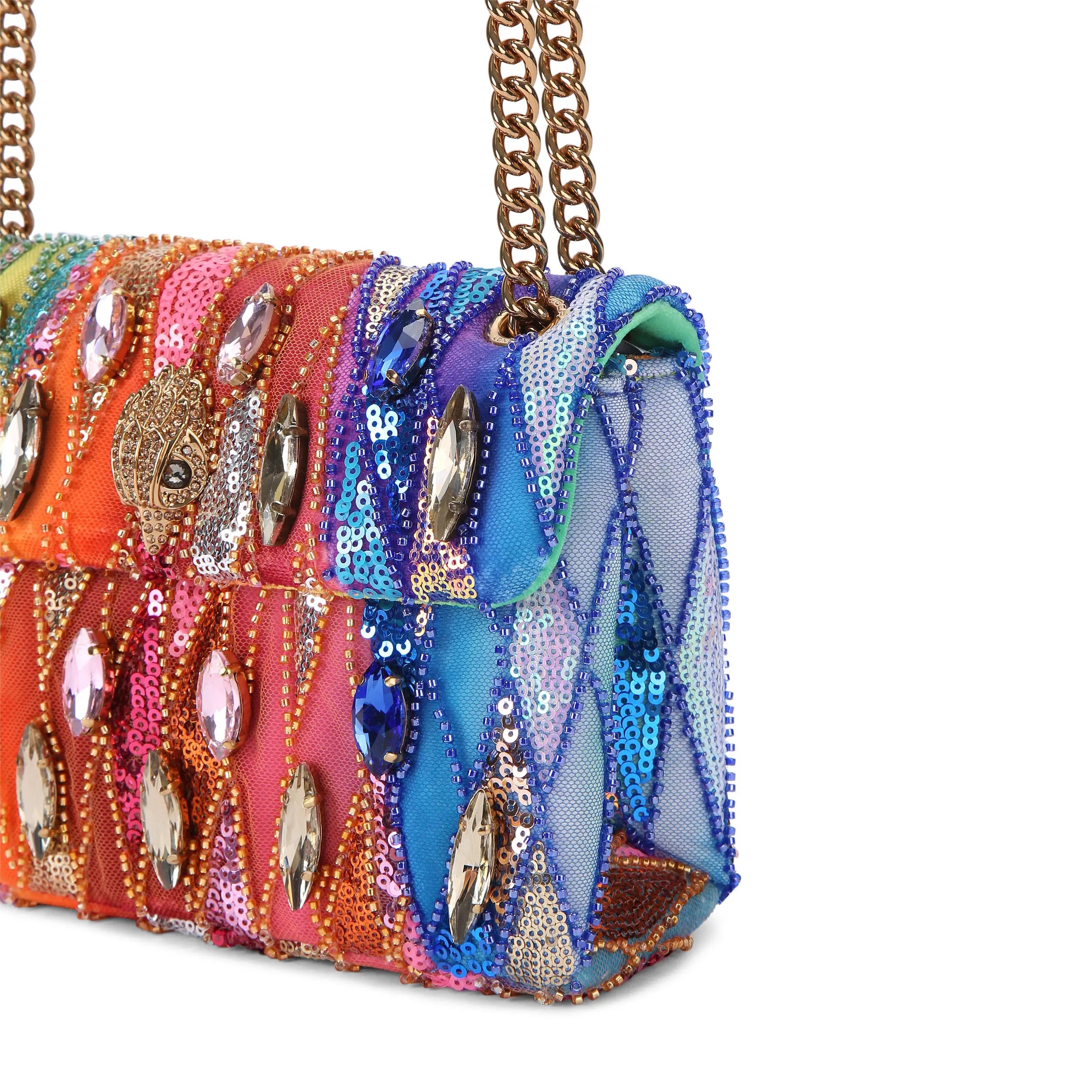 The Medium Sequin Kensington Purse is crafted in ombre mesh fabric which is embellished with sequins and beads. There are large marquise crystals across the front of the purse.