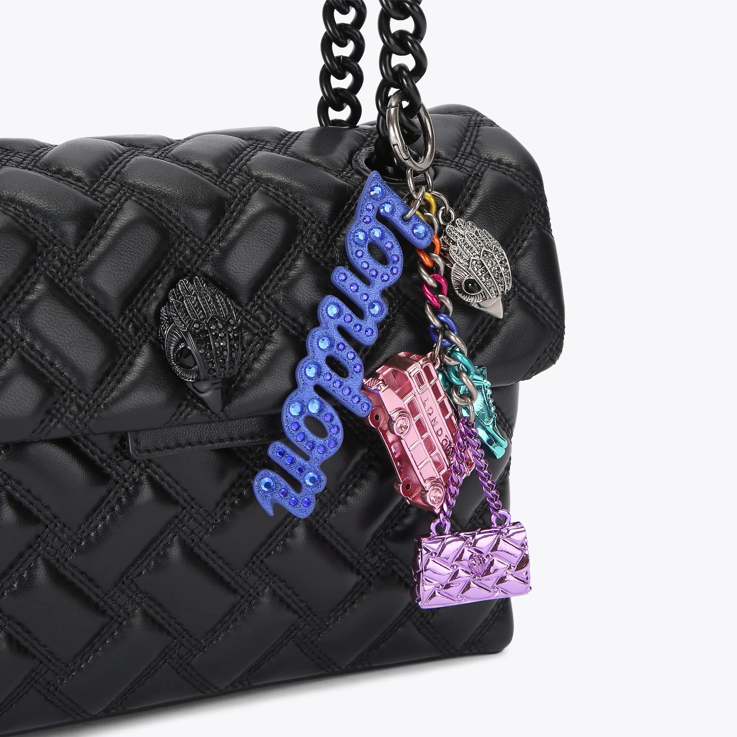 This Eagle Mix Charm Keyring comprises of an antiqued silver charm with a Southbank sneaker, London Bus and Kensington purse charm in different metallic colors. There is also a blue London cut out charm an antiqued silver eagle head attached to the keyring.