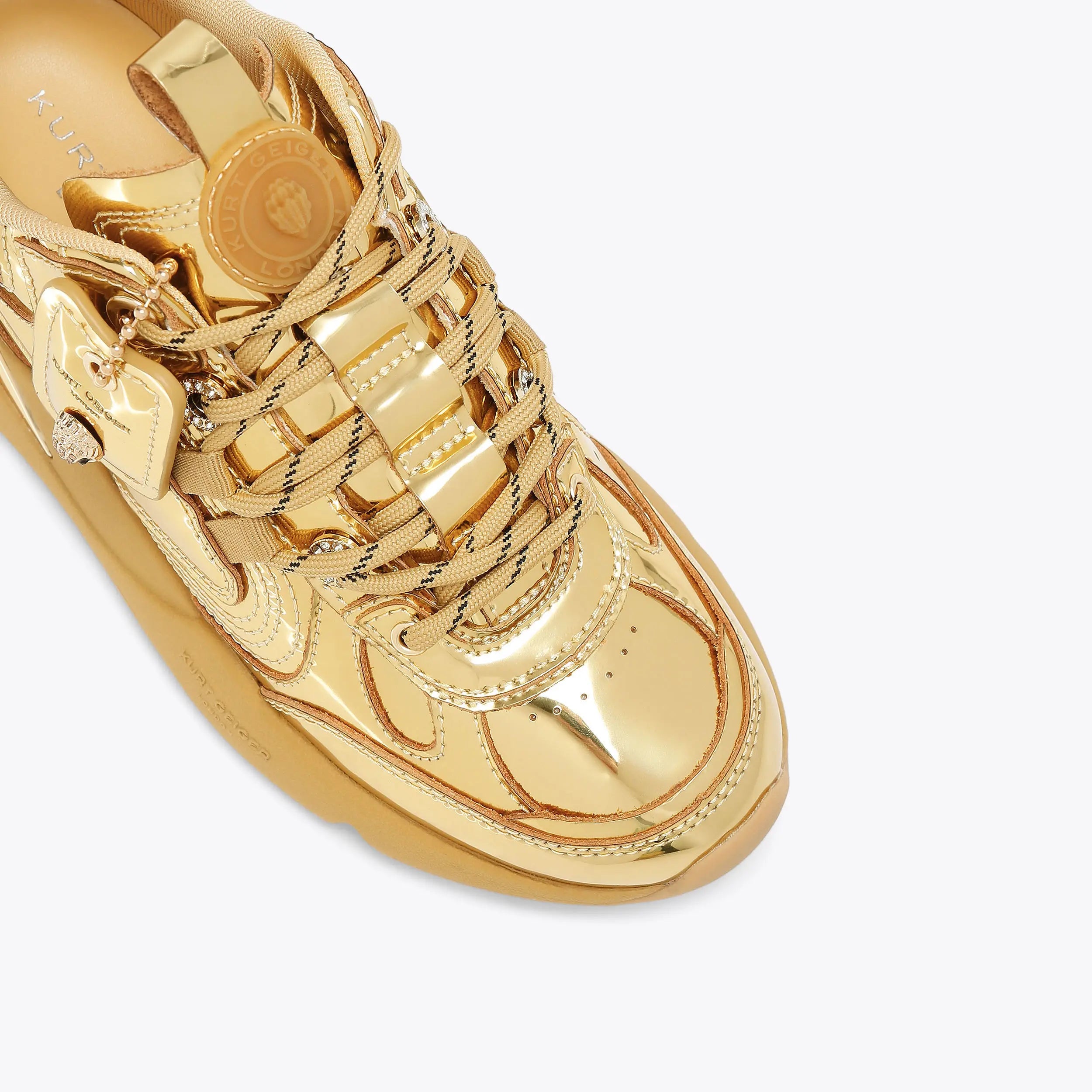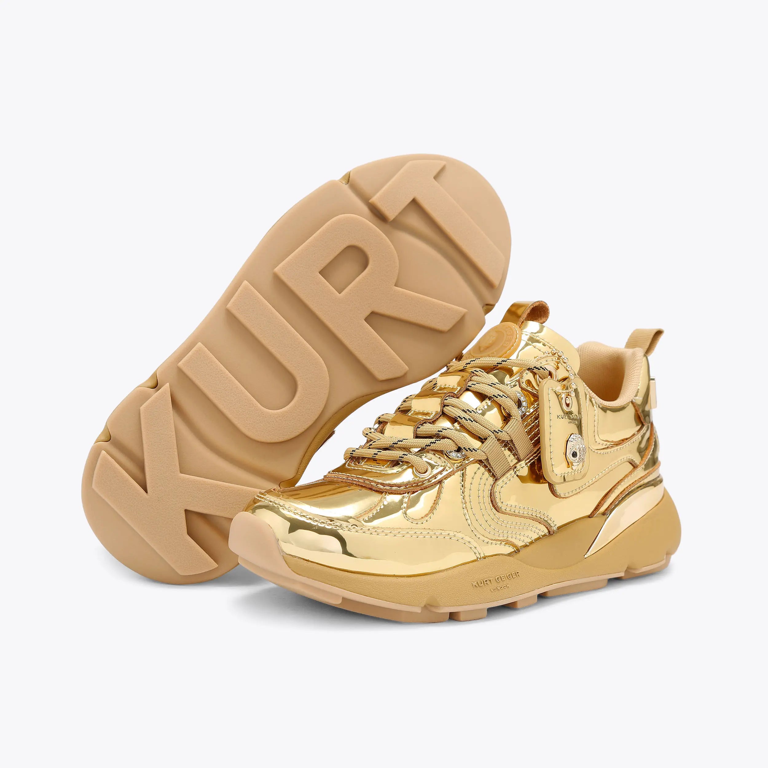 This Kurt Runner arrives with a metallic gold upper. The front is laced up with tubular laces and there is both a rubber round patch on the tongue and tag through one of the top eyelets.