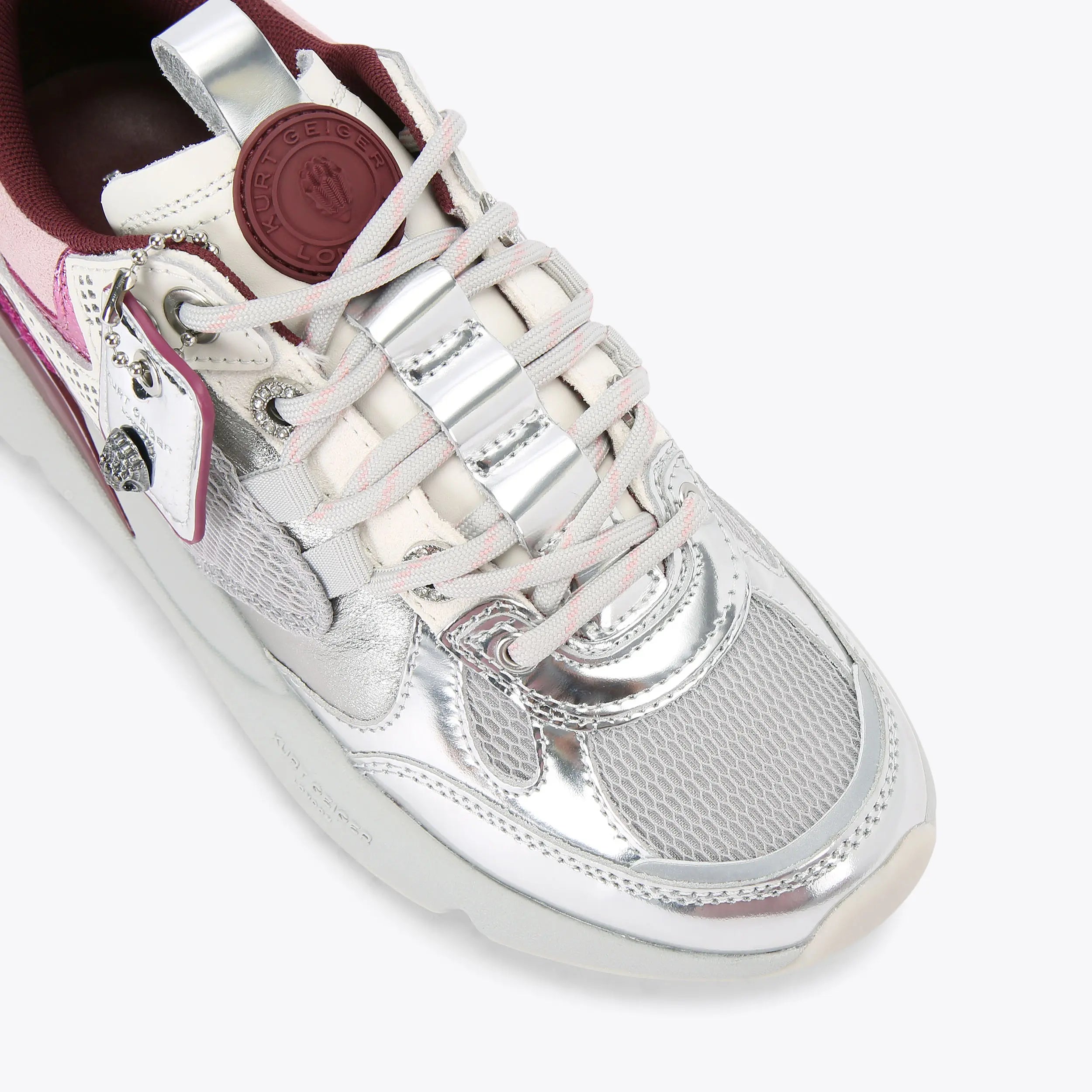 This Kurt Runner arrives in a silver and fuchsia mesh and leather. The front is laced up with tubular laces and there is both a rubber round patch on the tongue and metallic tag through one of the top eyelets.