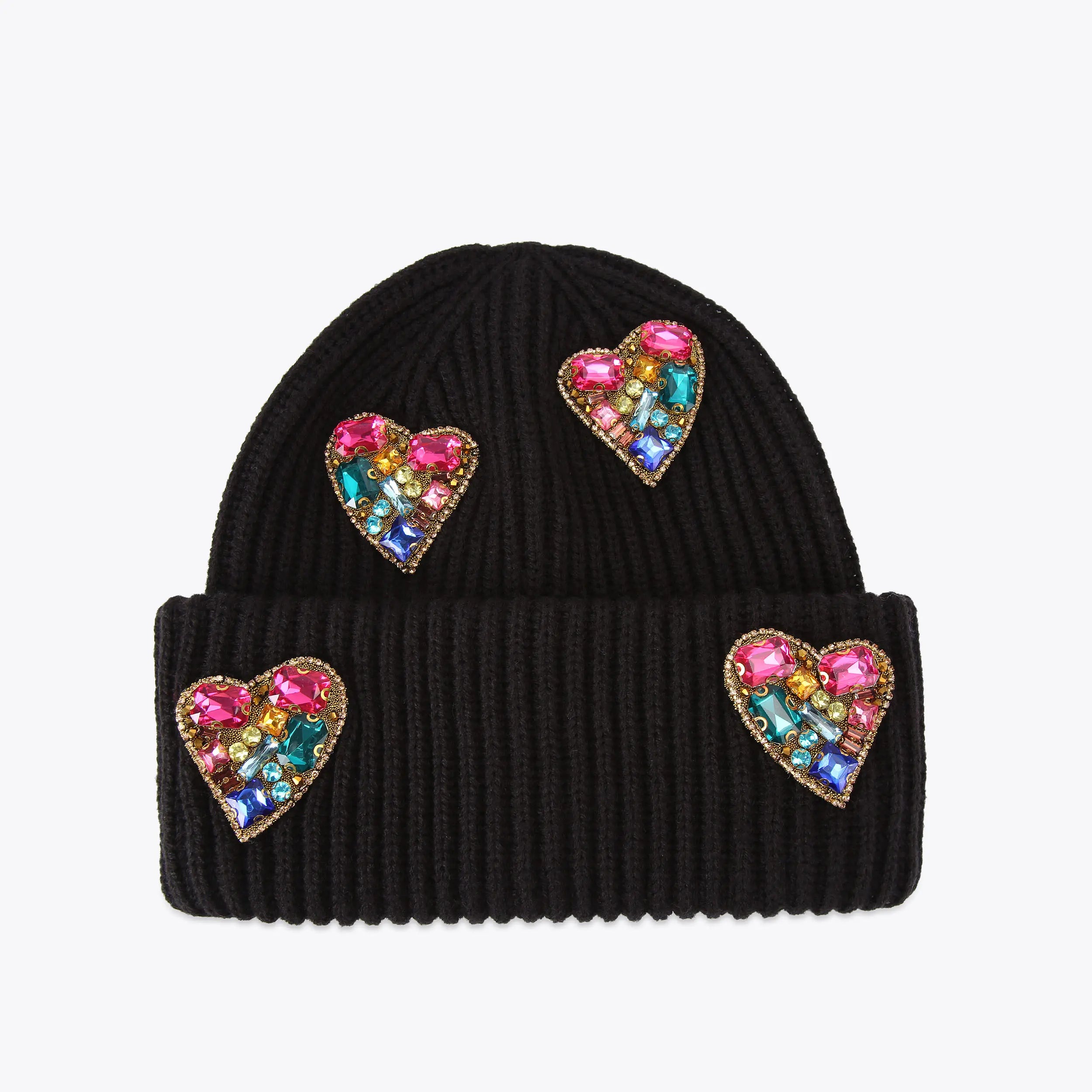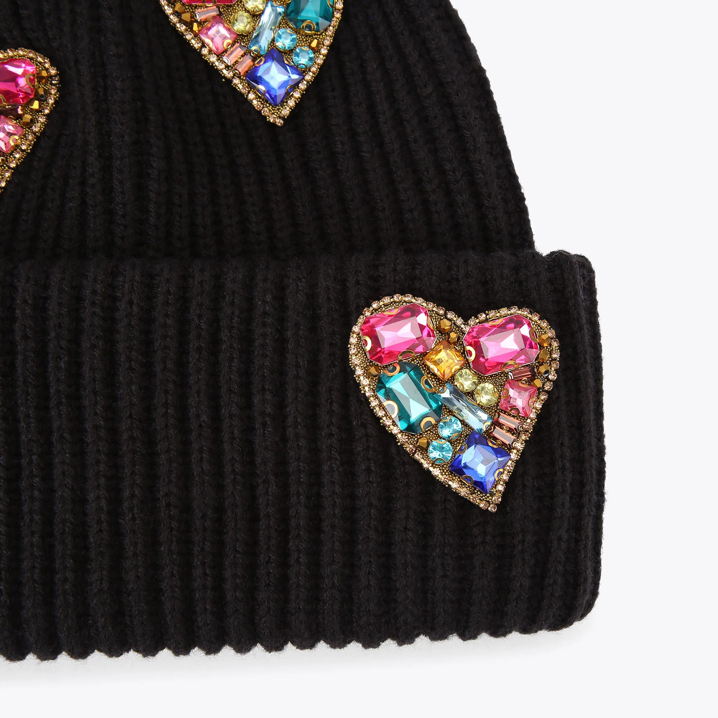 The Heart Gem Beanie features a black knitted design with large roll up. There are multi-color crystals in each beaded heart motif around the beanie hat.