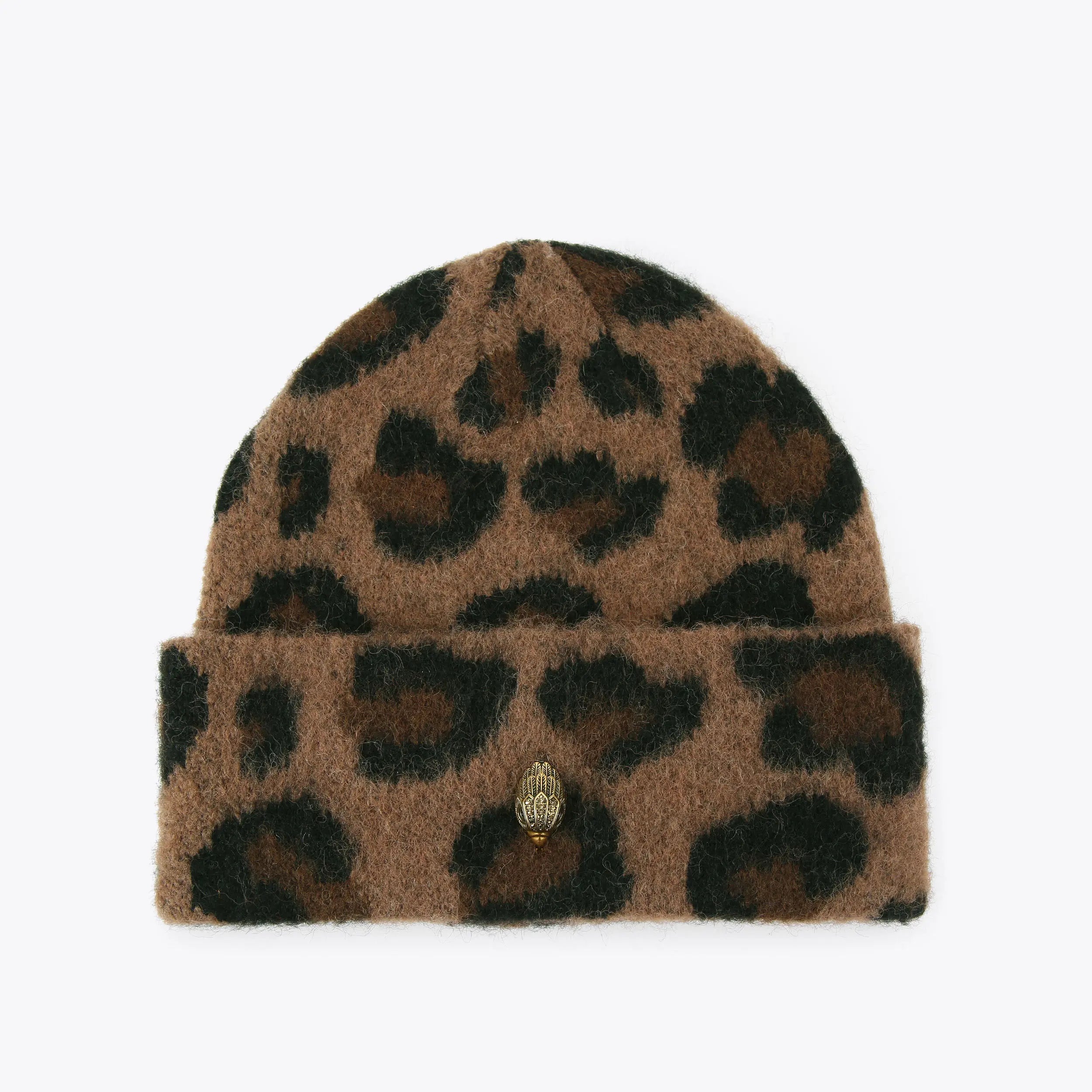This Leopard Beanie hat is in a knitted leopard printed fabric. There is an antiqued brass eagle head sat to the front of the hat.