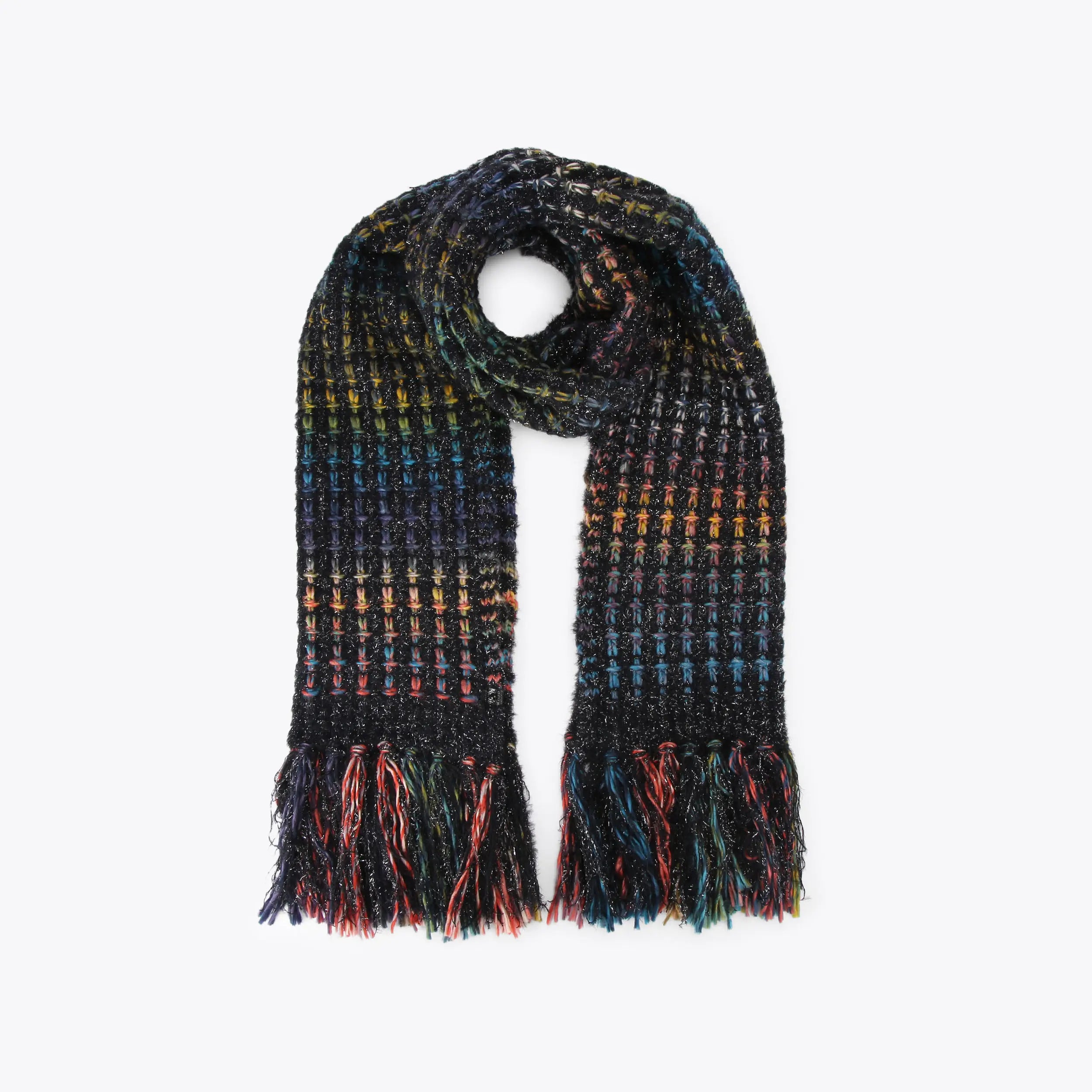 The Lurex Knit Scarf arrives in a black knitted style with multi-color thread running through. There is a micro black eagle head trim at one end of the scarf.