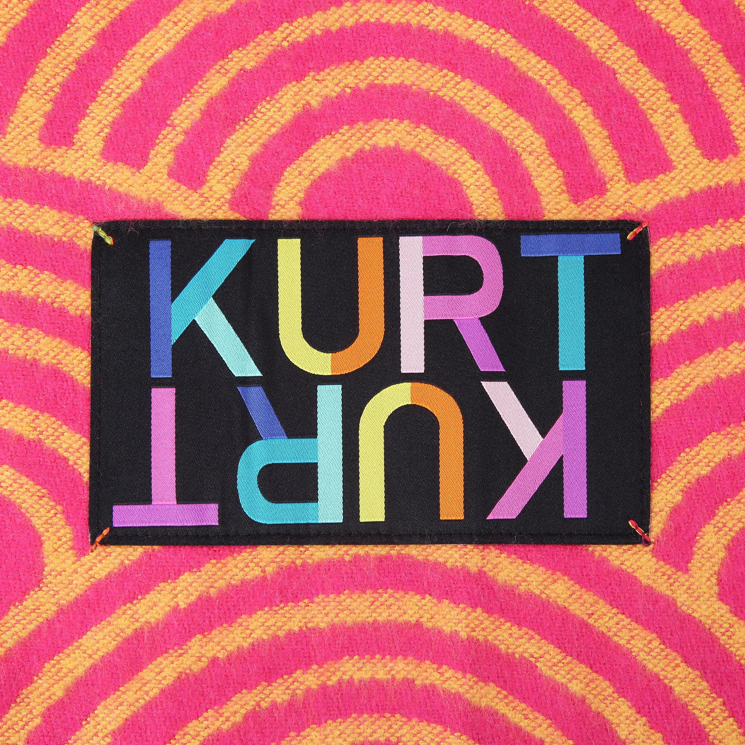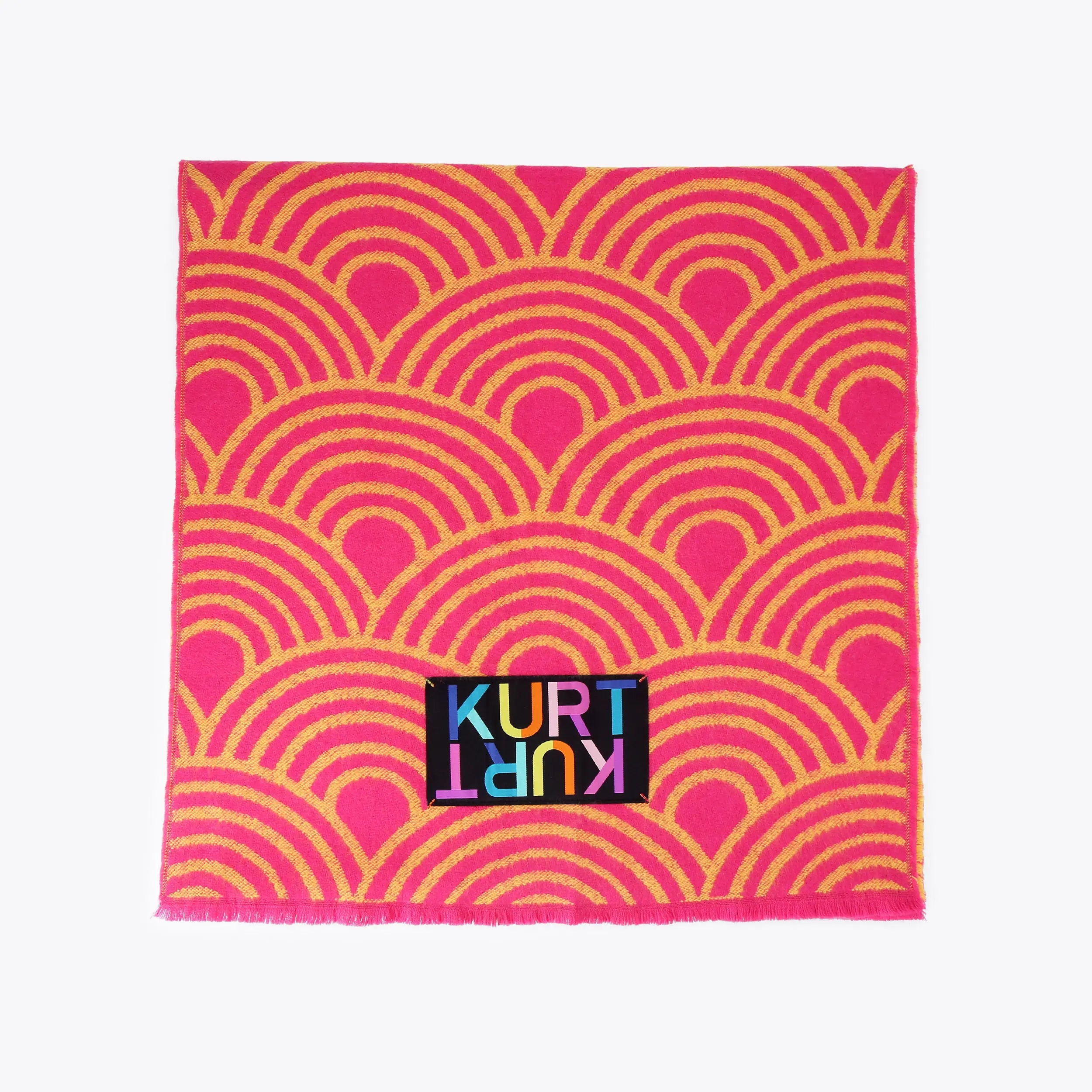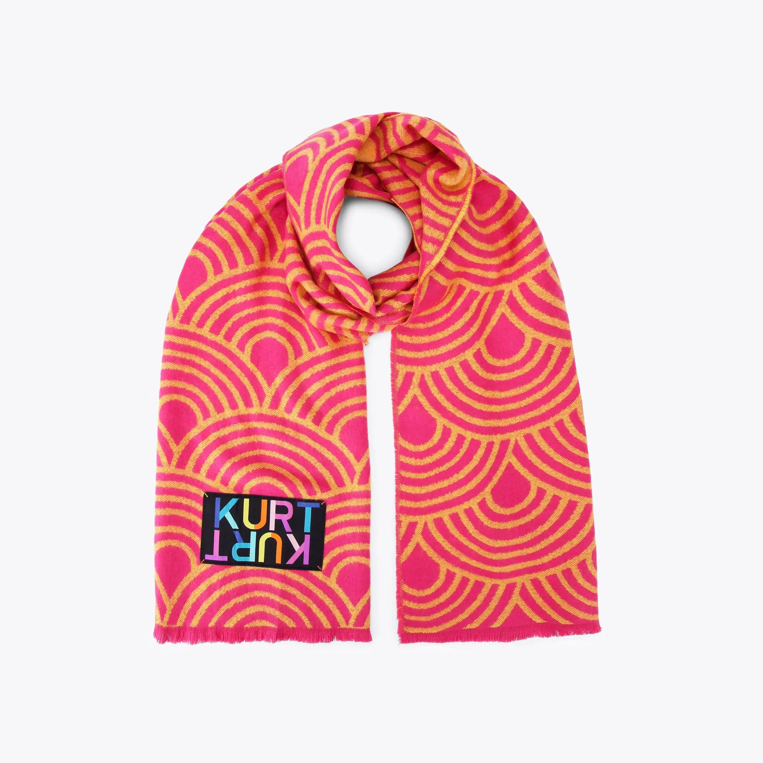This Southbank Scarf is crafted from a soft pink and yellow fabric in a large outline rainbow print. There is a statement embroidered branded patch at one end of the scarf.