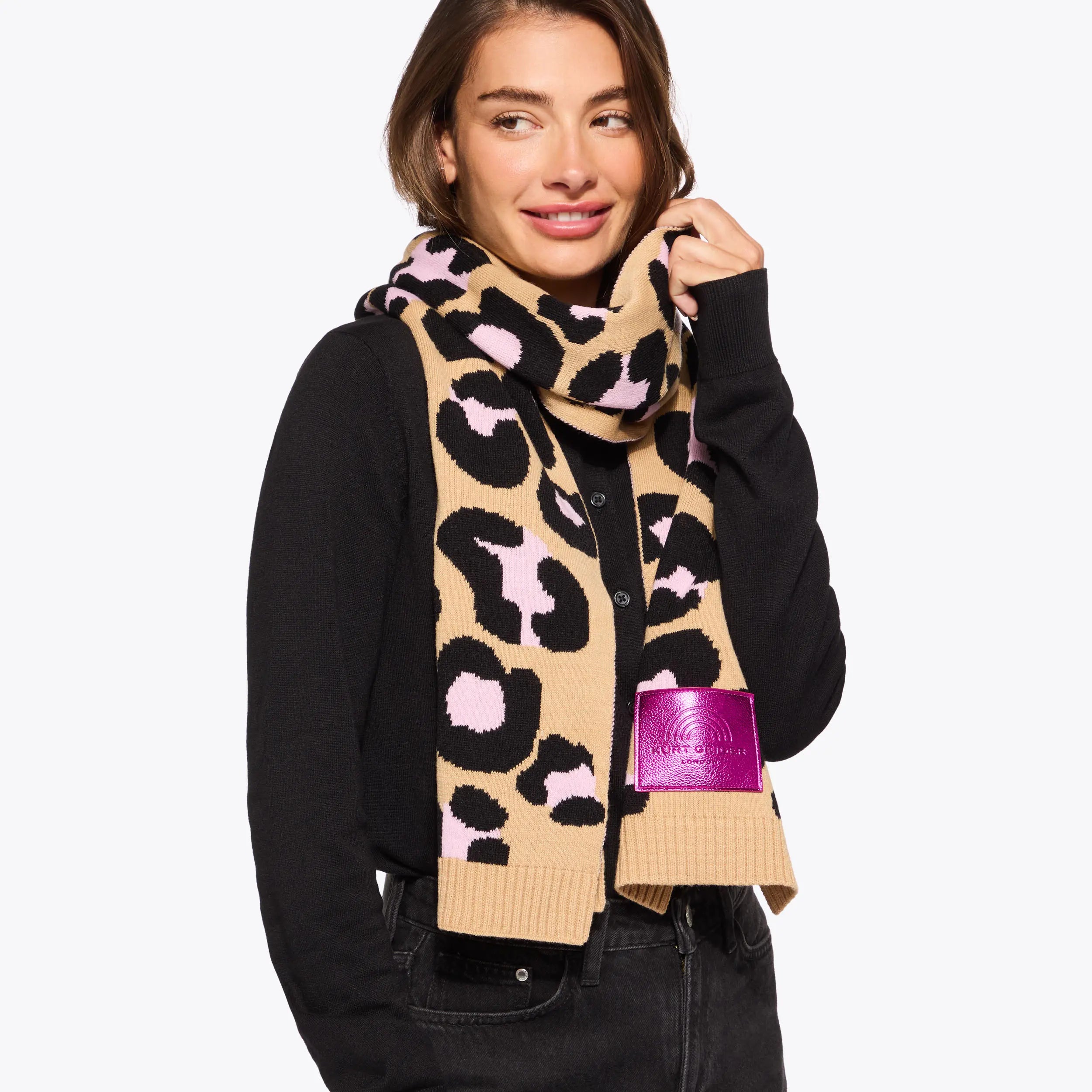 This Small Southbank Scarf features from a pale leopard printed design. There is a statement metallic pink embroidered branded patch at one end of the scarf.