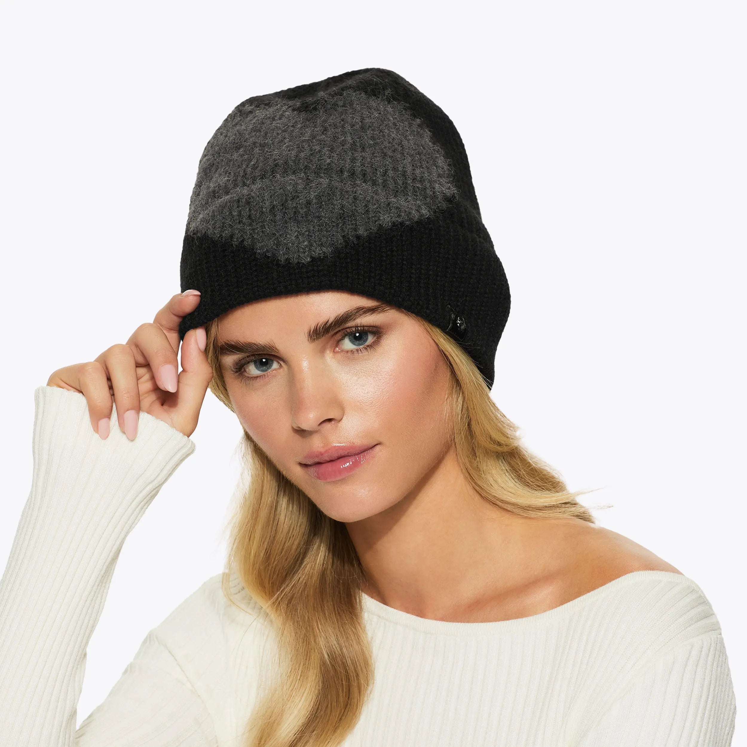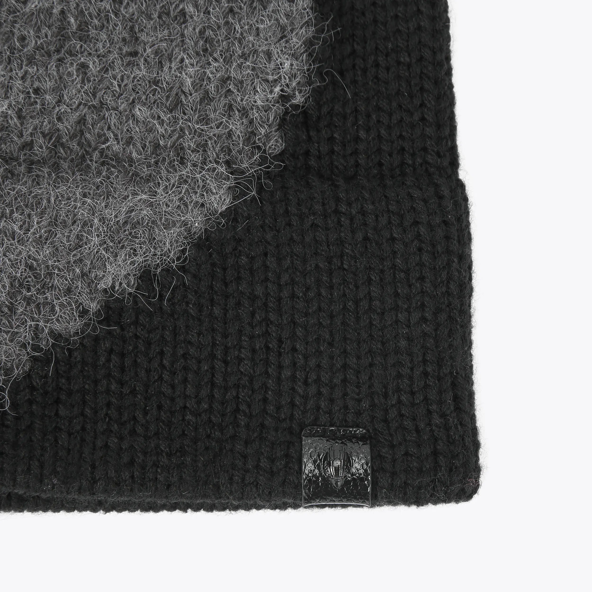 This Anastasia Heart Beanie features a black knitted exterior with a grey heart design. There is a small metallic gold trim with micro antiqued brass eagle head to be worn to the left.