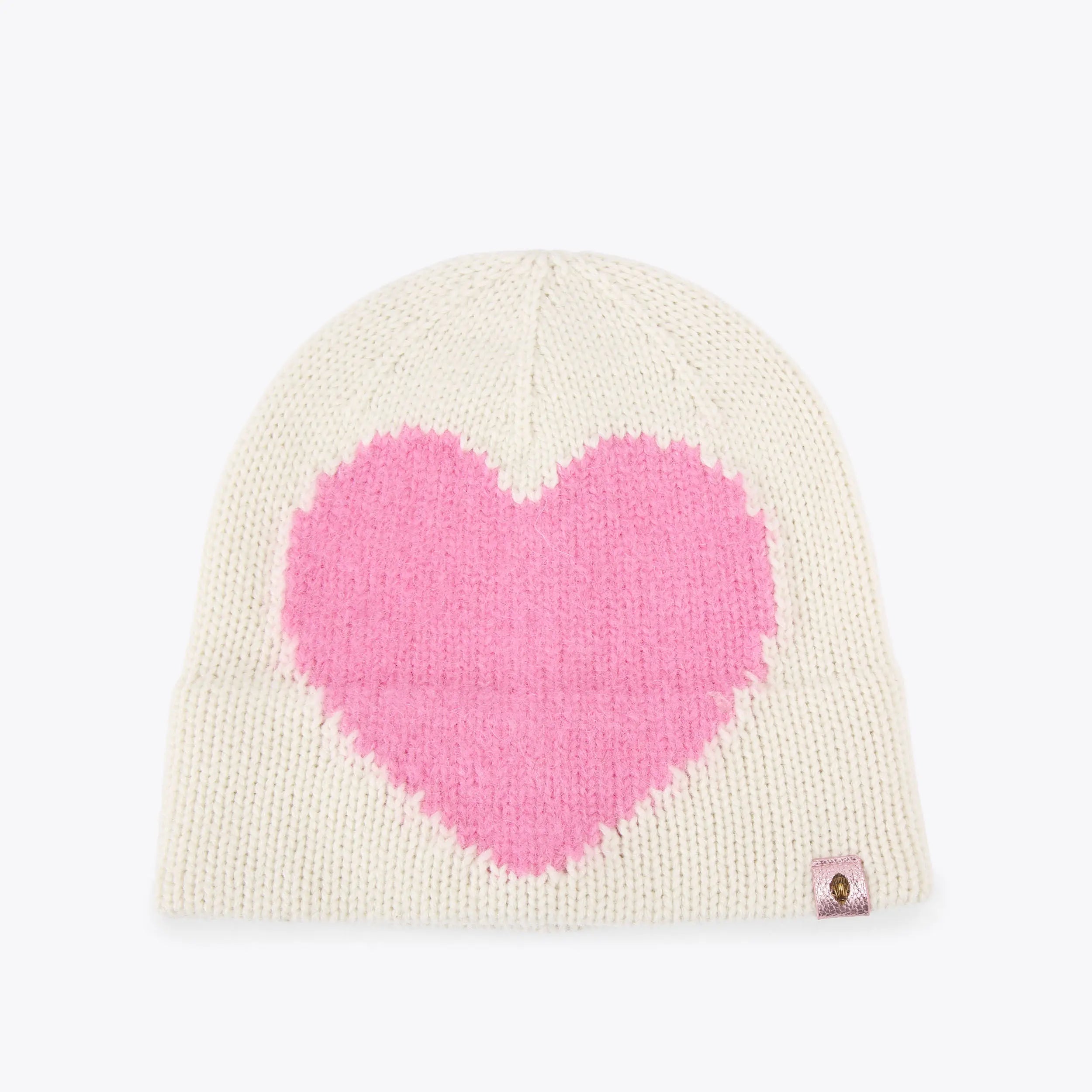 This Anastasia Heart Beanie features a bone knitted exterior with a pink heart design. There is a small metallic pink trim with micro antiqued brass eagle head to be worn to the left.