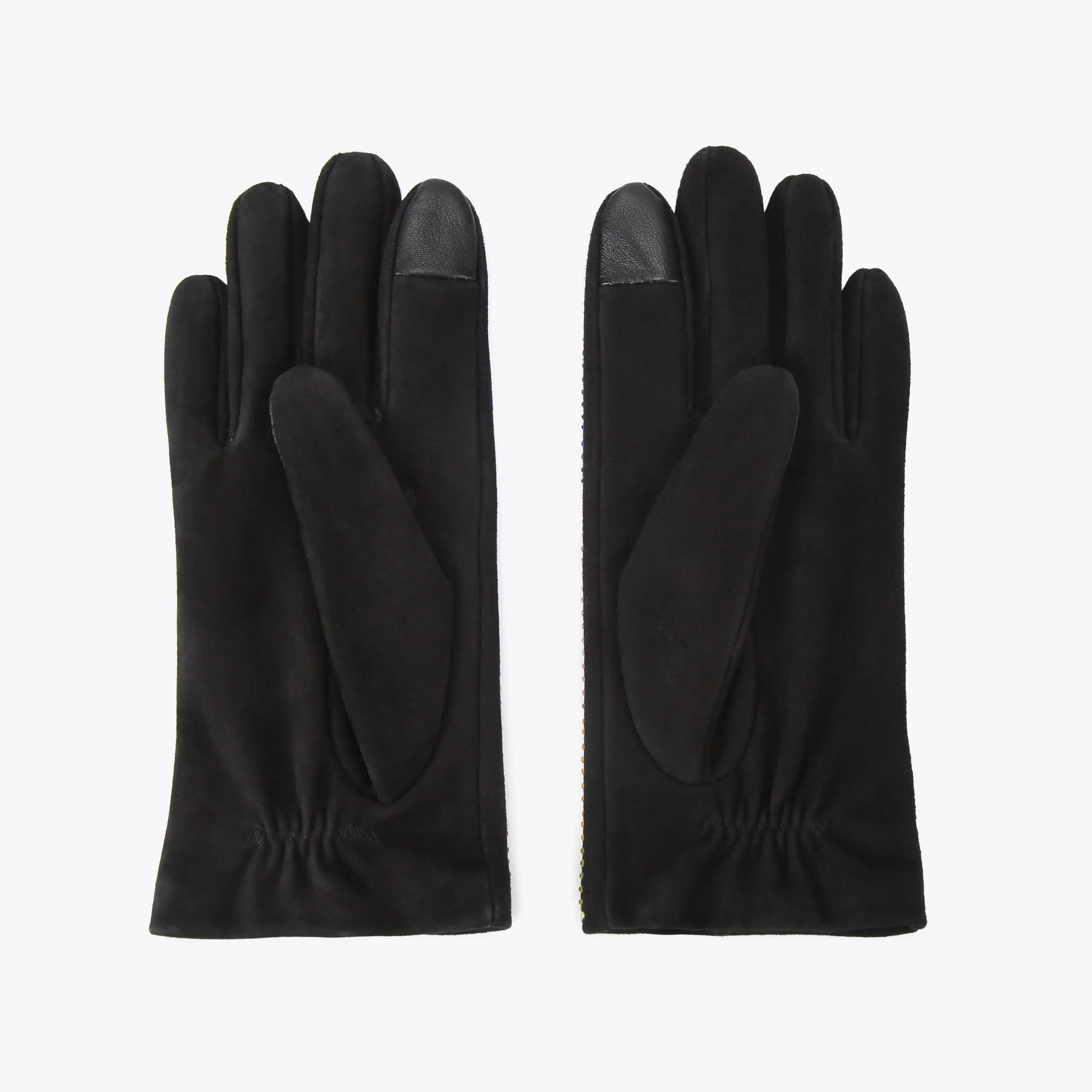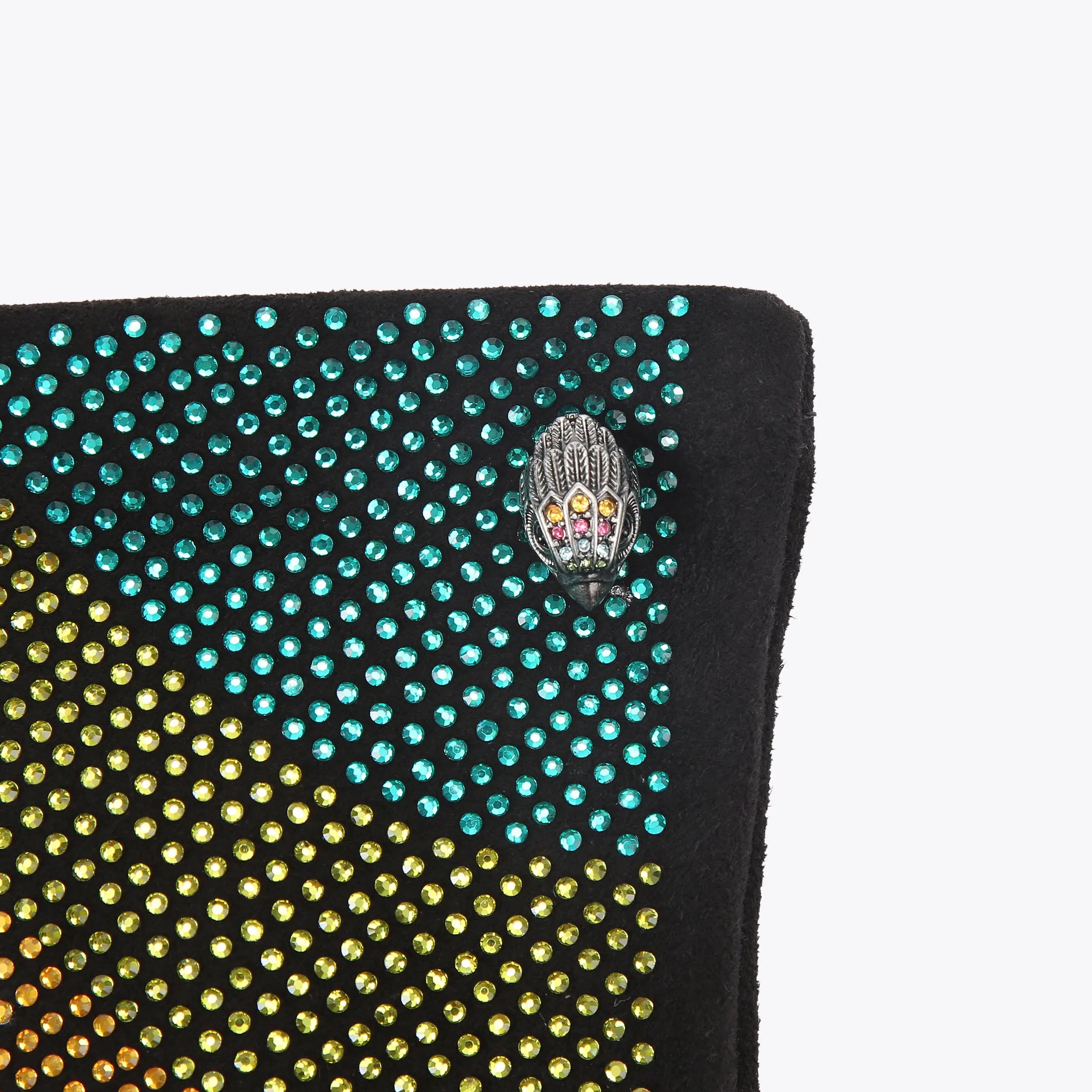 The Kensington Crystal Gloves arrive in black suede leather with crystal embellishment creating the Kensington rainbow stripe. A small antiqued silver eagle head is seen on the left glove.
