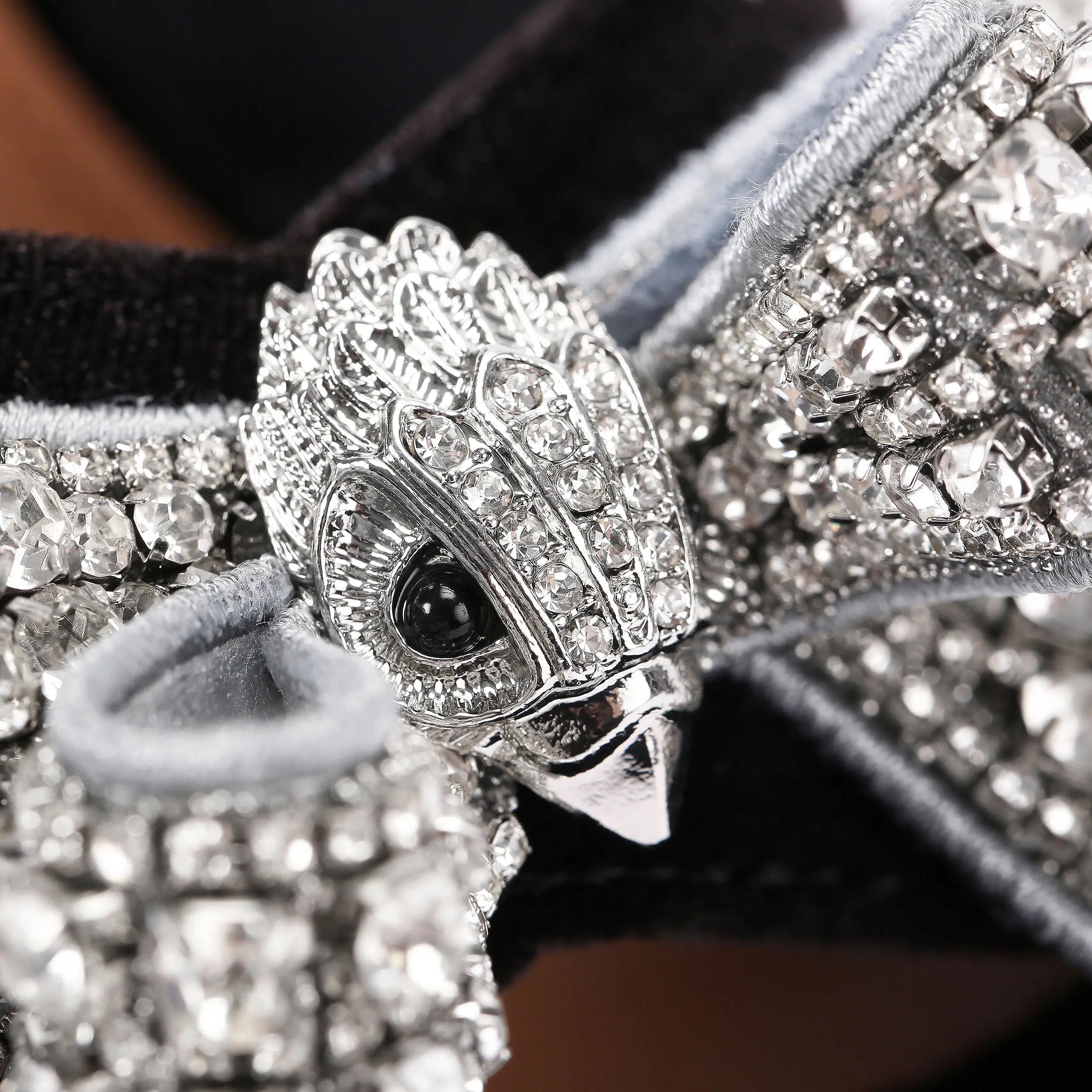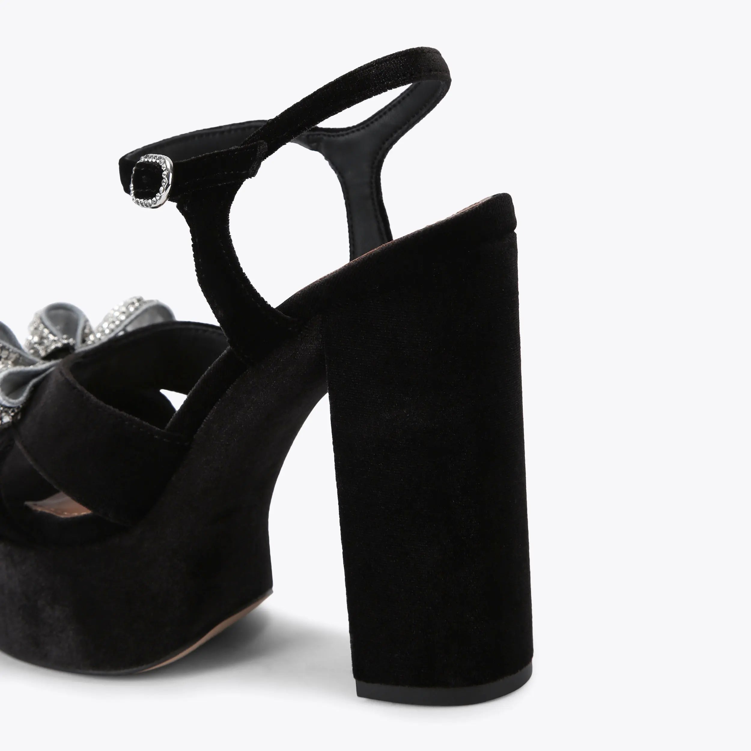 The Kensington Platform Sandal features a black velvet fabric upper with a statement crystal bow sat on the cut out strap. There is a silver eagle head with crystals sat on top of the toe strap.