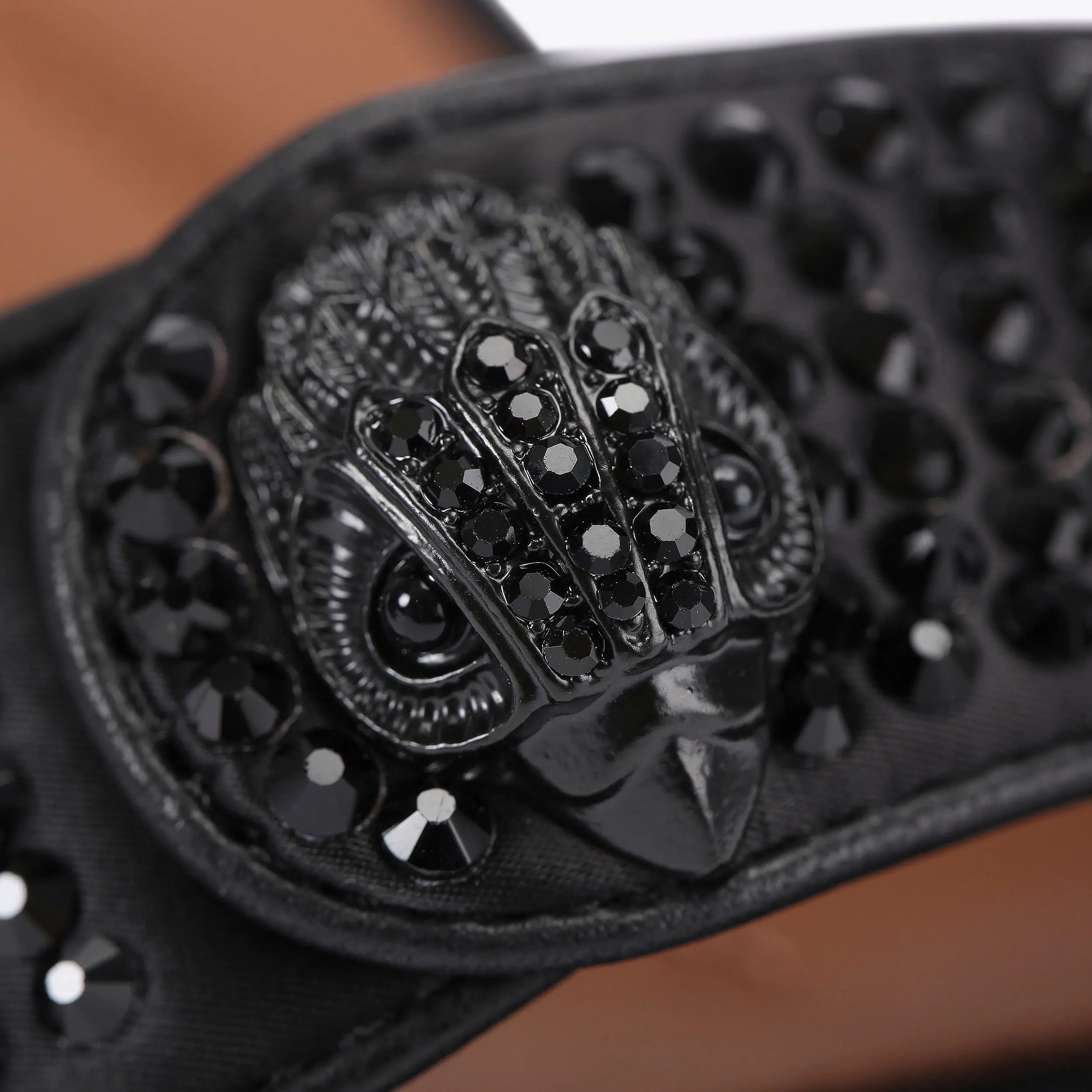 The Kensington Langley sandal arrives in a black crystal embellished satin with adjustable ankle strap. The toe strap is topped with a black eagle head.