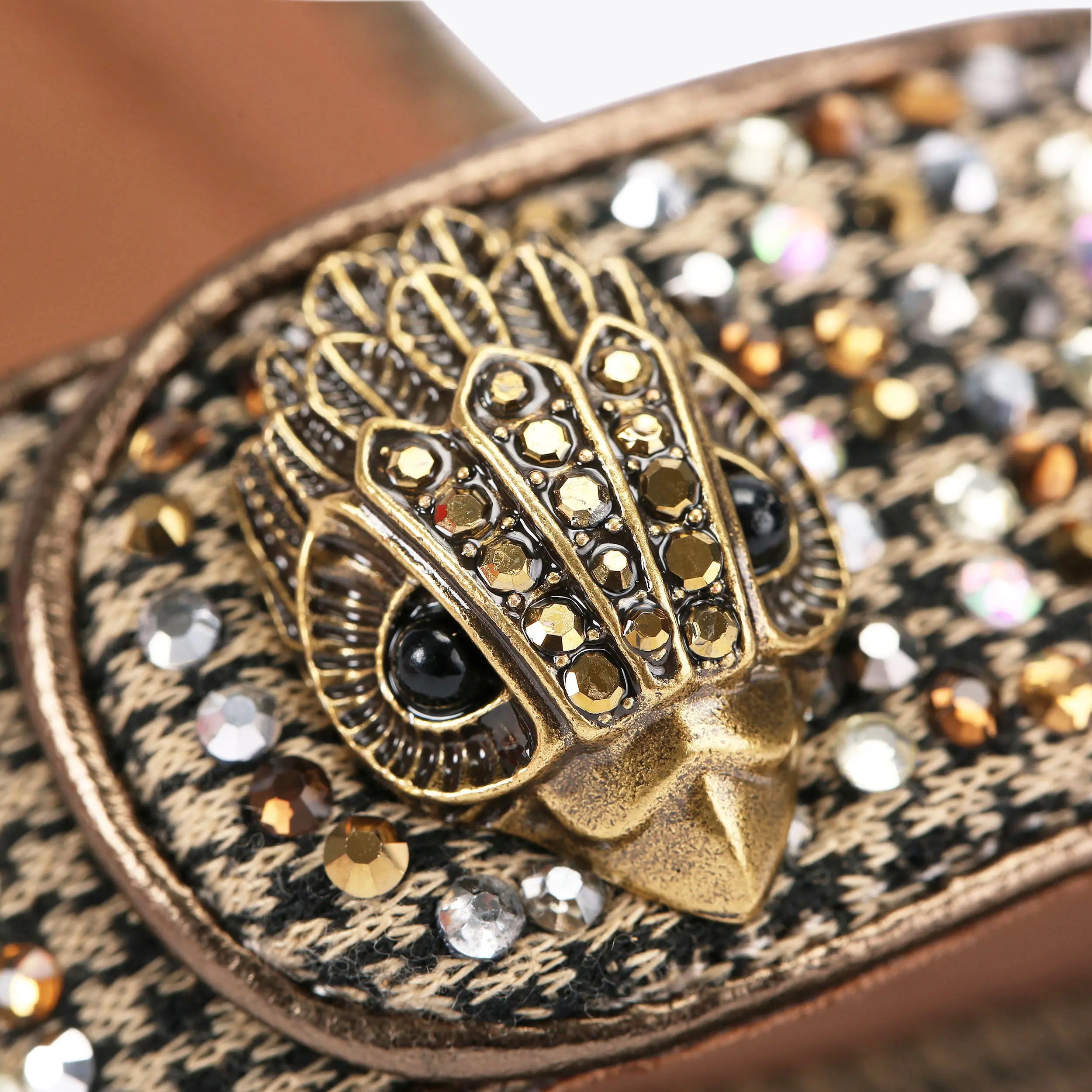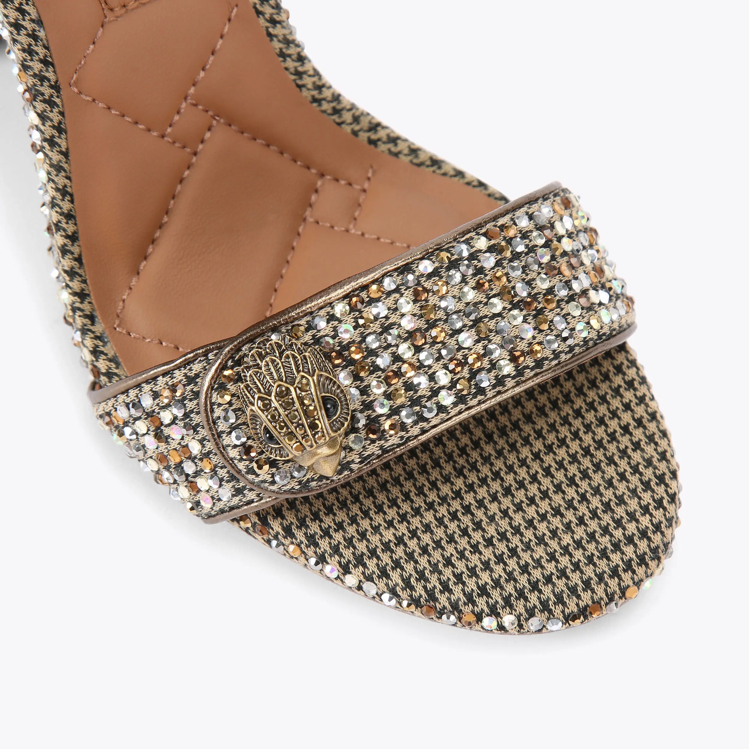 The Kensington Langley sandal arrives in a beige houndstooth fabric with adjustable ankle strap. The toe strap is topped with an antiqued brass eagle head.