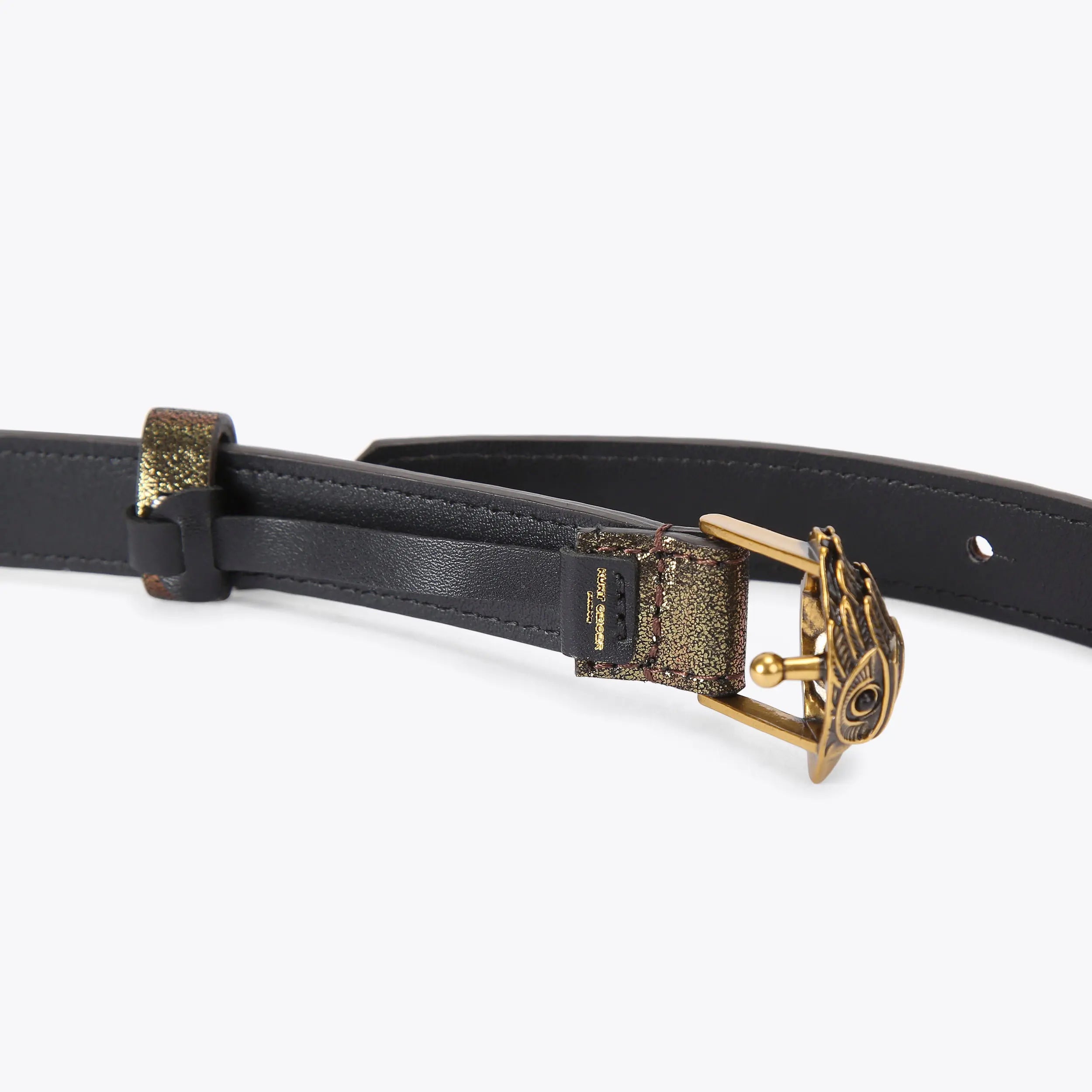 This 20 Eagle Belt features a striped suede belt. The antiqued brass eagle head features crystals and fastens the belt.