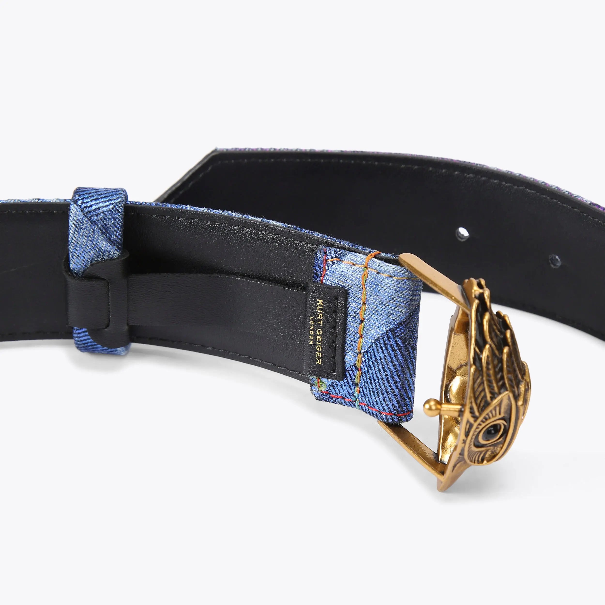 This Kensington 38 Belt features a rainbow ombre denim weave effect on the strap. The antiqued brass eagle head features rainbow crystals and fastens the belt.