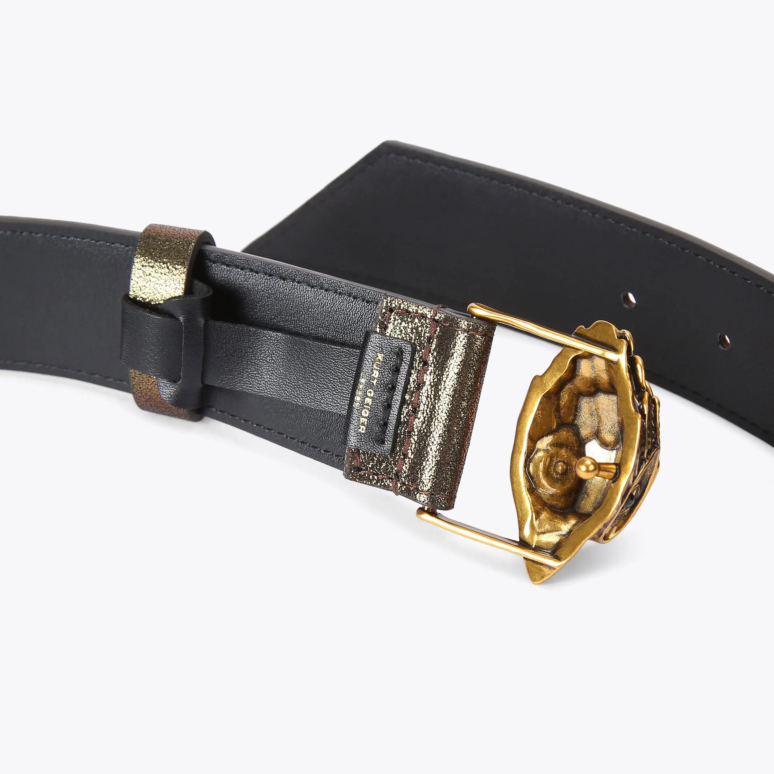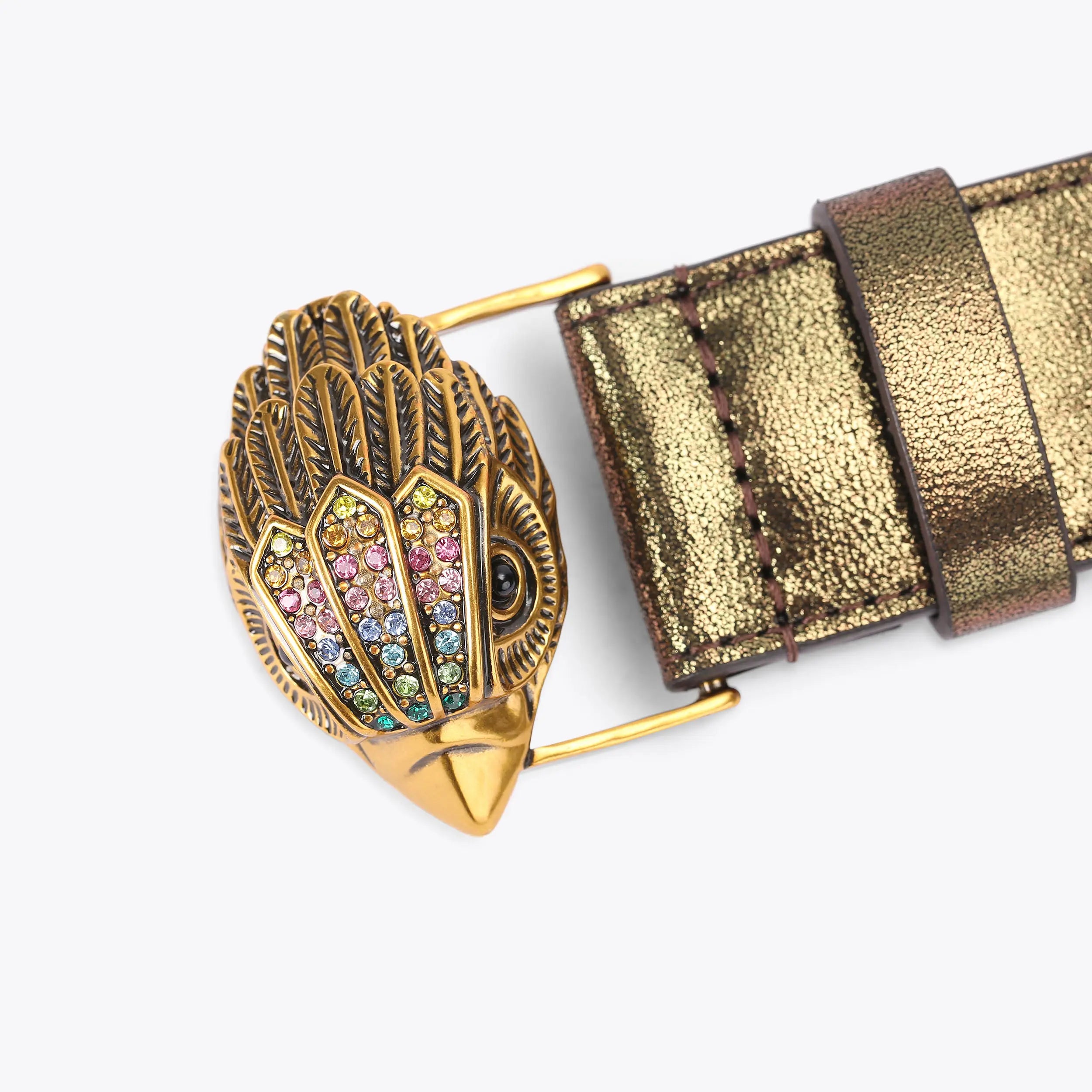 This Kensington 38 Belt features a striped exterior comprising of different textures. The antiqued brass eagle head features rainbow crystals and fastens the belt.