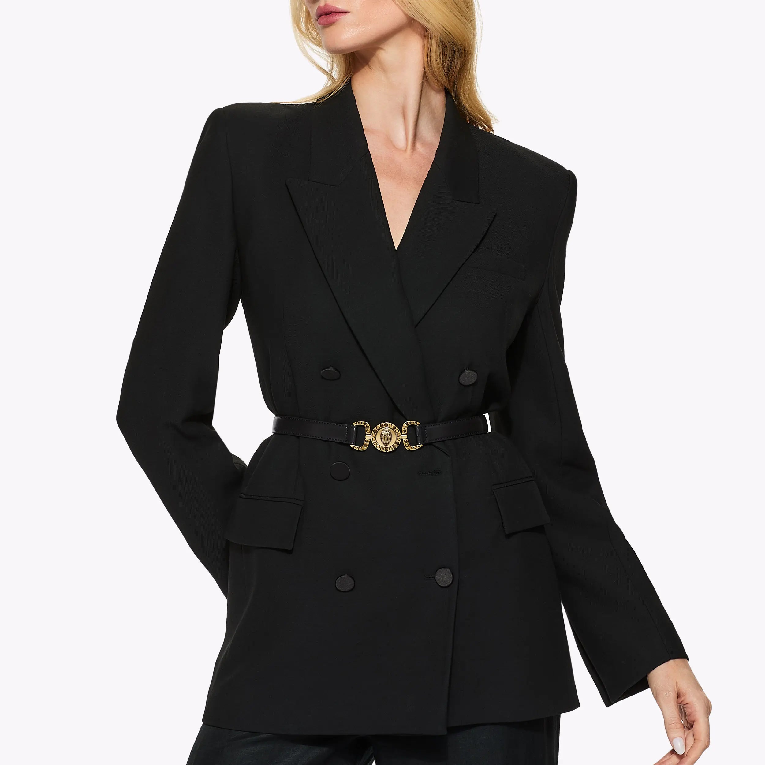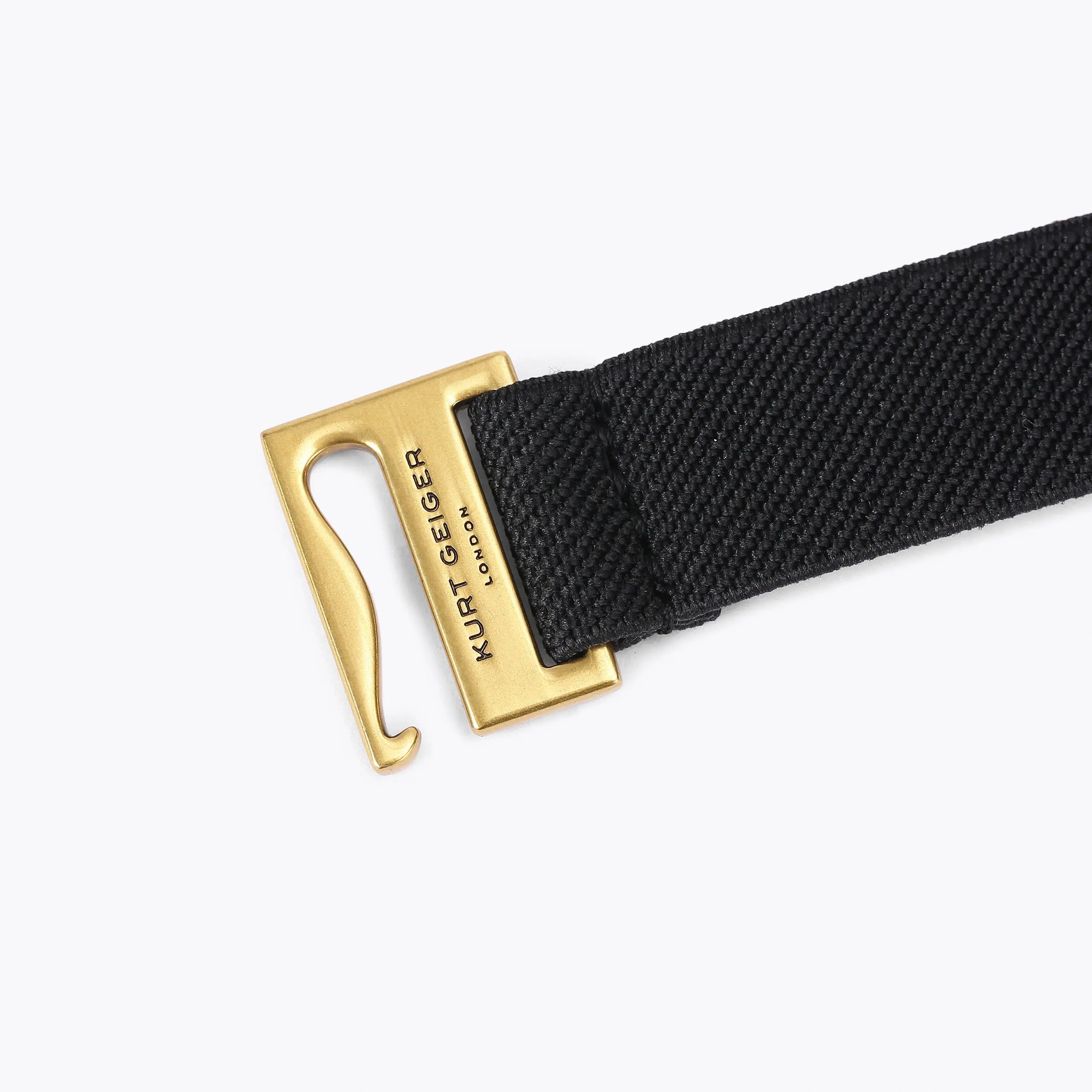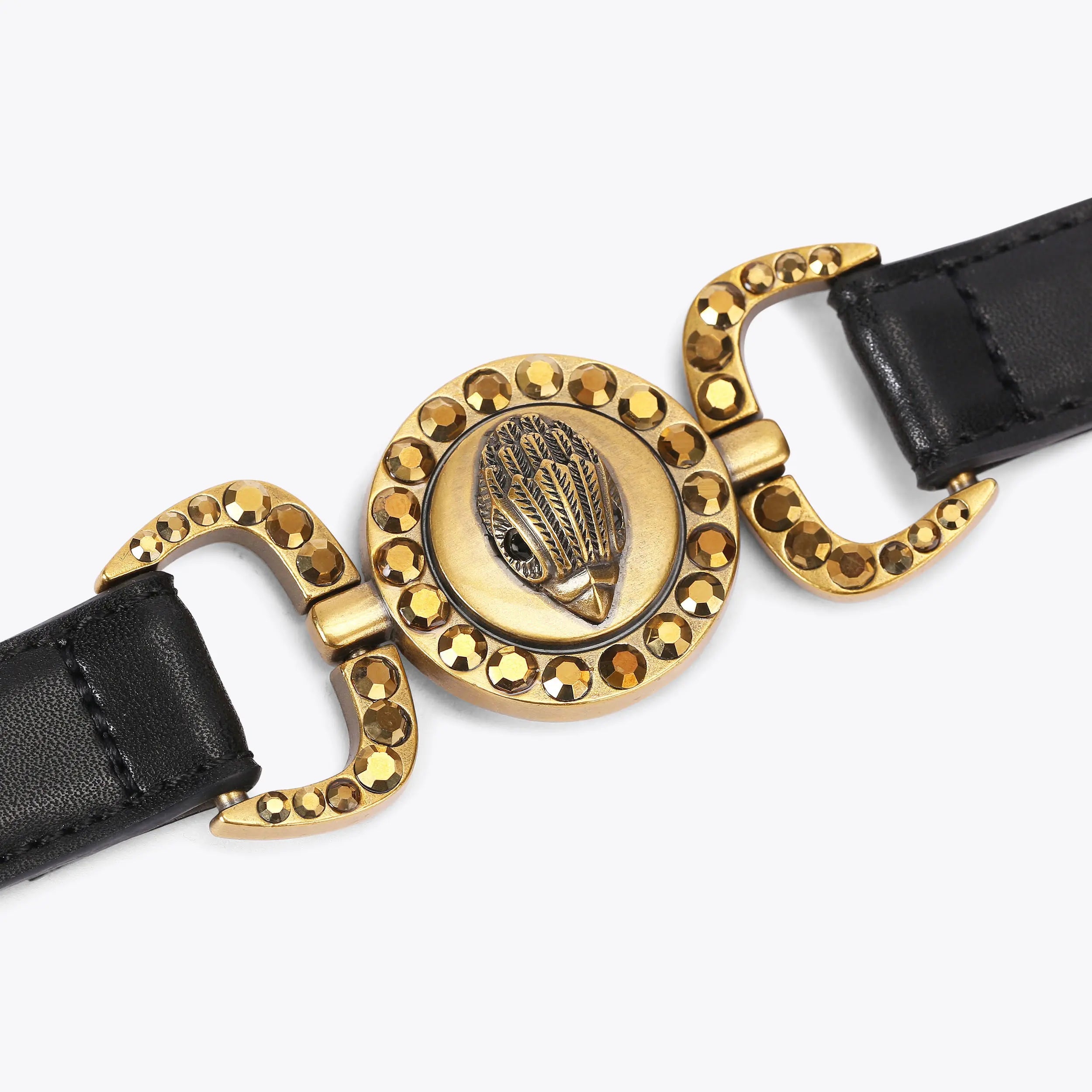 The Mansion belt is crafted from a soft black leather. There is an antiqued brass chain detail with eagle head at the centre to be worn to the front.