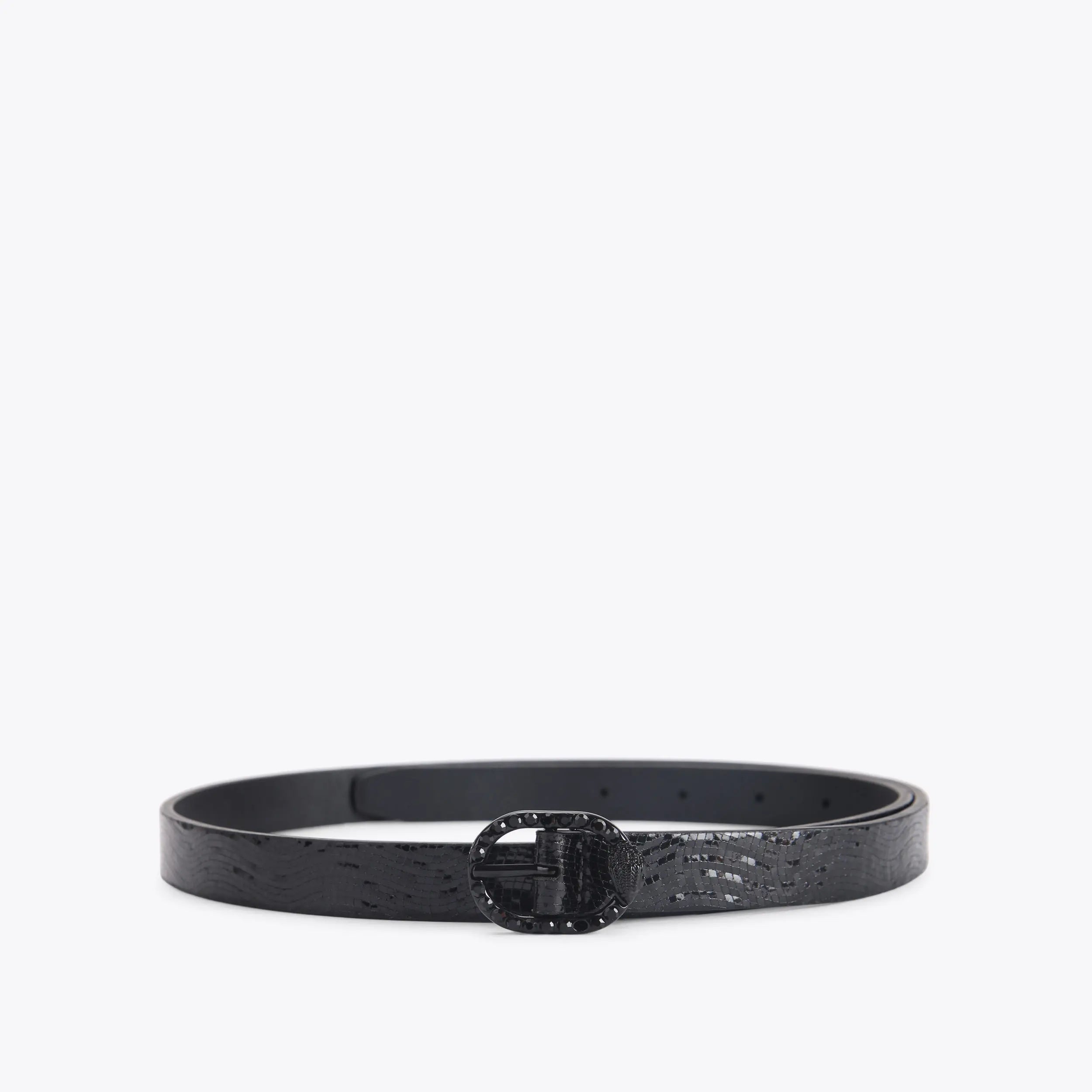 This Mayfair Belt features a black textured leather belt. There is a black metal eagle head sat to the left of a buckle.