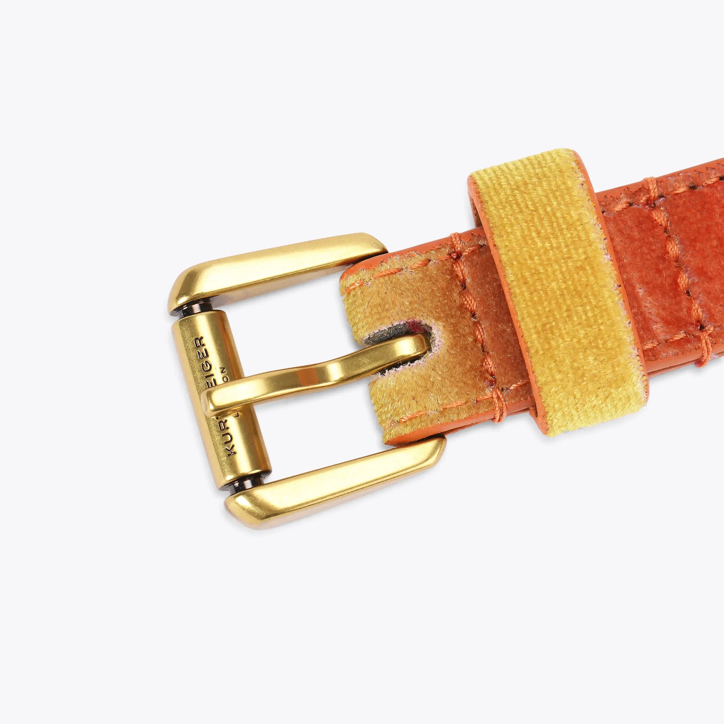 This Octavia Belt is crafted from an ombre velvet. The strap features multiple crystal and heart studs and an antiqued brass belt buckle.